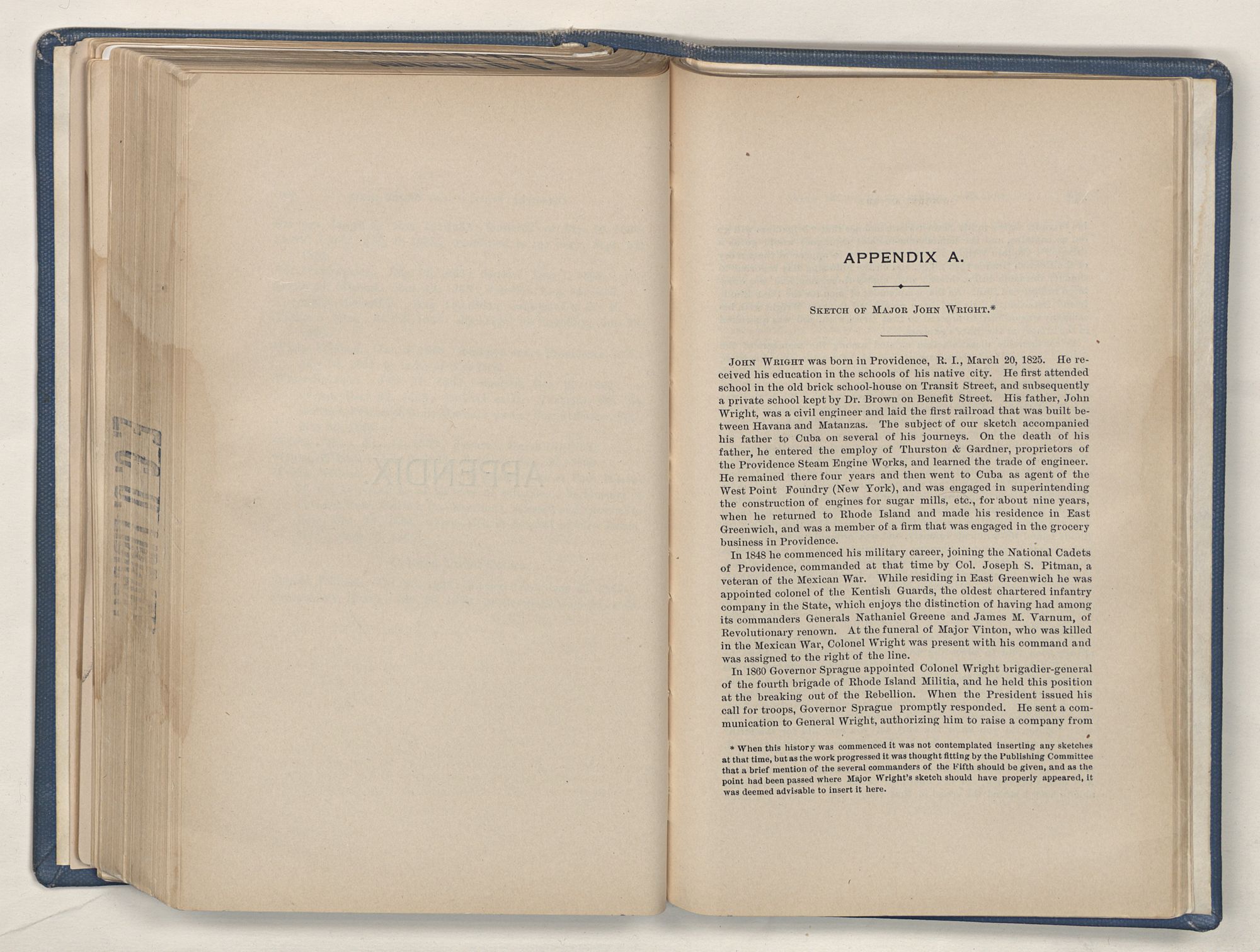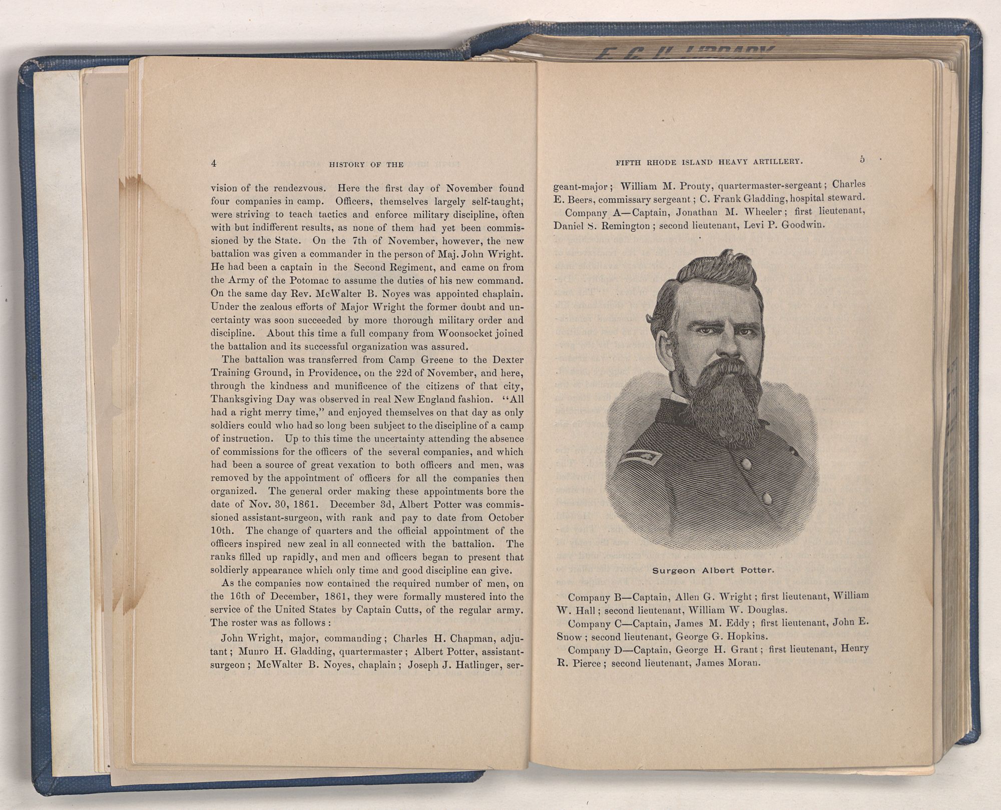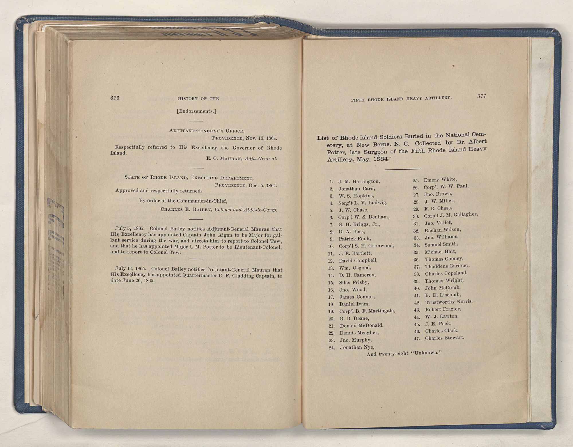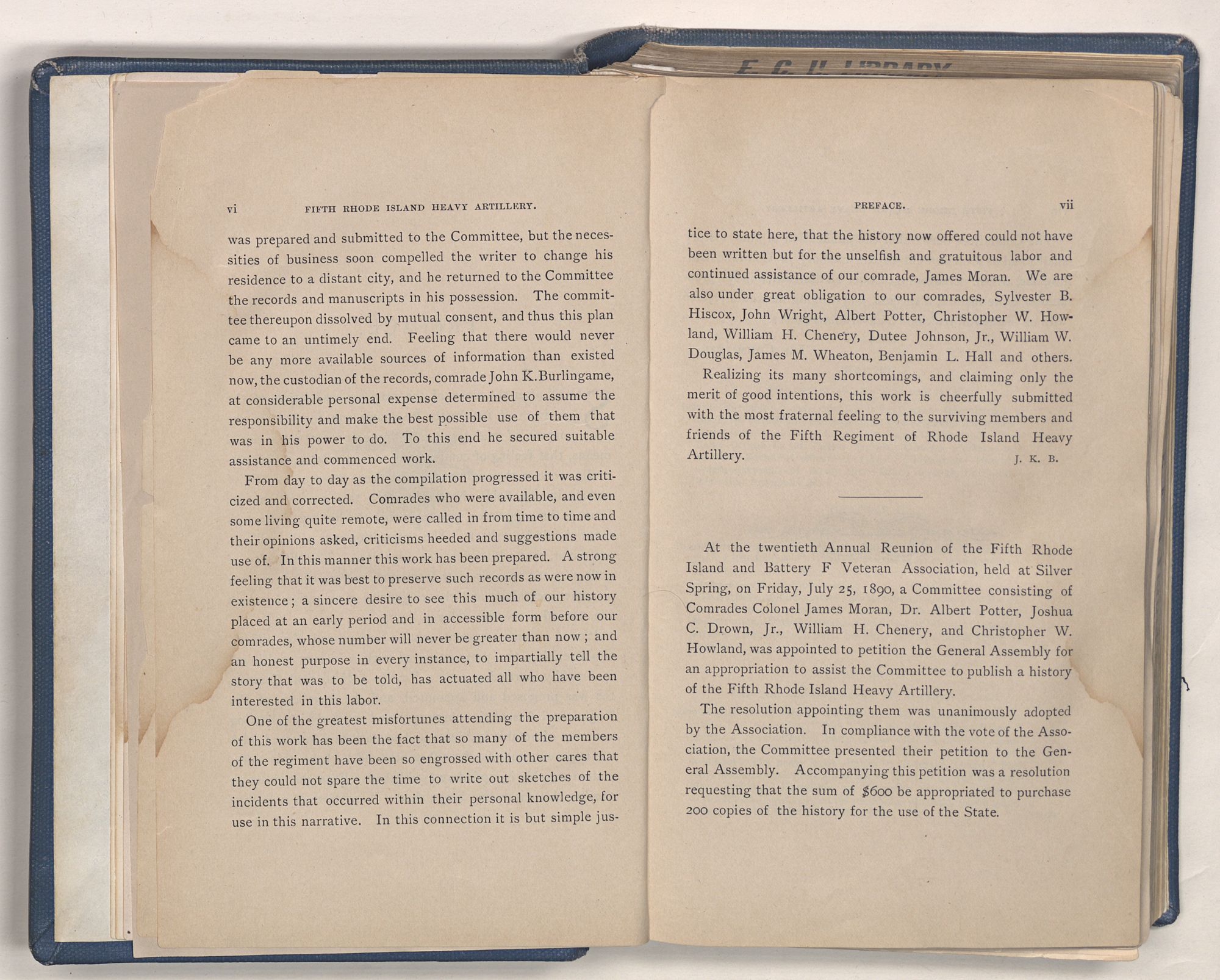 At the twentieth Annual Reunion of the Fifth Rhode Island and Battery F Veteran Association, held at Silver Spring, on Friday, July 25, 1890, a Committee consisting of Comrades Colonel James Moran, Dr. Albert Potter, Joshua C. Drown, Jr., William H. Chenery, and Christopher W. Howland, was appointed to petition the General Assembly for an appropriation to assist the Committee to publish a history of the Fifth Rhode Island Heavy Artillery.