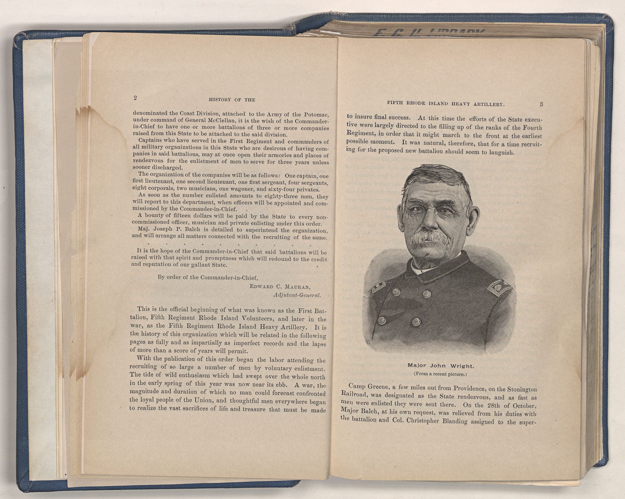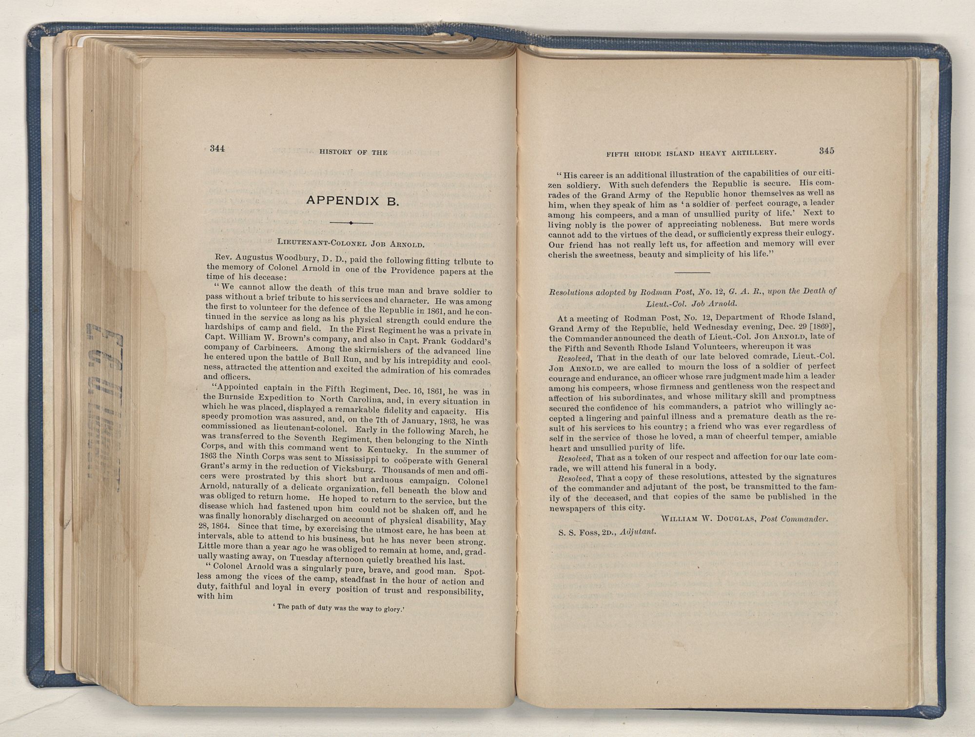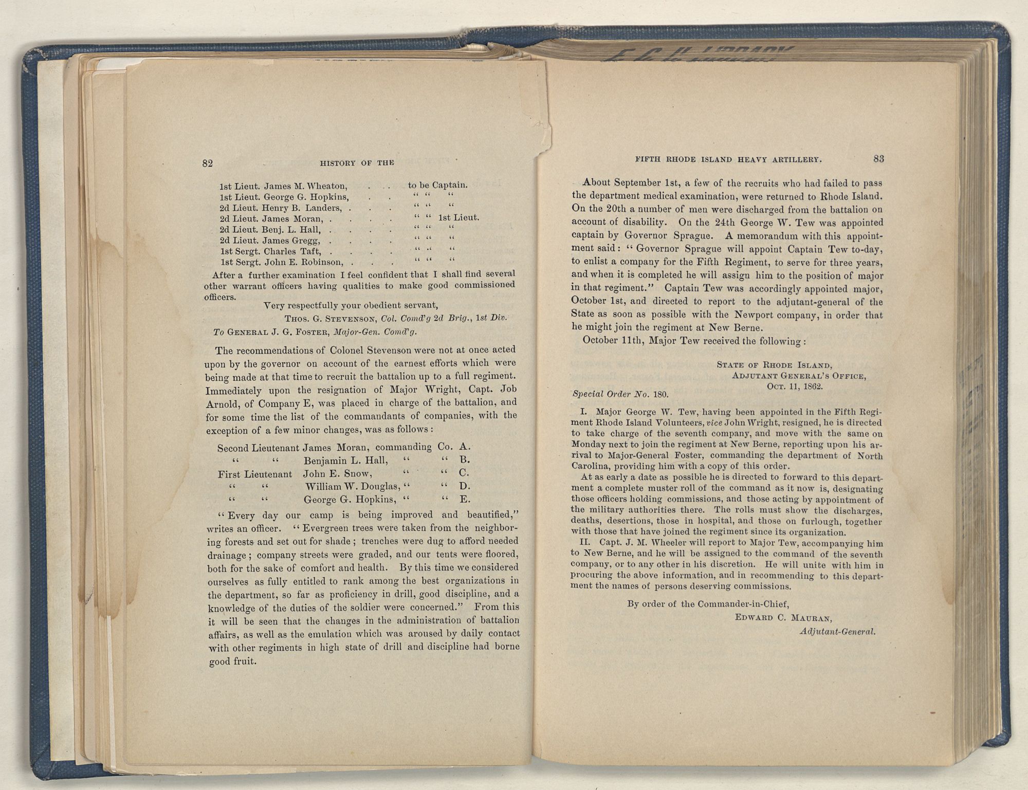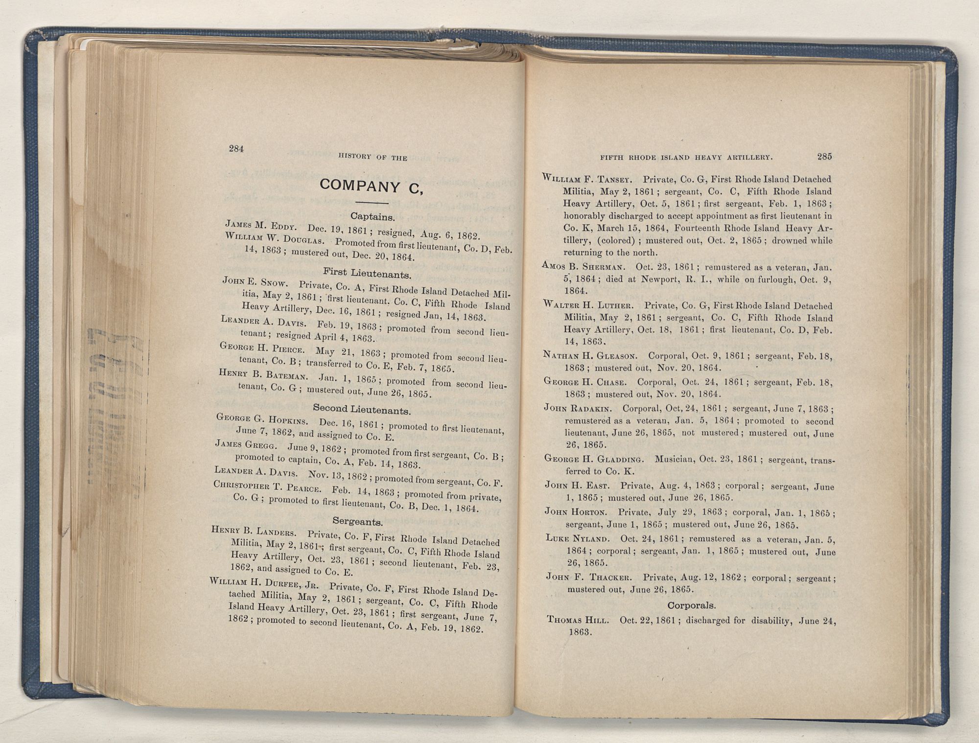 At the twentieth Annual Reunion of the Fifth Rhode Island and Battery F Veteran Association, held at Silver Spring, on Friday, July 25, 1890, a Committee consisting of Comrades Colonel James Moran, Dr. Albert Potter, Joshua C. Drown, Jr., William H. Chenery, and Christopher W. Howland, was appointed to petition the General Assembly for an appropriation to assist the Committee to publish a history of the Fifth Rhode Island Heavy Artillery.