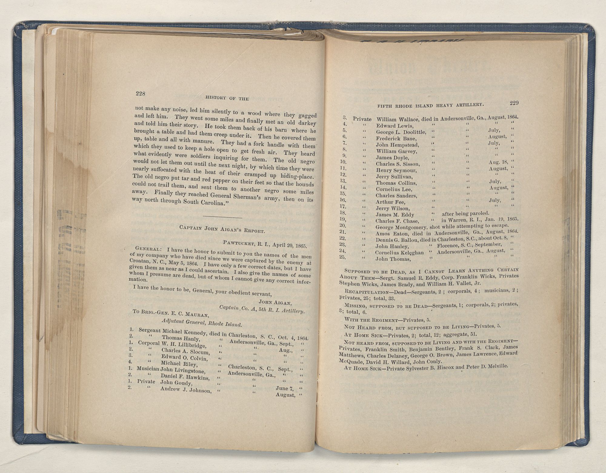 Colonel Sisson's official report of the capture of Company A—Chaplain White's narrative of the fight at Croatan, the surrender of the company, and the march to Kinston—Private Sylvester B. Hiscox's narrative of life in Andersonville, Ga., Florence, S. C., and Captain Aigan's escape — Captain John Aigan's official report, showing the death list in Southern prison pens, . . . . . 205-229