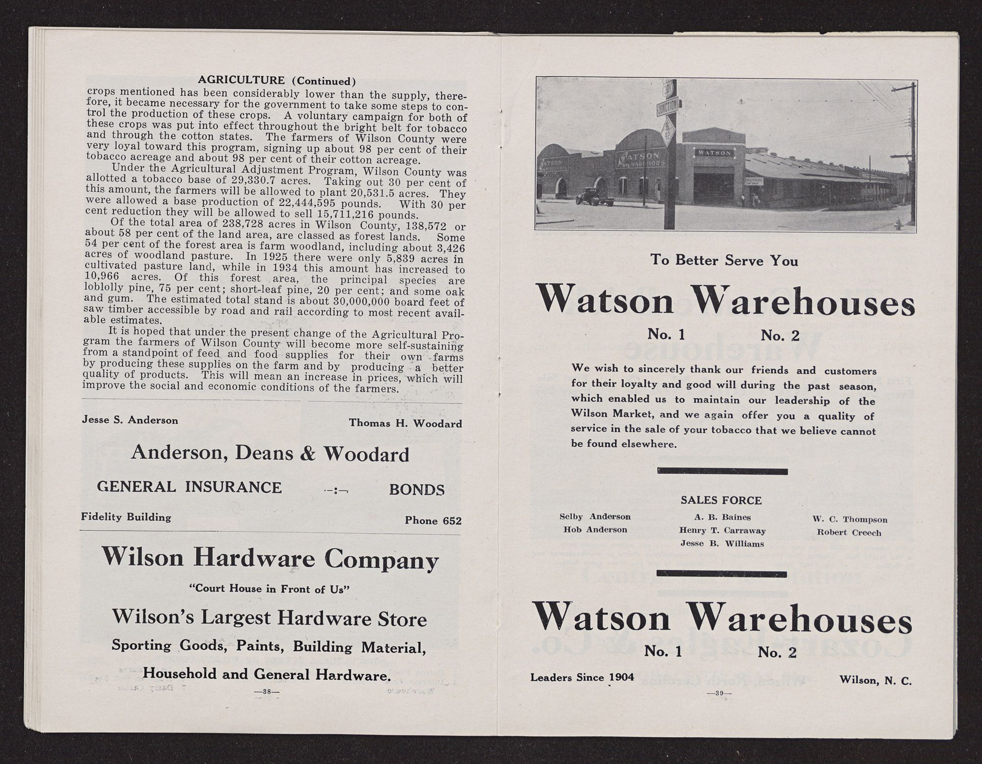 First, in 1890, the first tobacco warehouse was built in Wilson. It proved quite successful both from the standpoint of being a convenience to the farmers who had heretofore sold their tobacco in Rocky Mount and other centers, and also as a business enterprise for the owners. From the beginning, Wilson proved popular as a tobacco market. The growth of the town may be dated from this first tobacco sale. During the 44 years that the Wilson tobacco market has been running, it has not only attained eminence by being the largest in the world for the sale of flue-cured tobacco, but justly claims to be the most efficient market of any tobacco belt.