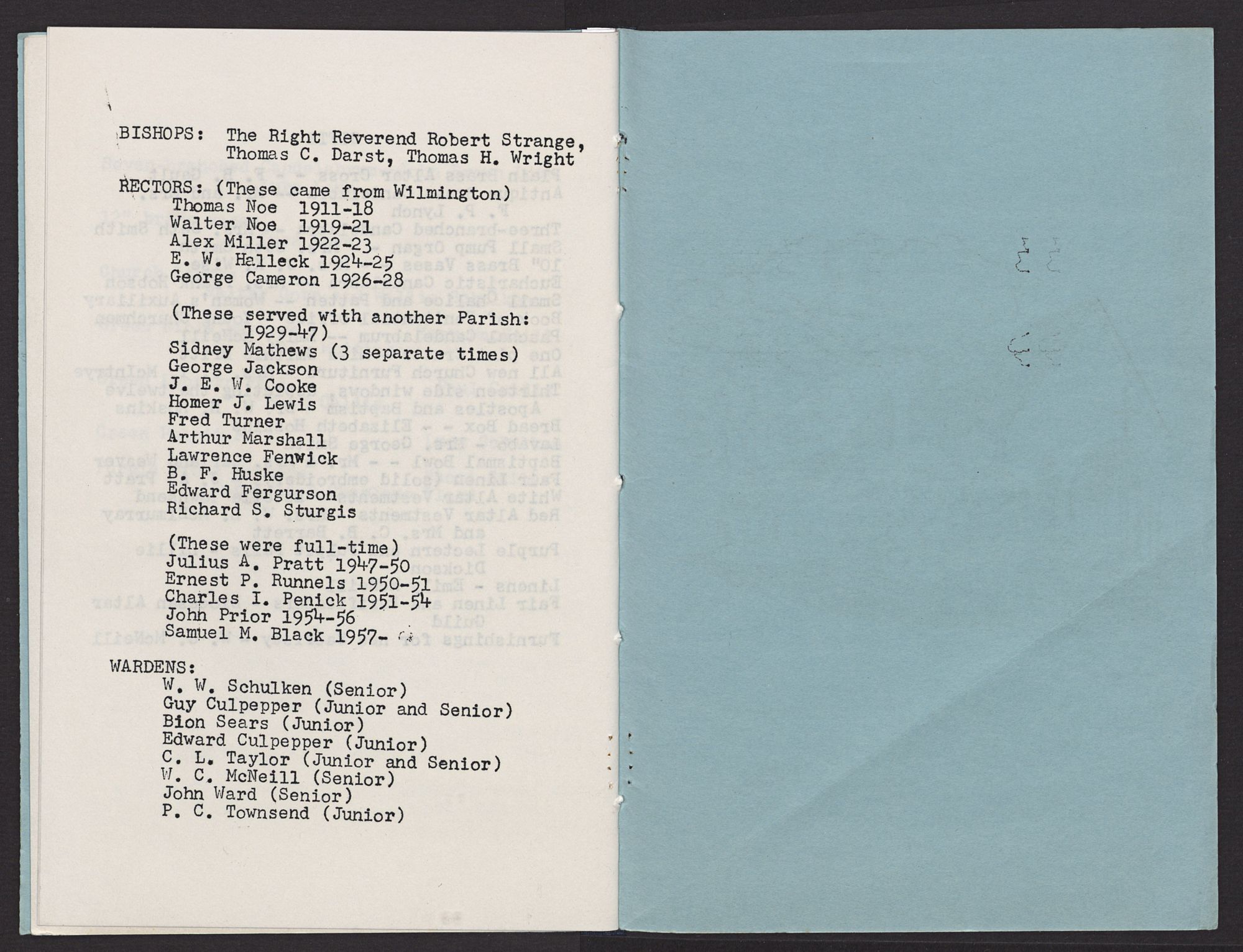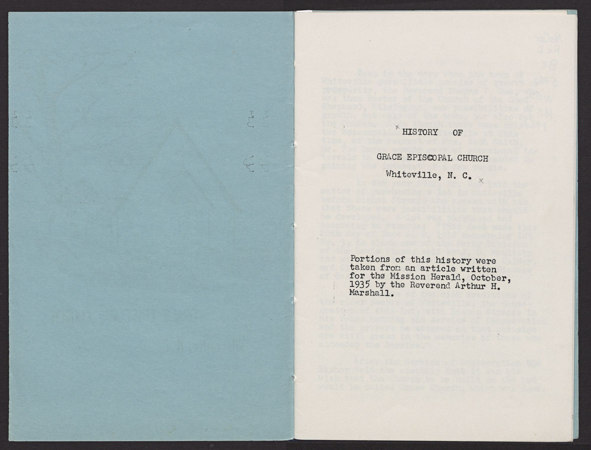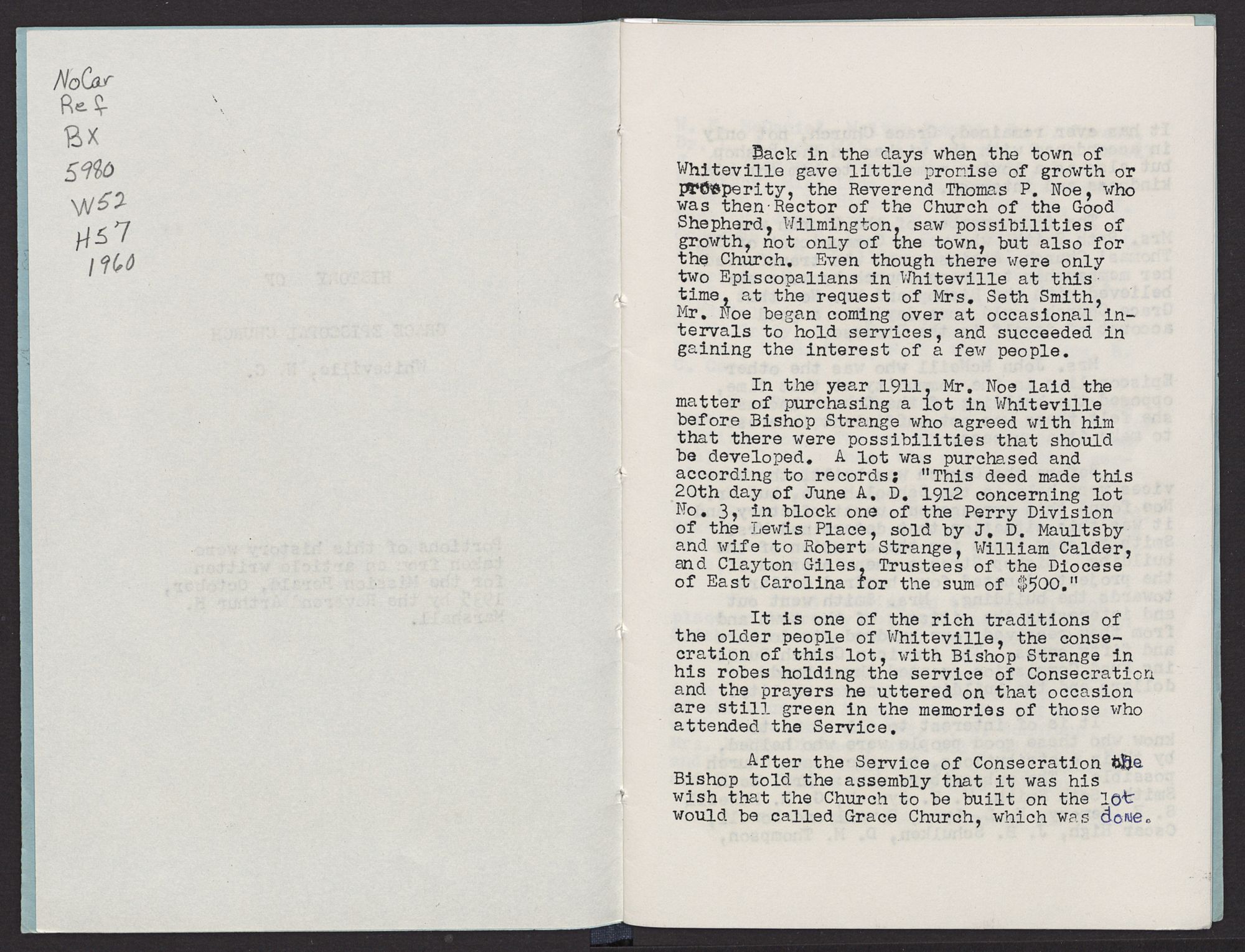 Back in the days when the town of Whiteville gave little promise of growth or prosperity, the Reverend Thomas P. Noe, who was then Rector of the Church of the Good Shepherd, Wilmington, saw possibilities of growth, not only of the town, but also for the Church. Even though there were only two Episcopalians in Whiteville at this time, at the request of Mrs. Seth Smith, Mr. Noe began coming over at occasional intervals to hold services, and succeeded in gaining the interest of a few people.