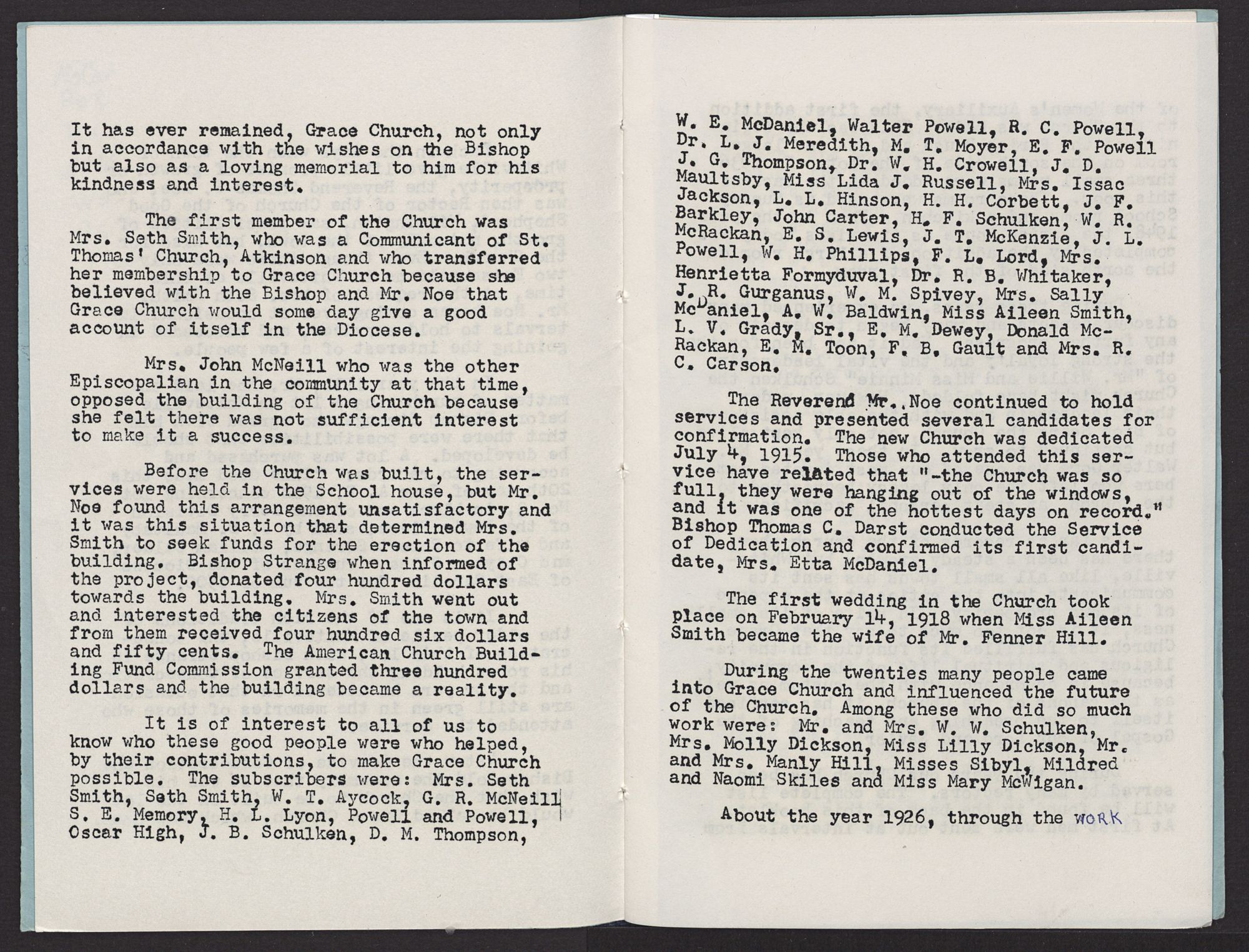 The first member of the Church was Mrs. Seth Smith, who was a Communicant of St. Thomas’ Church, Atkinson and who transferred her membership to Grace Church because she believed with the Bishop and Mr. Noe that Grace Church would some day give a good account of itself in the Diocese.