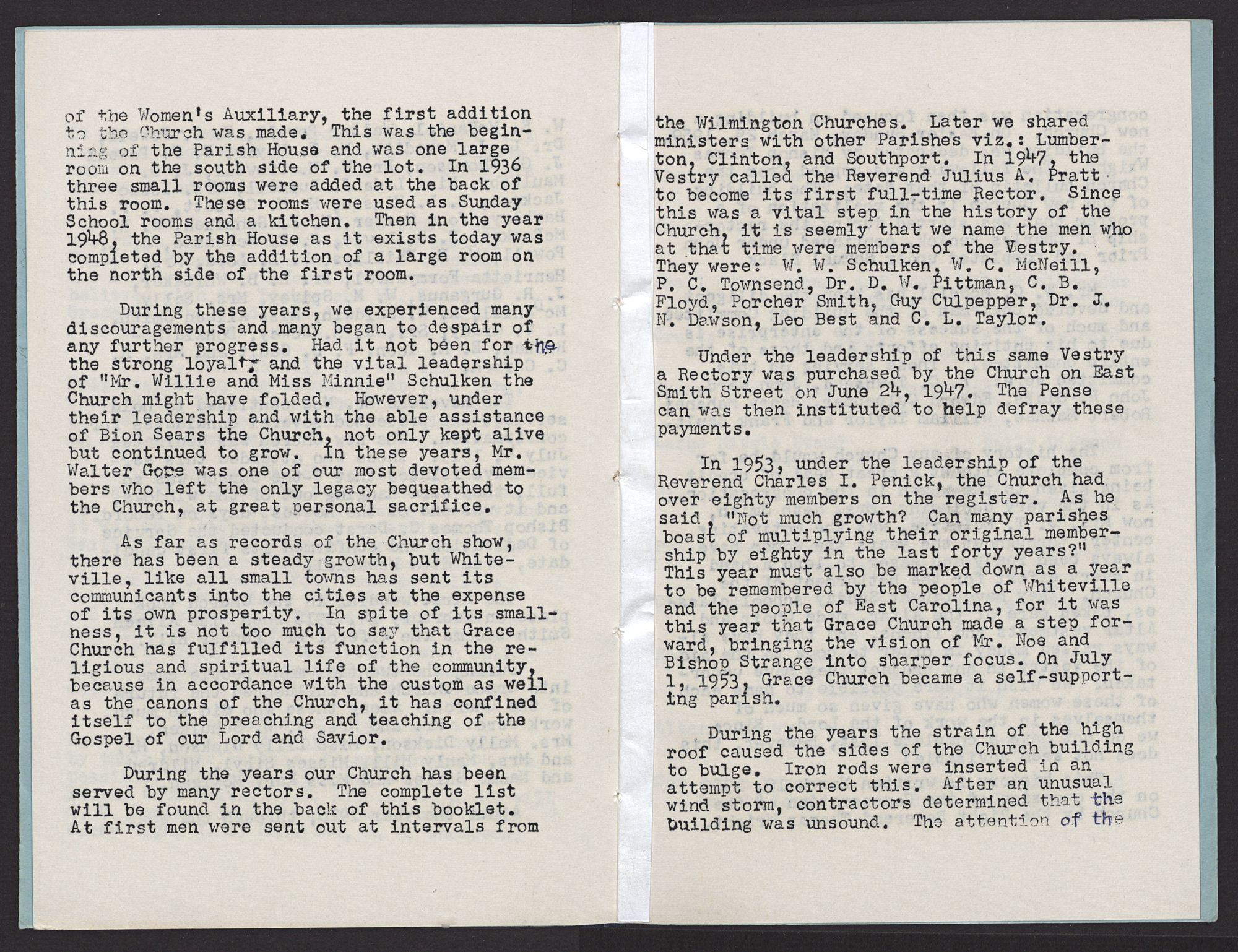 In 1953, under the leadership of the Reverend Charles I. Penick, the Church had over eighty members on the register. As he said, “Not much growth? Can many parishes boast of multiplying their original membership by eighty in the last forty years?” This year must also be marked down as a year to be remembered by the people of Whiteville and the people of East Carolina, for it was this year that Grace Church made a step forward, bringing the vision of Mr. Noe and Bishop Strange into sharper focus. On July 1, 1953, Grace Church became a self-supporting parish.