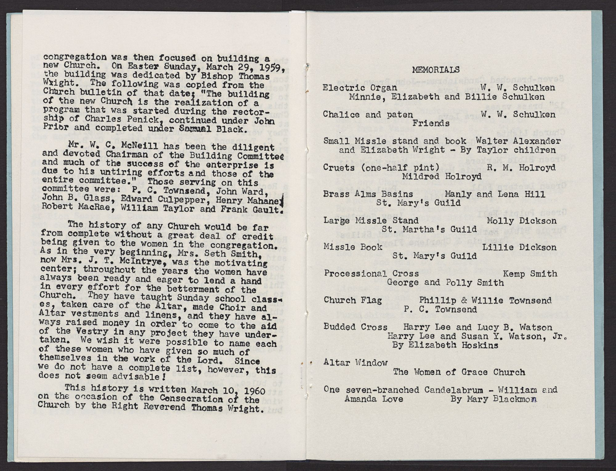 This history is written March 10, 1960 on the occasion of the Consecration of the Church by the Right Reverend Thomas Wright.