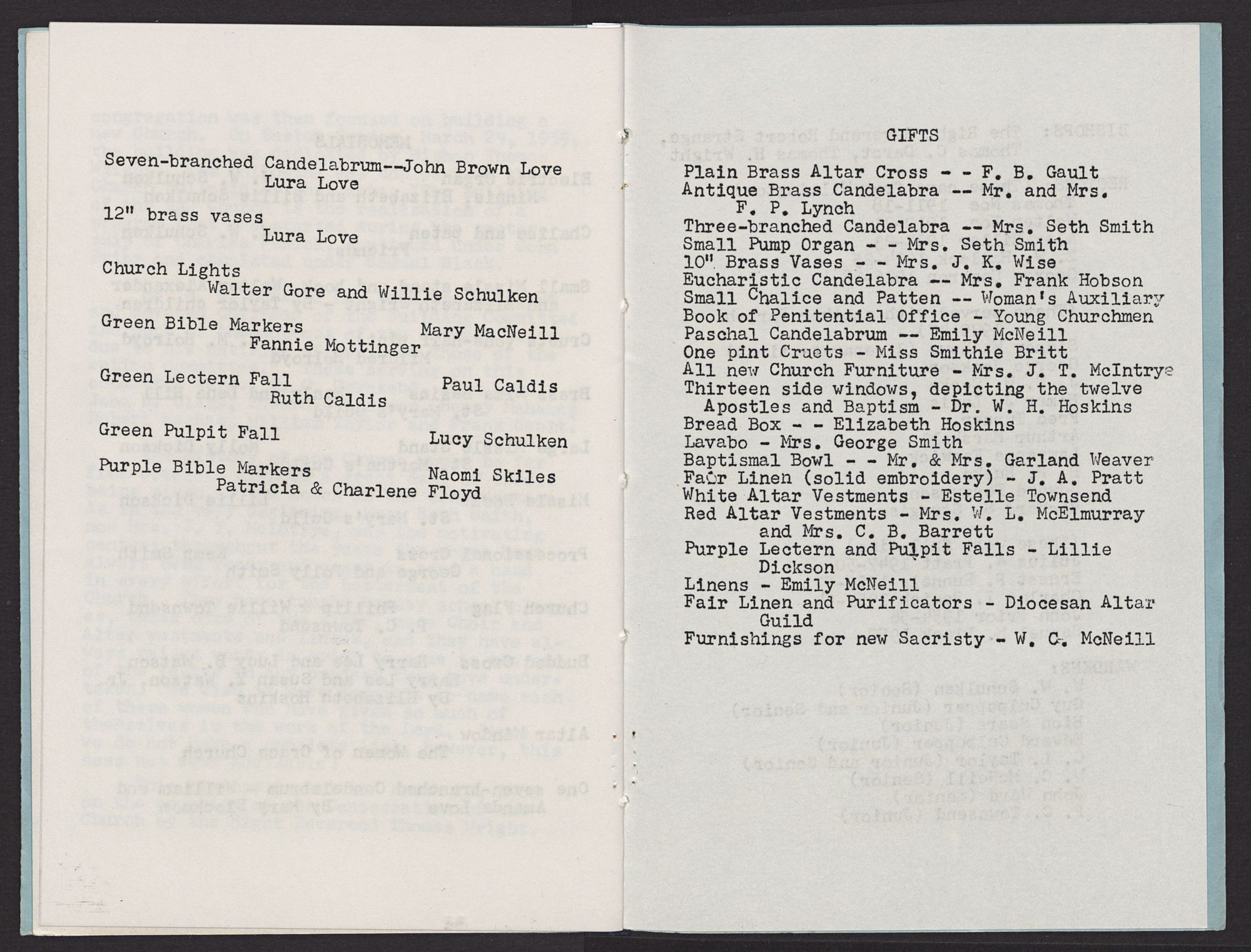 The history of any Church would be far from complete without a great deal of credit being given to the women in the congregation. As in the very beginning, Mrs. Seth Smith, now Mrs. J. T. McIntrye, was the motivating center; throughout the years the women have always been ready and eager to lend a hand in every effort for the betterment of the Church. They have taught Sunday school classes, taken care of the Altar, made Choir and Altar vestments and linens, and they have always raised money in order to come to the aid of the Vestry in any project they have undertaken. We wish it were possible to name each of these women who have given so much of themselves in the work of the Lord. Since we do not have a complete list, however, this does not seem advisable!