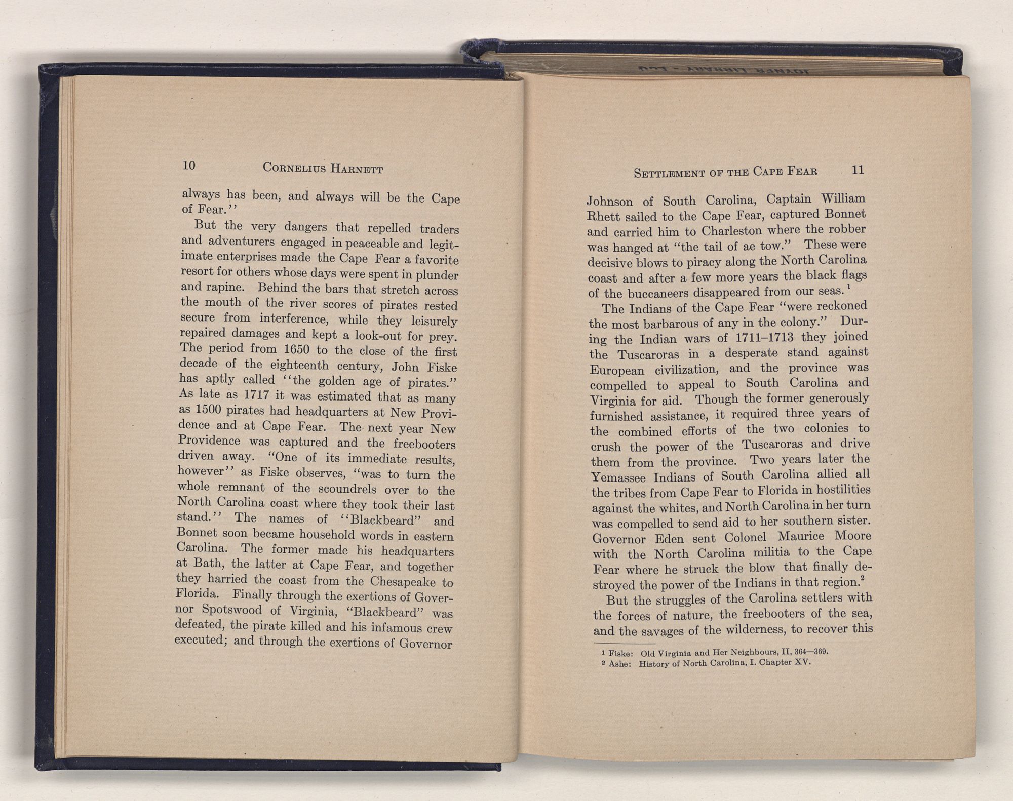 But the very dangers that repelled traders and adventurers engaged in peaceable and legitimate enterprises made the Cape Fear a favorite resort for others whose days were spent in plunder and rapine. Behind the bars that stretch across the mouth of the river scores of pirates rested secure from interference, while they leisurely repaired damages and kept a look-out for prey. The period from 1650 to the close of the first decade of the eighteenth century, John Fiske has aptly called “the golden age of pirates.” As late as 1717 it was estimated that as many as 1500 pirates had headquarters at New Providence and at Cape Fear. The next year New Providence was captured and the freebooters driven away. “One of its immediate results, however” as Fiske observes, “was to turn the whole remnant of the scoundrels over to the North Carolina coast where they took their last stand.” The names of “Blackbeard” and Bonnet soon became household words in eastern Carolina. The former made his headquarters at Bath, the latter at Cape Fear, and together they harried the coast from the Chesapeake to Florida. Finally through the exertions of Governor Spotswood of Virginia, “Blackbeard” was defeated, the pirate killed and his infamous crew executed; and through the exertions of Governor