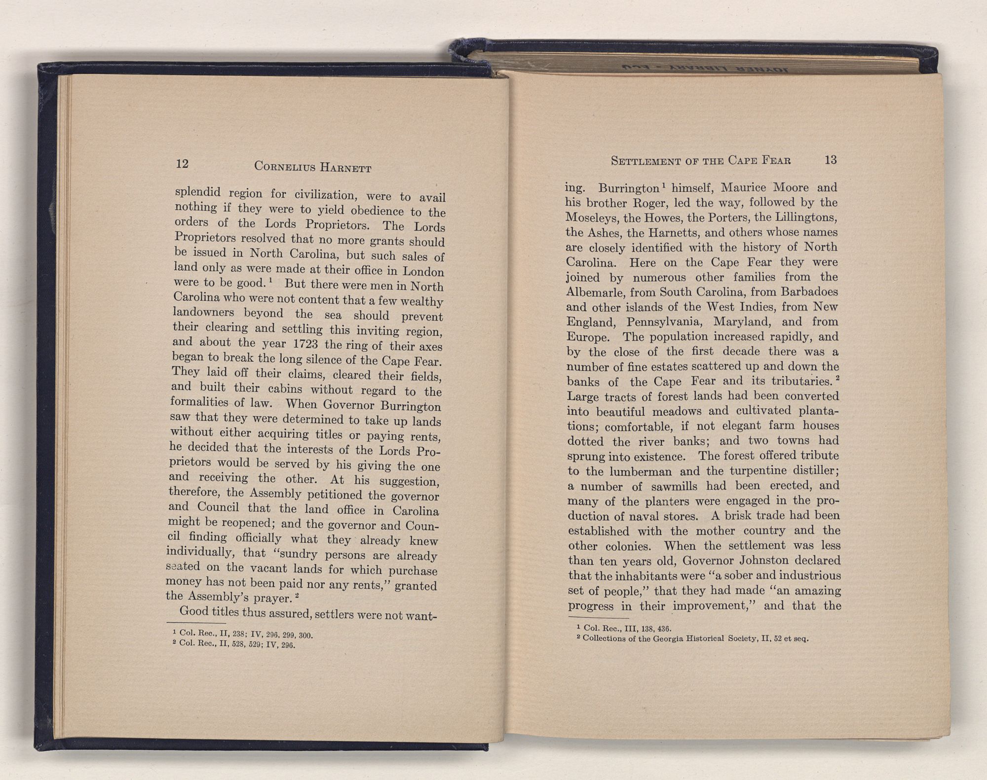 1 Col. Rec., II, 238; IV, 296, 299, 300.2 Col. Rec., II, 528, 529; IV, 296.Burrington1 himself, Maurice Moore and his brother Roger, led the way, followed by the Moseleys, the Howes, the Porters, the Lillingtons, the Ashes, the Harnetts, and others whose names are closely identified with the history of North Carolina. Here on the Cape Fear they were joined by numerous other families from the Albemarle, from South Carolina, from Barbadoes and other islands of the West Indies, from New England, Pennsylvania, Maryland, and from Europe. The population increased rapidly, and by the close of the first decade there was a number of fine estates scattered up and down the banks of the Cape Fear and its tributaries.2 Large tracts of forest lands had been converted into beautiful meadows and cultivated plantations; comfortable, if not elegant farm houses dotted the river banks; and two towns had sprung into existence. The forest offered tribute to the lumberman and the turpentine distiller; a number of sawmills had been erected, and many of the planters were engaged in the production of naval stores. A brisk trade had been established with the mother country and the other colonies. When the settlement was less than ten years old, Governor Johnston declared that the inhabitants were “a sober and industrious set of people,” that they had made “an amazing progress in their improvement,” and that the