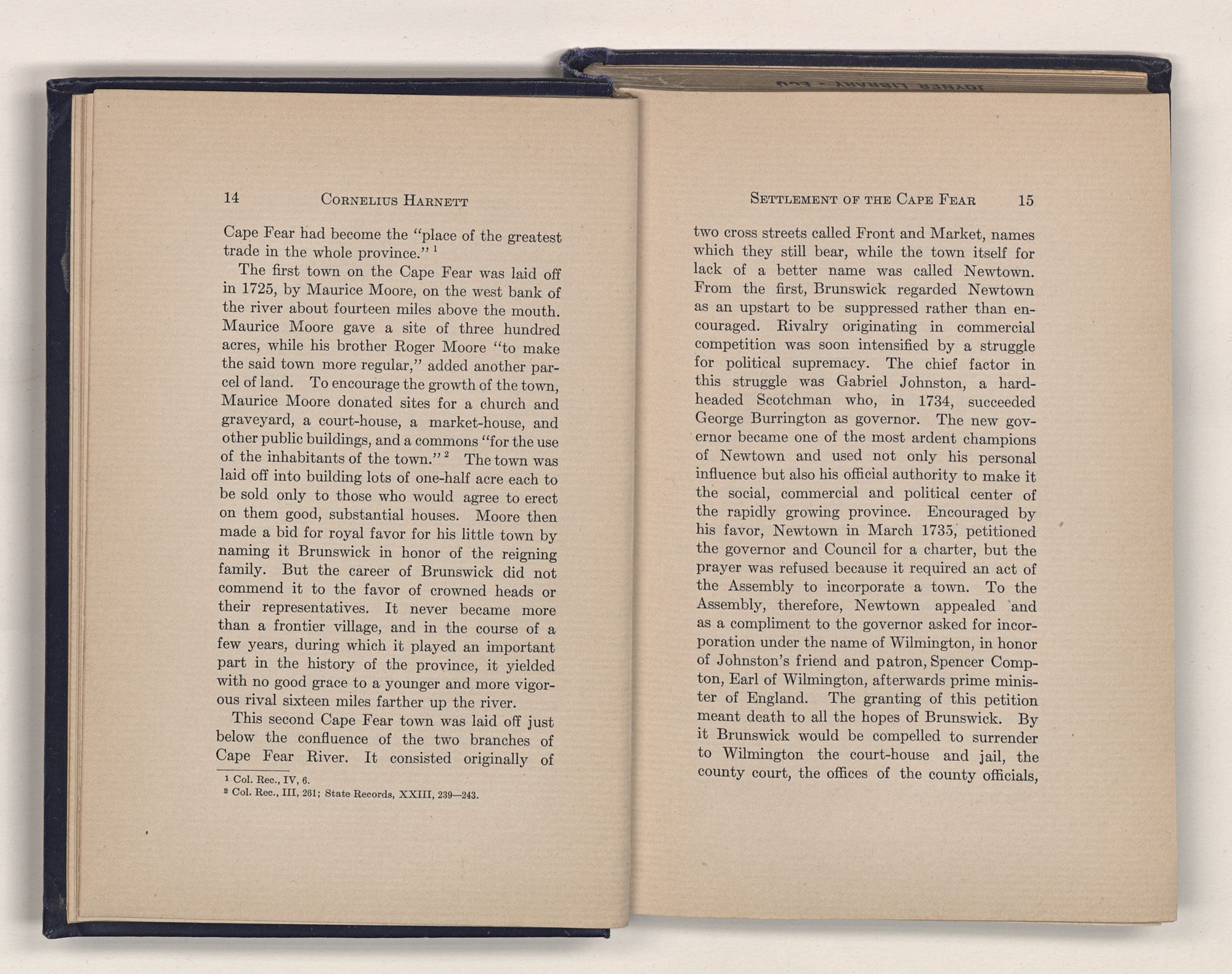 1 Col. Rec., IV, 6.2 Col. Rec., III, 261; State Records, XXIII, 239—243.two cross streets called Front and Market, names which they still bear, while the town itself for lack of a better name was called Newtown. From the first, Brunswick regarded Newtown as an upstart to be suppressed rather than encouraged. Rivalry originating in commercial competition was soon intensified by a struggle for political supremacy. The chief factor in this struggle was Gabriel Johnston, a hardheaded Scotchman who, in 1734, succeeded George Burrington as governor. The new governor became one of the most ardent champions of Newtown and used not only his personal influence but also his official authority to make it the social, commercial and political center of the rapidly growing province. Encouraged by his favor, Newtown in March 1735, petitioned the governor and Council for a charter, but the prayer was refused because it required an act of the Assembly to incorporate a town. To the Assembly, therefore, Newtown appealed and as a compliment to the governor asked for incorporation under the name of Wilmington, in honor of Johnston's friend and patron, Spencer Compton, Earl of Wilmington, afterwards prime minister of England. The granting of this petition meant death to all the hopes of Brunswick. By it Brunswick would be compelled to surrender to Wilmington the court-house and jail, the county court, the offices of the county officials,