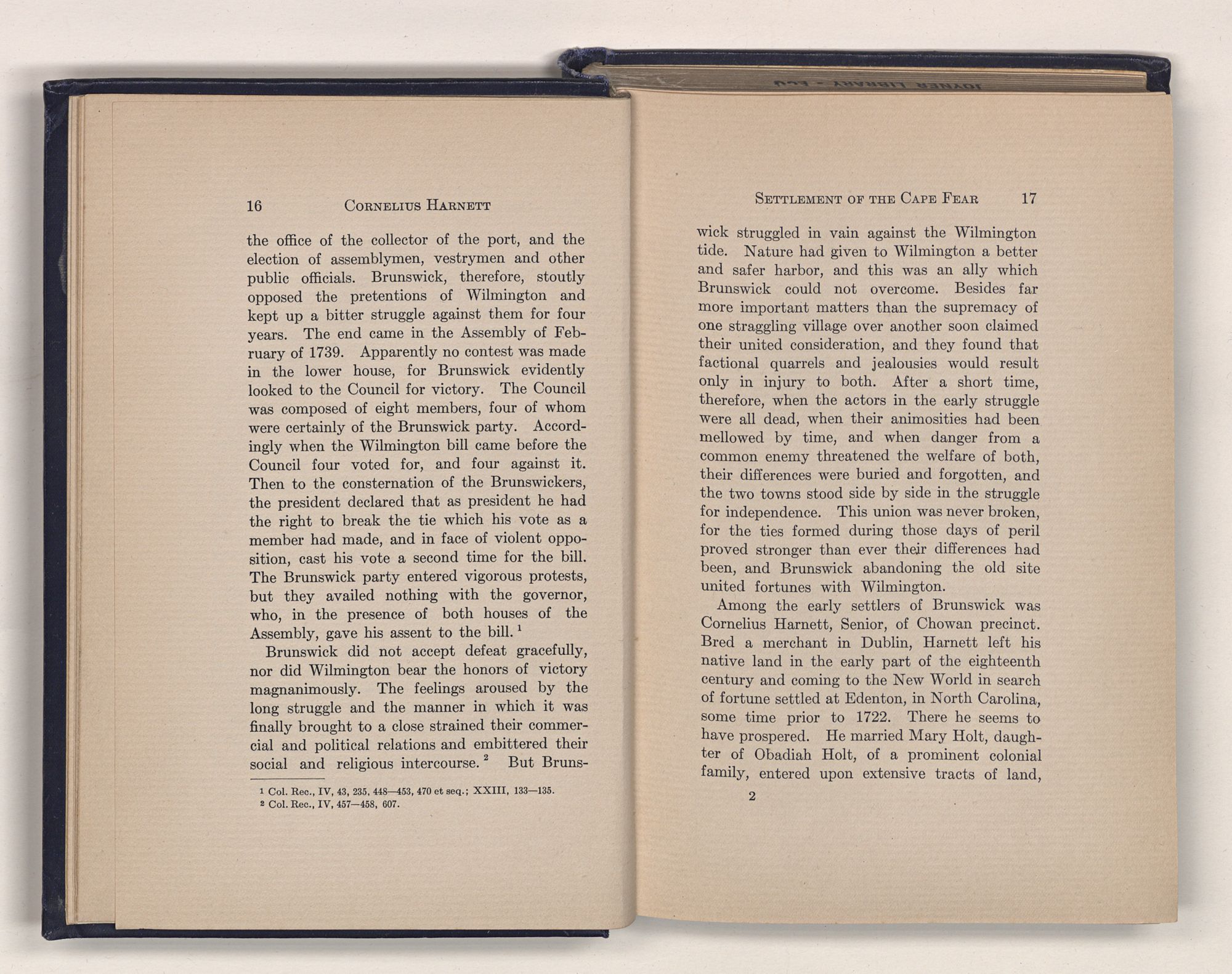 1 Col. Rec., IV, 43, 235, 448—453, 470 et seq.; XXIII, 133—135.2 Col. Rec., IV, 457—458, 607.struggled in vain against the Wilmington tide. Nature had given to Wilmington a better and safer harbor, and this was an ally which Brunswick could not overcome. Besides far more important matters than the supremacy of one straggling village over another soon claimed their united consideration, and they found that factional quarrels and jealousies would result only in injury to both. After a short time, therefore, when the actors in the early struggle were all dead, when their animosities had been mellowed by time, and when danger from a common enemy threatened the welfare of both, their differences were buried and forgotten, and the two towns stood side by side in the struggle for independence. This union was never broken, for the ties formed during those days of peril proved stronger than ever their differences had been, and Brunswick abandoning the old site united fortunes with Wilmington.