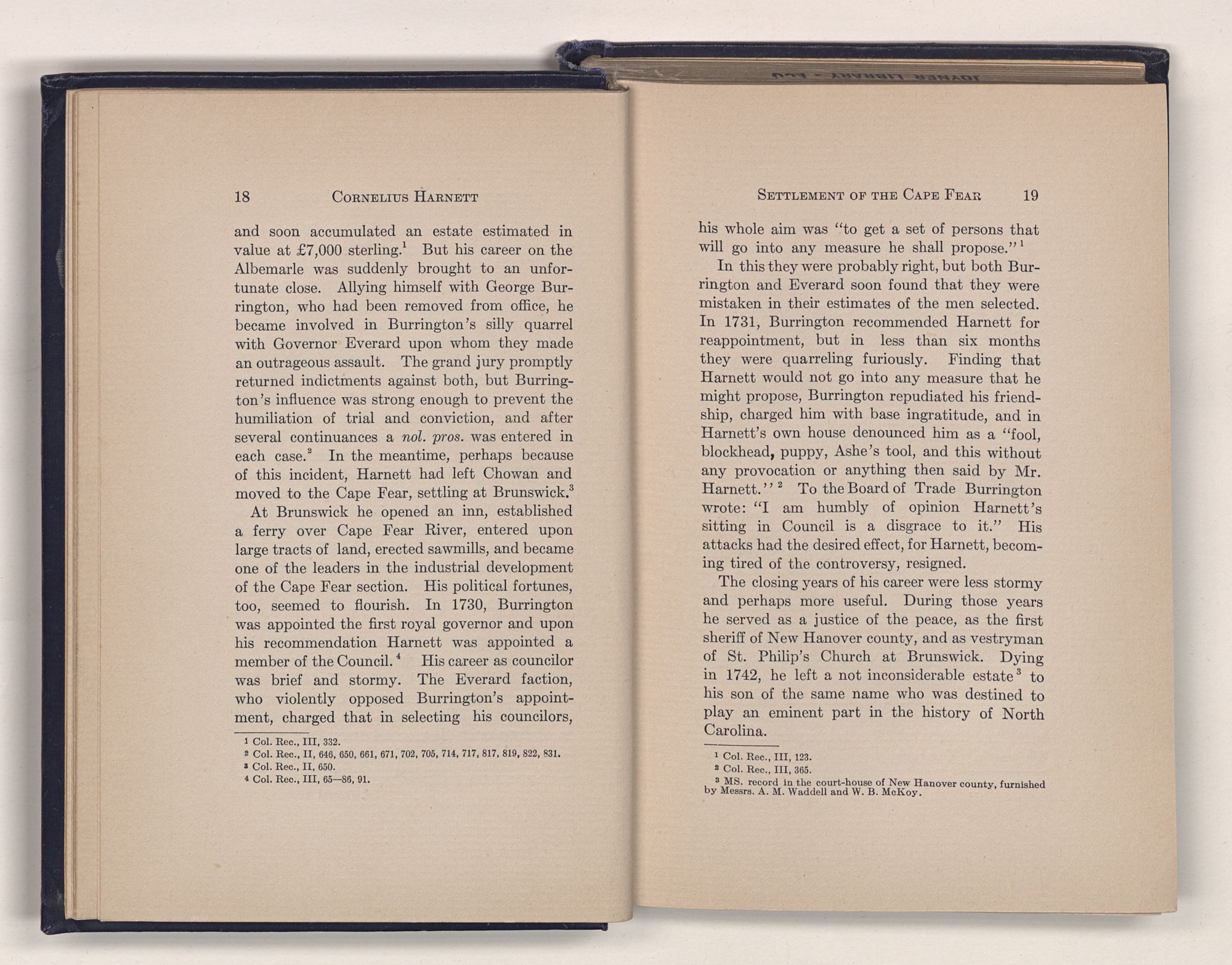 At Brunswick he opened an inn, established a ferry over Cape Fear River, entered upon large tracts of land, erected sawmills, and became one of the leaders in the industrial development of the Cape Fear section. His political fortunes, too, seemed to flourish. In 1730, Burrington was appointed the first royal governor and upon his recommendation Harnett was appointed a member of the Council.4 His career as councilor was brief and stormy. The Everard faction, who violently opposed Burrington's appointment, charged that in selecting his councilors,