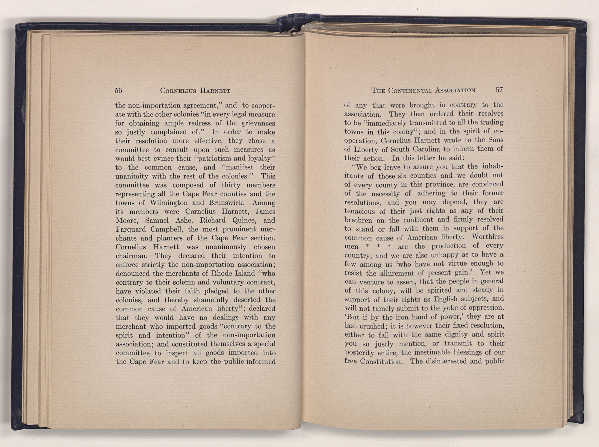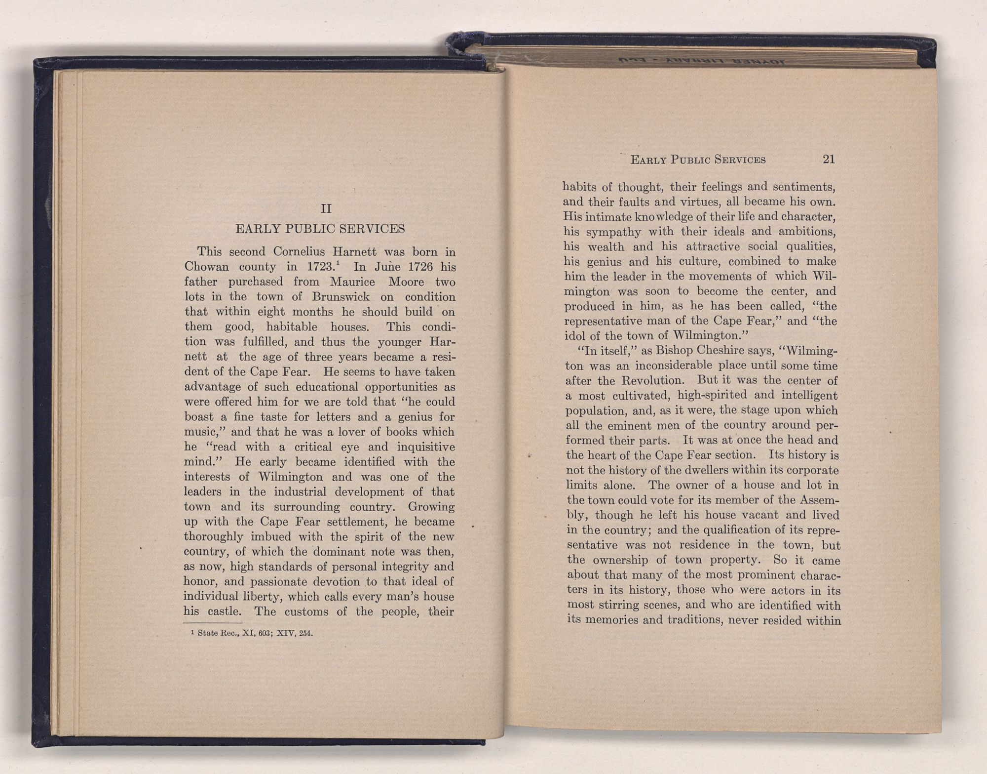 This second Cornelius Harnett was born in Chowan county in 1723.1 In June 1726 his father purchased from Maurice Moore two lots in the town of Brunswick on condition that within eight months he should build on them good, habitable houses. This condition was fulfilled, and thus the younger Harnett at the age of three years became a resident of the Cape Fear. He seems to have taken advantage of such educational opportunities as were offered him for we are told that “he could boast a fine taste for letters and a genius for music,” and that he was a lover of books which he “read with a critical eye and inquisitive mind.” He early became identified with the interests of Wilmington and was one of the leaders in the industrial development of that town and its surrounding country. Growing up with the Cape Fear settlement, he became thoroughly imbued with the spirit of the new country, of which the dominant note was then, as now, high standards of personal integrity and honor, and passionate devotion to that ideal of individual liberty, which calls every man's house his castle. The customs of the people, their