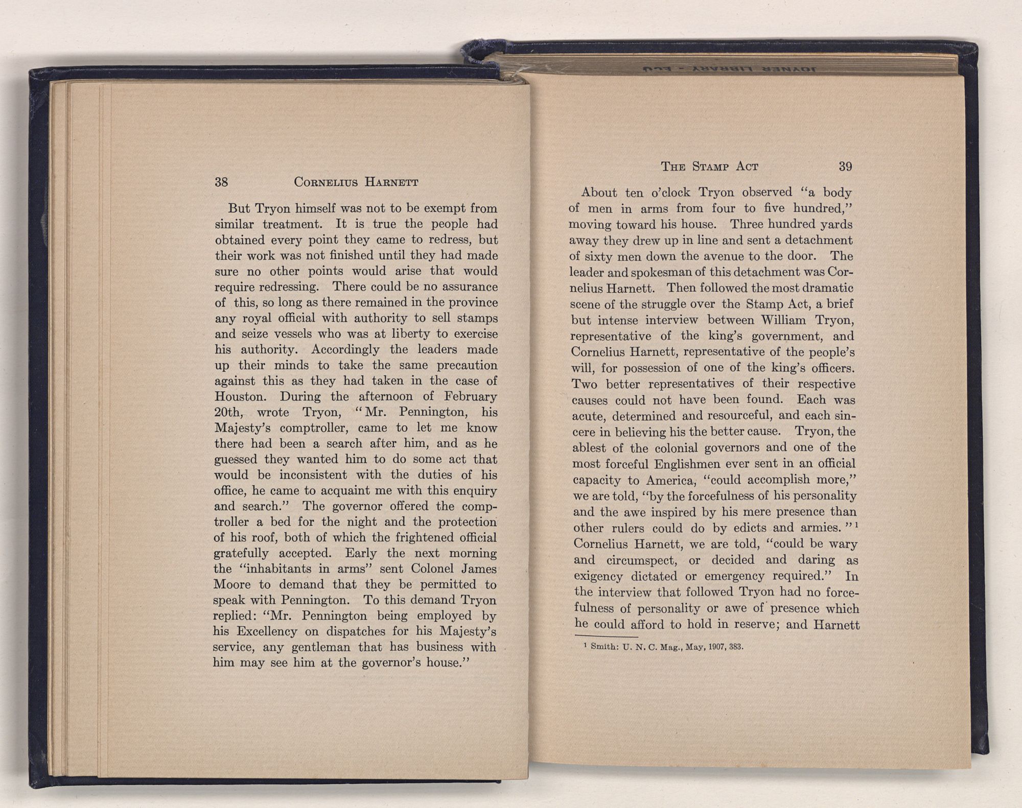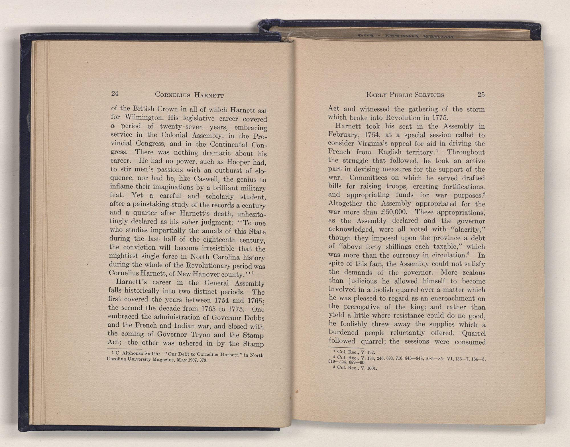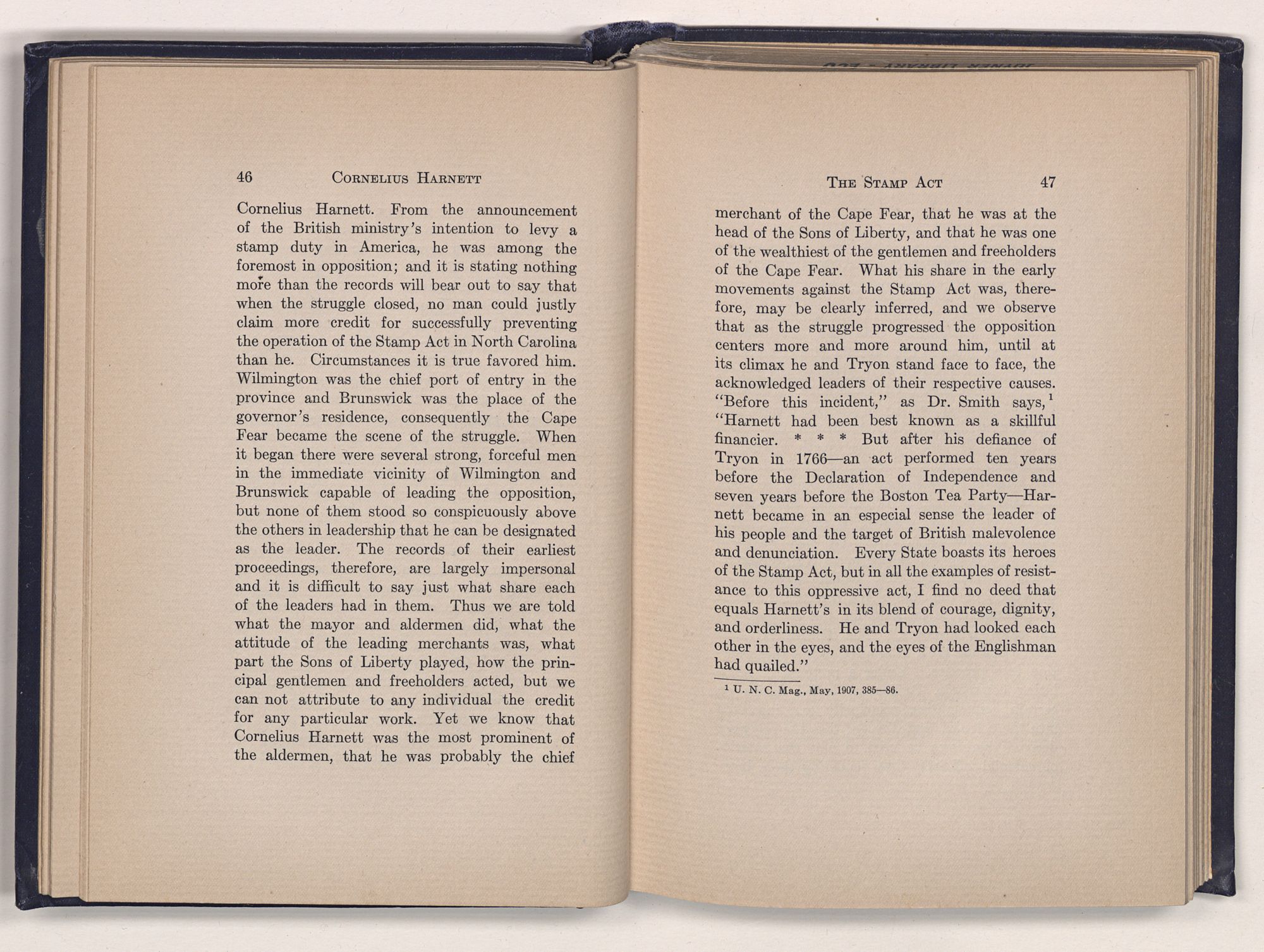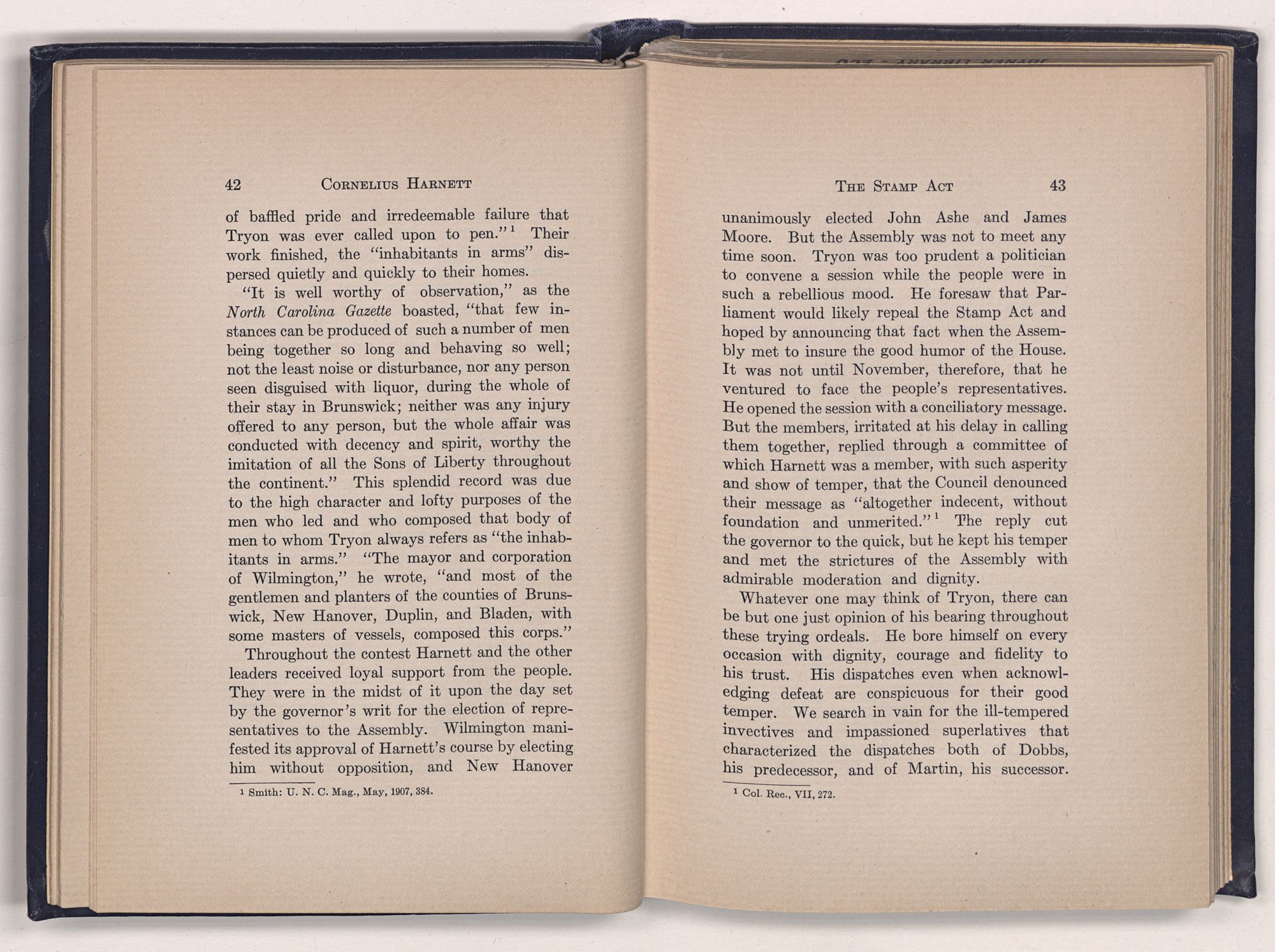 1 C. Alphonso Smith: “Our Debt to Cornelius Harnett,” in North Carolina University Magazine, May 1907, 379.Act and witnessed the gathering of the storm which broke into Revolution in 1775.