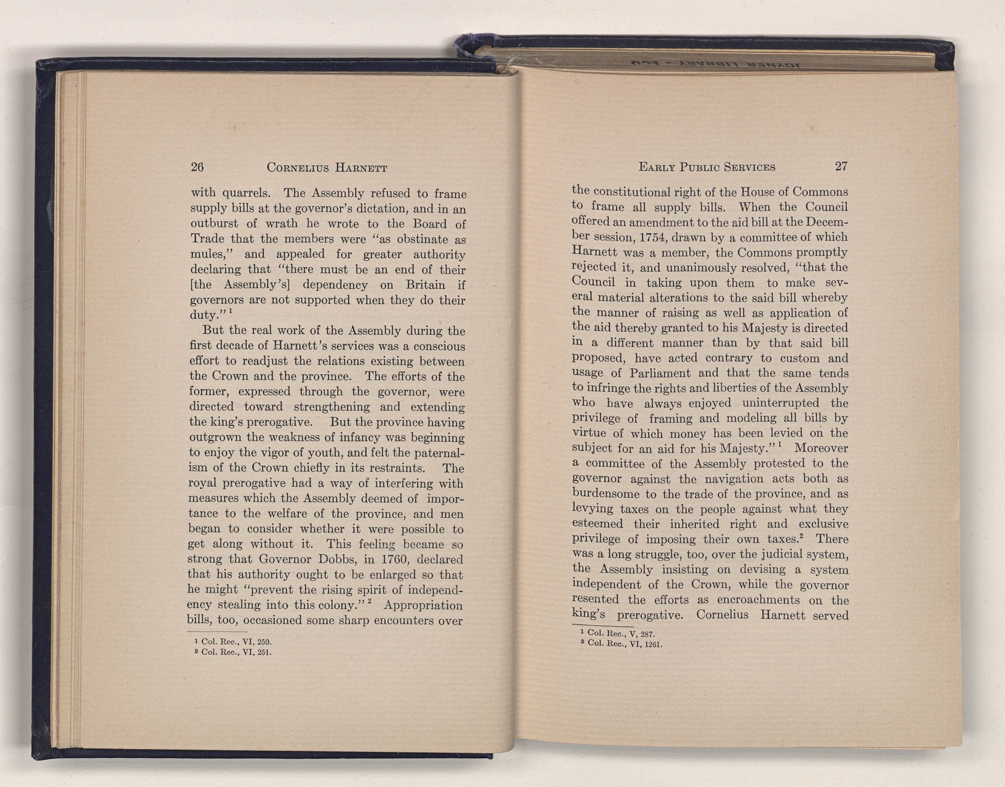 1 Col. Rec., VI, 250.2 Col. Rec., VI, 251.the constitutional right of the House of Commons to frame all supply bills. When the Council offered an amendment to the aid bill at the December session, 1754, drawn by a committee of which Harnett was a member, the Commons promptly rejected it, and unanimously resolved, “that the Council in taking upon them to make several material alterations to the said bill whereby the manner of raising as well as application of the aid thereby granted to his Majesty is directed in a different manner than by that said bill proposed, have acted contrary to custom and usage of Parliament and that the same tends to infringe the rights and liberties of the Assembly who have always enjoyed uninterrupted the privilege of framing and modeling all bills by virtue of which money has been levied on the subject for an aid for his Majesty.”1 Moreover a committee of the Assembly protested to the governor against the navigation acts both as burdensome to the trade of the province, and as levying taxes on the people against what they esteemed their inherited right and exclusive privilege of imposing their own taxes.2 There was a long struggle, too, over the judicial system, the Assembly insisting on devising a system independent of the Crown, while the governor resented the efforts as encroachments on the king's prerogative. Cornelius Harnett served
