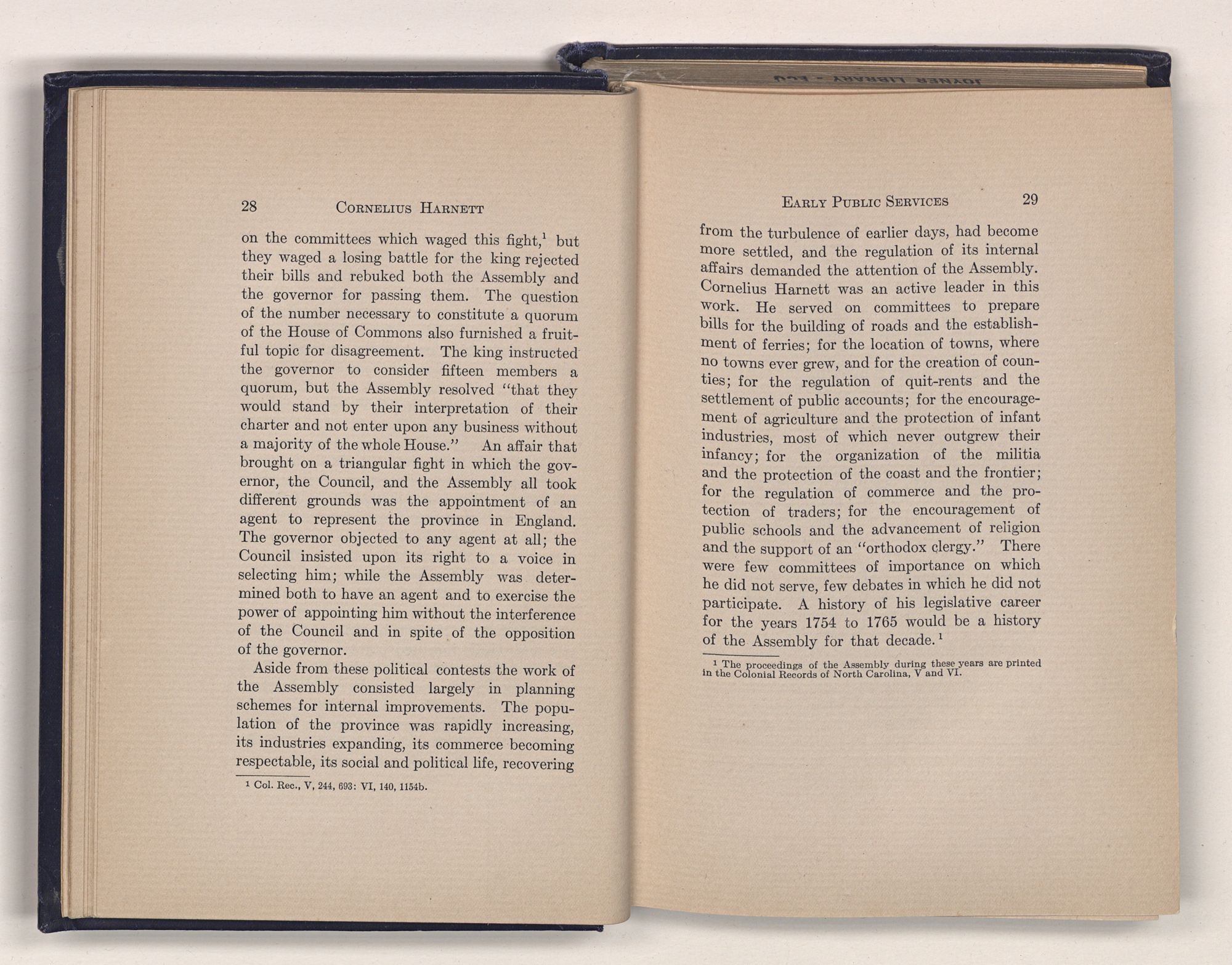 1 Col. Rec., V, 244, 693: VI, 140, 1154b.from the turbulence of earlier days, had become more settled, and the regulation of its internal affairs demanded the attention of the Assembly. Cornelius Harnett was an active leader in this work. He served on committees to prepare bills for the building of roads and the establishment of ferries; for the location of towns, where no towns ever grew, and for the creation of counties; for the regulation of quit-rents and the settlement of public accounts; for the encouragement of agriculture and the protection of infant industries, most of which never outgrew their infancy; for the organization of the militia and the protection of the coast and the frontier; for the regulation of commerce and the protection of traders; for the encouragement of public schools and the advancement of religion and the support of an “orthodox clergy.” There were few committees of importance on which he did not serve, few debates in which he did not participate. A history of his legislative career for the years 1754 to 1765 would be a history of the Assembly for that decade.1