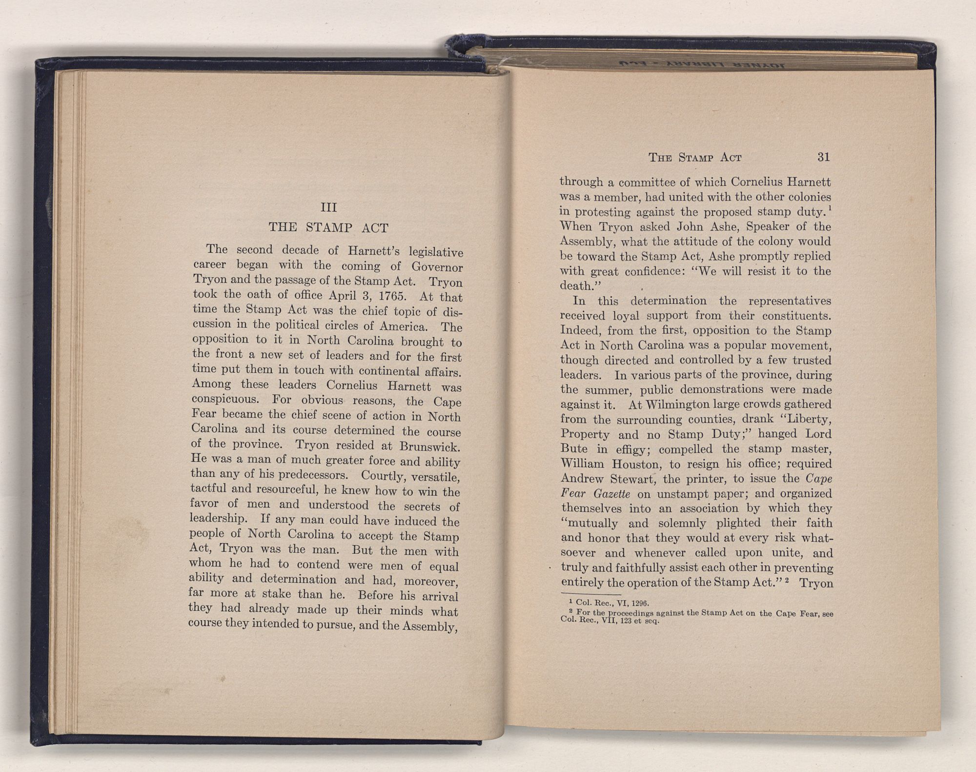 through a committee of which Cornelius Harnett was a member, had united with the other colonies in protesting against the proposed stamp duty.1 When Tryon asked John Ashe, Speaker of the Assembly, what the attitude of the colony would be toward the Stamp Act, Ashe promptly replied with great confidence: “We will resist it to the death.”