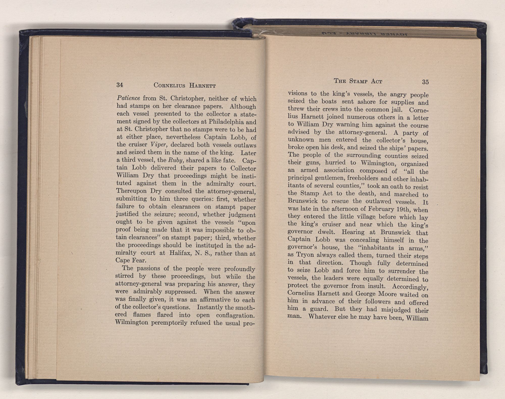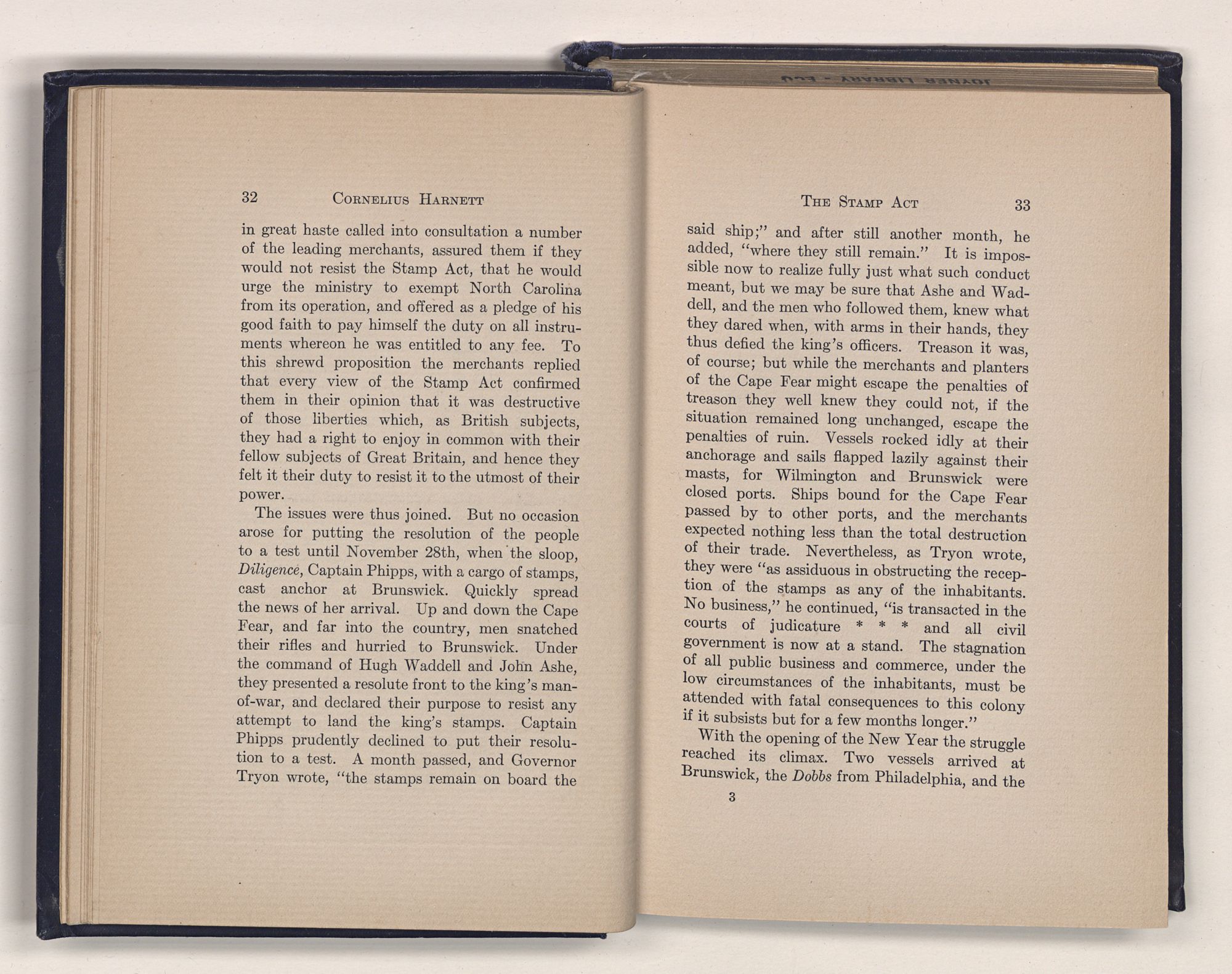 to the king's vessels, the angry people seized the boats sent ashore for supplies and threw their crews into the common jail. Cornelius Harnett joined numerous others in a letter to William Dry warning him against the course advised by the attorney-general. A party of unknown men entered the collector's house, broke open his desk, and seized the ships’ papers. The people of the surrounding counties seized their guns, hurried to Wilmington, organized an armed association composed of “all the principal gentlemen, freeholders and other inhabitants of several counties,” took an oath to resist the Stamp Act to the death, and marched to Brunswick to rescue the outlawed vessels. It was late in the afternoon of February 19th, when they entered the little village before which lay the king's cruiser and near which the king's governor dwelt. Hearing at Brunswick that Captain Lobb was concealing himself in the governor's house, the “inhabitants in arms,” as Tryon always called them, turned their steps in that direction. Though fully determined to seize Lobb and force him to surrender the vessels, the leaders were equally determined to protect the governor from insult. Accordingly, Cornelius Harnett and George Moore waited on him in advance of their followers and offered him a guard. But they had misjudged their man. Whatever else he may have been, William