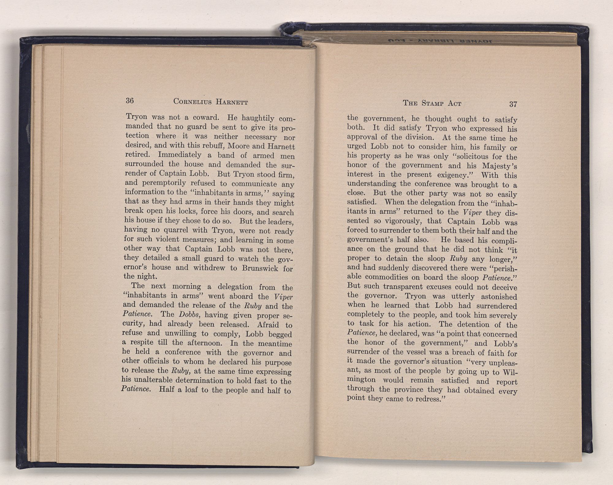 the government, he thought ought to satisfy both. It did satisfy Tryon who expressed his approval of the division. At the same time he urged Lobb not to consider him, his family or his property as he was only “solicitous for the honor of the government and his Majesty's interest in the present exigency.” With this understanding the conference was brought to a close. But the other party was not so easily satisfied. When the delegation from the “inhabitants in arms” returned to the Viper they dissented so vigorously, that Captain Lobb was forced to surrender to them both their half and the government's half also. He based his compliance on the ground that he did not think “it proper to detain the sloop Ruby any longer,” and had suddenly discovered there were “perishable commodities on board the sloop Patience.” But such transparent excuses could not deceive the governor. Tryon was utterly astonished when he learned that Lobb had surrendered completely to the people, and took him severely to task for his action. The detention of the Patience, he declared, was “a point that concerned the honor of the government,” and Lobb's surrender of the vessel was a breach of faith for it made the governor's situation “very unpleasant, as most of the people by going up to Wilmington would remain satisfied and report through the province they had obtained every point they came to redress.”
