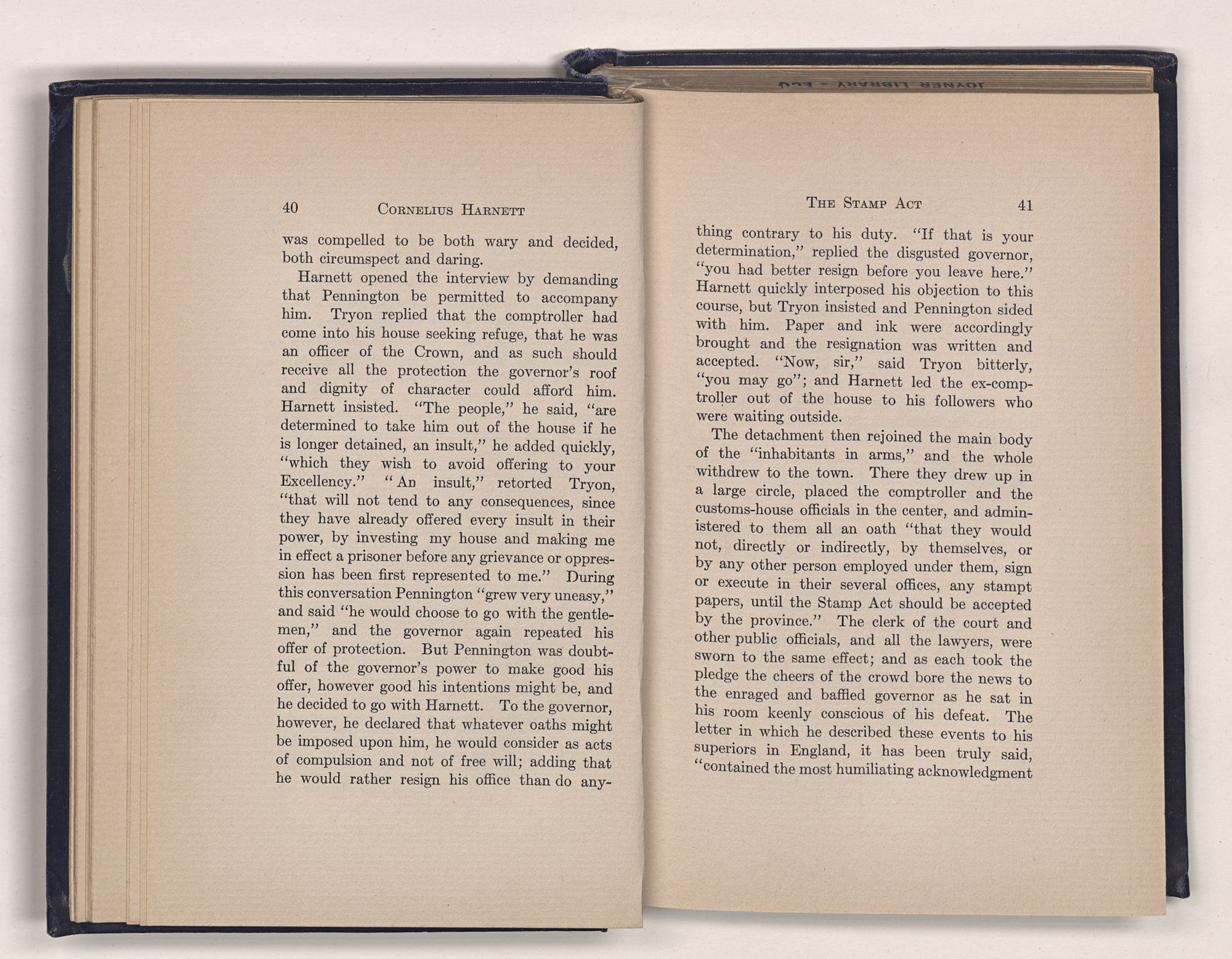 Harnett opened the interview by demanding that Pennington be permitted to accompany him. Tryon replied that the comptroller had come into his house seeking refuge, that he was an officer of the Crown, and as such should receive all the protection the governor's roof and dignity of character could afford him. Harnett insisted. “The people,” he said, “are determined to take him out of the house if he is longer detained, an insult,” he added quickly, “which they wish to avoid offering to your Excellency.” “An insult,” retorted Tryon, “that will not tend to any consequences, since they have already offered every insult in their power, by investing my house and making me in effect a prisoner before any grievance or oppression has been first represented to me.” During this conversation Pennington “grew very uneasy,” and said “he would choose to go with the gentlemen,” and the governor again repeated his offer of protection. But Pennington was doubtful of the governor's power to make good his offer, however good his intentions might be, and he decided to go with Harnett. To the governor, however, he declared that whatever oaths might be imposed upon him, he would consider as acts of compulsion and not of free will; adding that he would rather resign his office than do anything
