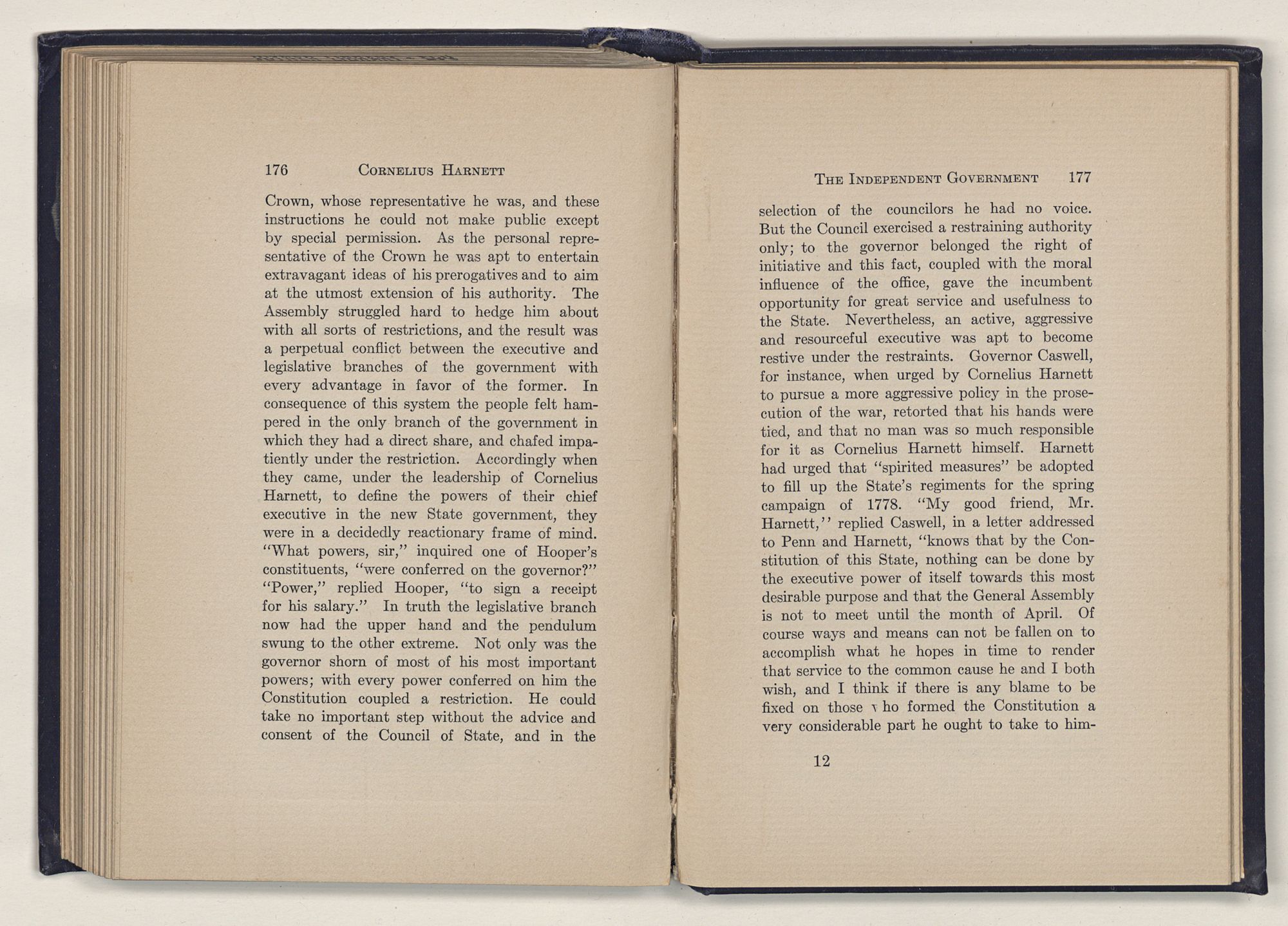 of the British Crown in all of which Harnett sat for Wilmington. His legislative career covered a period of twenty-seven years, embracing service in the Colonial Assembly, in the Provincial Congress, and in the Continental Congress. There was nothing dramatic about his career. He had no power, such as Hooper had, to stir men's passions with an outburst of eloquence, nor had he, like Caswell, the genius to inflame their imaginations by a brilliant military feat. Yet a careful and scholarly student, after a painstaking study of the records a century and a quarter after Harnett's death, unhesitatingly declared as his sober judgment: “To one who studies impartially the annals of this State during the last half of the eighteenth century, the conviction will become irresistible that the mightiest single force in North Carolina history during the whole of the Revolutionary period was Cornelius Harnett, of New Hanover county.”1