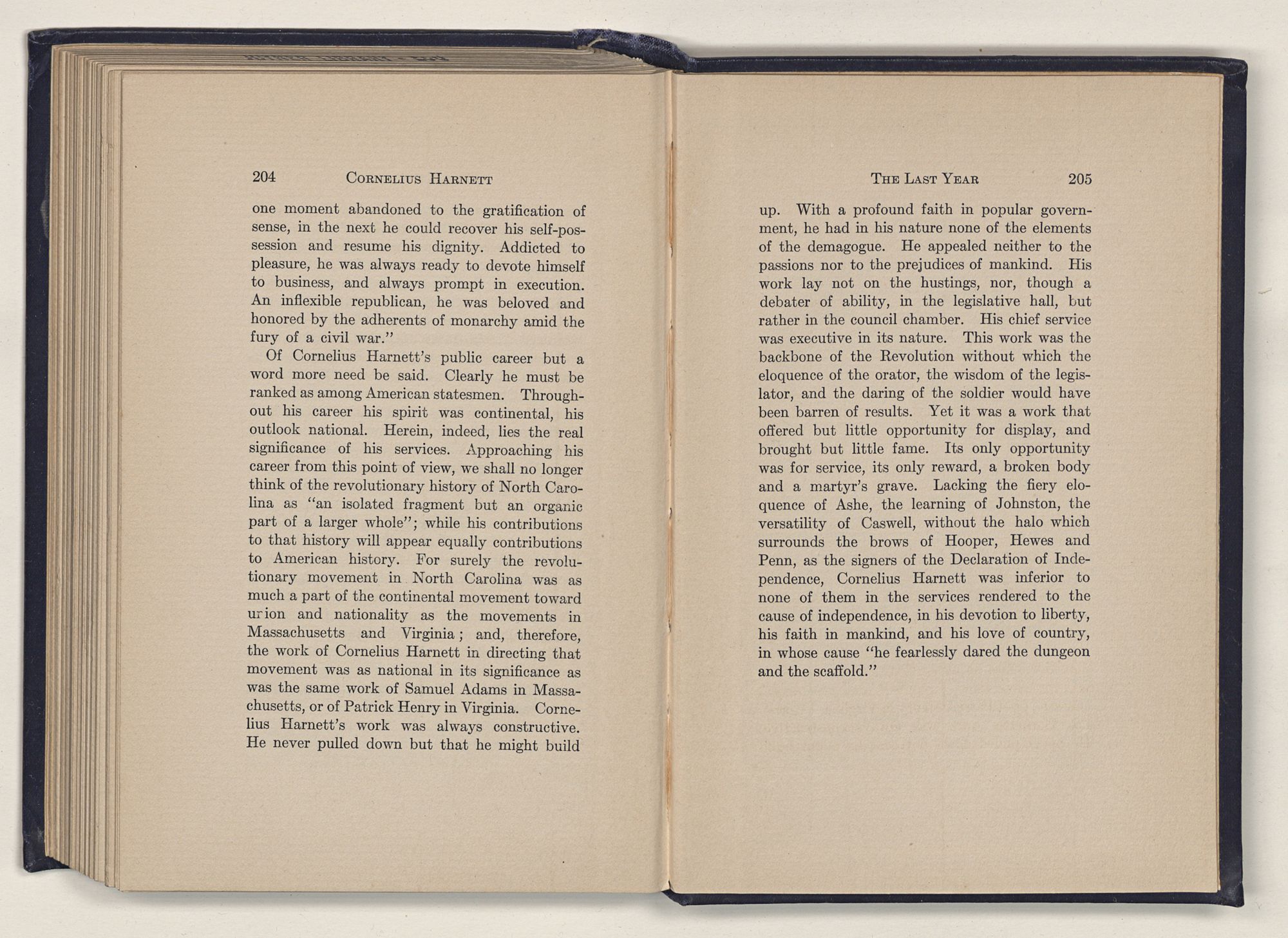 Of Cornelius Harnett as a political leader, Archibald Maclaine Hooper says: “In his private transactions he was guided by a spirit of probity, honor and liberality: and in his political career he was animated by an ardent and enlightened and disinterested zeal for liberty,