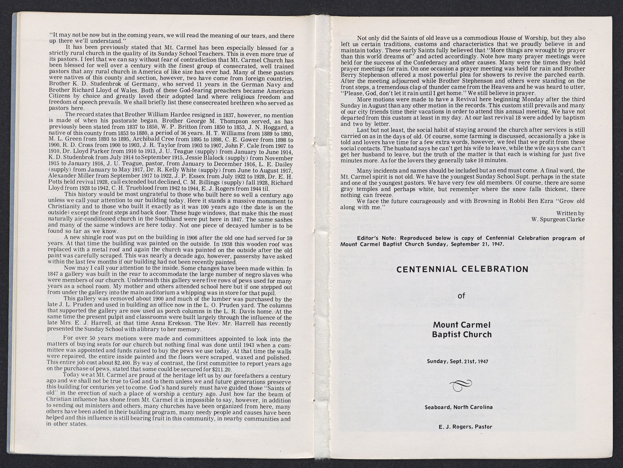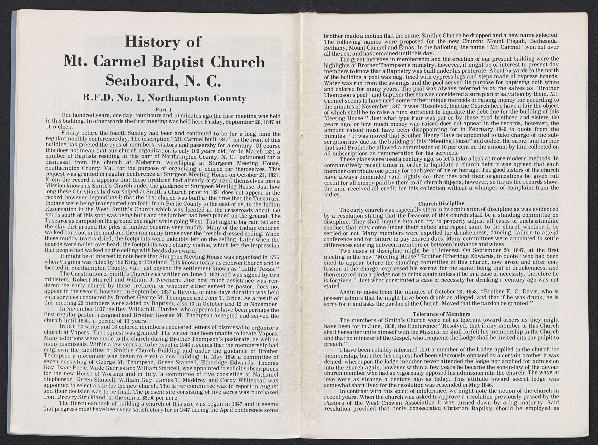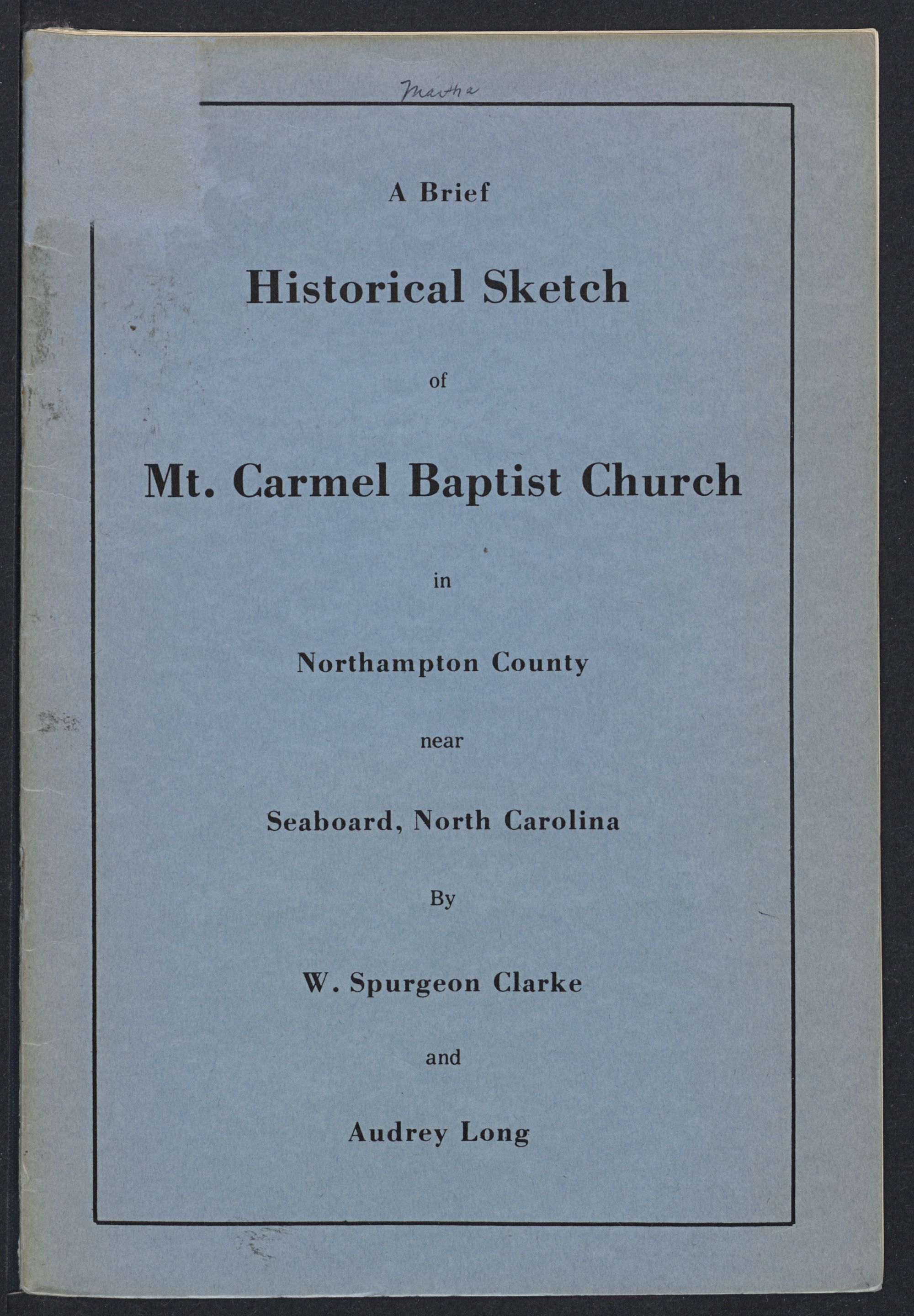 A brief historical sketch of Mt. Carmel Baptist Church in Northampton County near Seaboard, North Carolina / by W. Spurgeon Clarke and Audrey Long. [Seaboard?, N.C. : The Church?, 1947?] [14] p. : ill. ; 23 cm. Cover title.