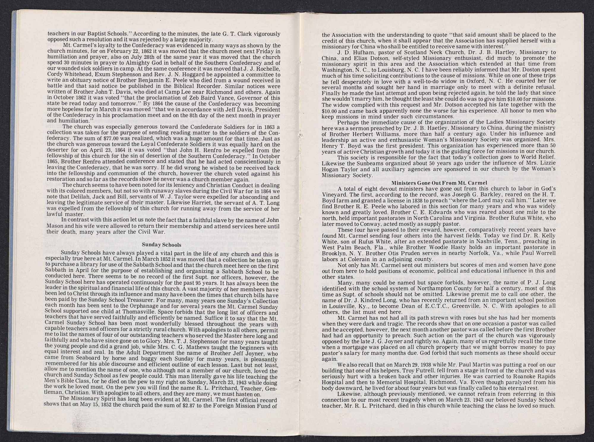 Sunday Schools have always played a vital part in the life of any church and this is especially true here at Mt. Carmel. In March 1852 it was moved that a collection be taken up to purchase a library for use of the Sabbath School and that the church meet here on the first Sabbath in April for the purpose of establishing and organizing a Sabbath School to be conducted here. There seems to be no record of the first Supt. nor officers, however, the Sunday School here has operated continuously for the past 95 years. It has always been the leader in the spiritual and financial life of this church. A vast majority of her members have been led to Christ through its influence and many have been the times that church bills have been paid by the Sunday School Treasurer. For many, many years one Sunday's Collection each month has been sent to the Orphanage and for several years the Mt. Carmel Sunday School supported one child at Thomasville. Space forbids that the long list of officers and teachers that have served faithfully and efficiently be named. Suffice it to say that the Mt. Carmel Sunday School has been most wonderfully blessed throughout the years with capable teachers and officers for a strictly rural church. With apologies to all others, permit me to list the names of four of our outstanding teachers who served the Master here long and faithfully and who have since gone on to Glory. Mrs. T. J. Stephenson for many years taught the young people and did a grand job, while Mrs. C. G. Mathews taught the beginners with equal interest and zeal. In the Adult Department the name of Brother Jeff Joyner, who came from Seaboard by horse and buggy each Sunday for many years, is pleasantly remembered for his able discourse and efficient outline of each lesson. Last but not least, allow me to mention the name of one, who although not a member of our church, loved the church and Sunday School as few people could. This man literally gave his life teaching the Men's Bible Class, for he died on the pew to my right on Sunday, March 23, 1943 while doing the work he loved most. On the pew you will find the name R. L. Pritchard, Teacher, Gentleman, Christian. With apologies to all others, and they are many, we must hasten on.