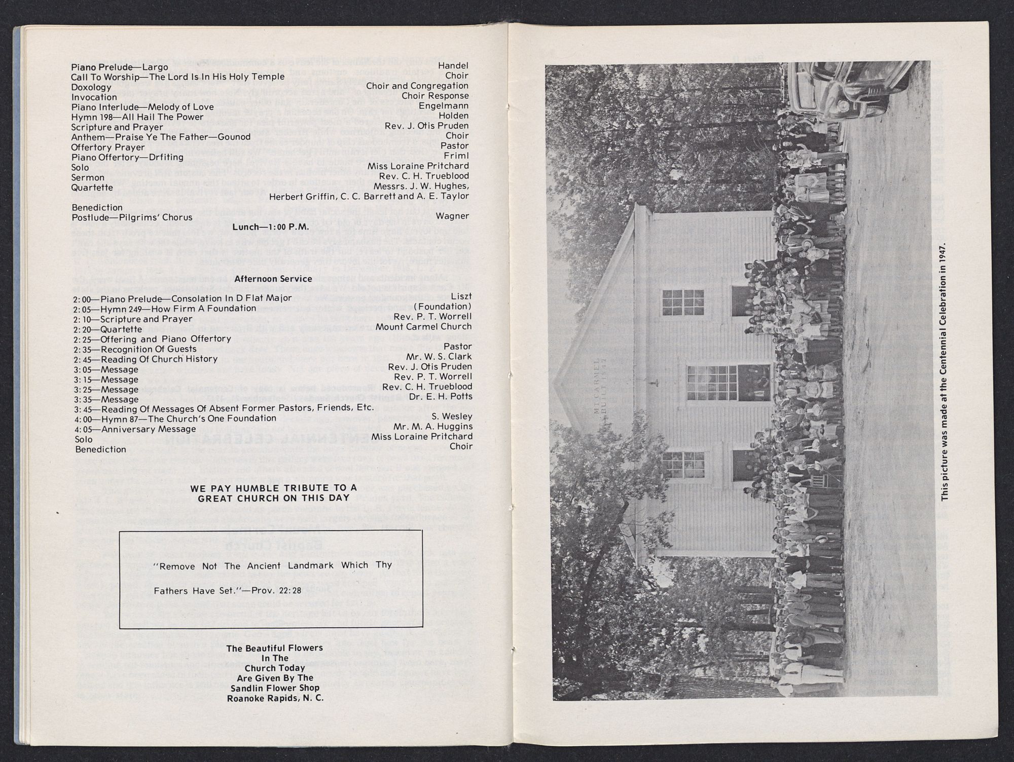 Editor's Note: Reproduced below is copy of Centennial Celebration program of Mount Carmel Baptist Church Sunday, September 21, 1947.