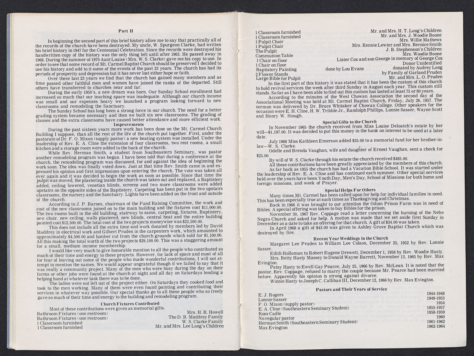 July 1965 Rev. Max Evington resigned as pastor of Mt. Carmel Church to become full-time pastor of Jackson Church. His resignation was to become effective as of September 30, 1965. Realizing what Rev. Evington had done for our church we regretted his resignation but were happy that Jackson could move to a full-time ministry.