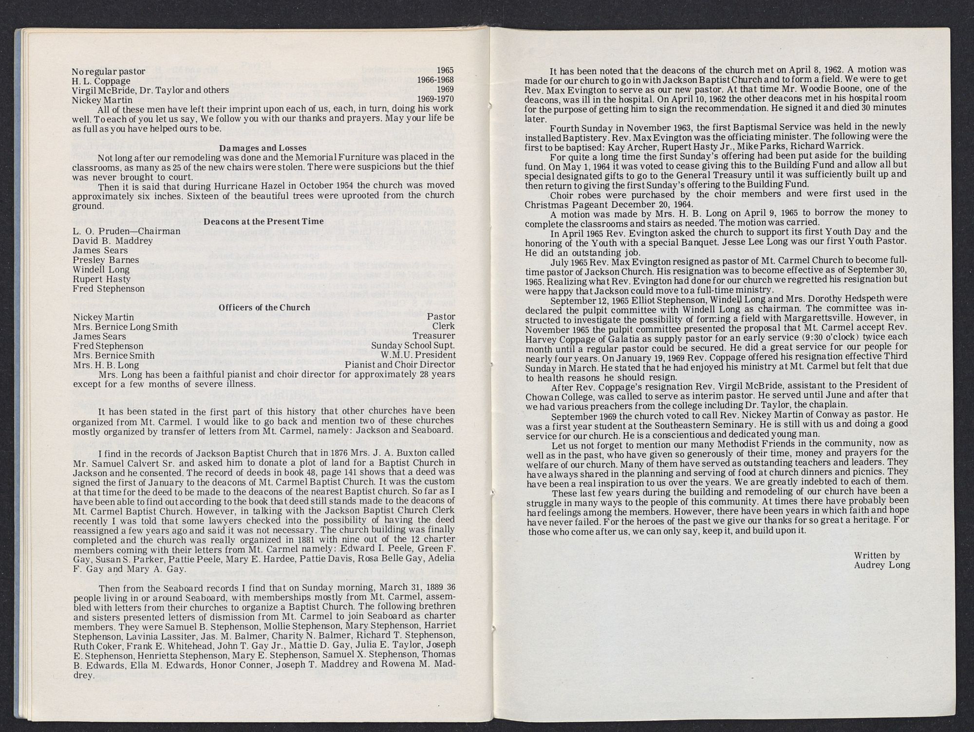 A Brief Historical Sketch of Mount Carmel Baptist ChurchinNorthampton CountynearSeaboard, North CarolinaBYW. Spurgeon ClarkeandAudrey Long