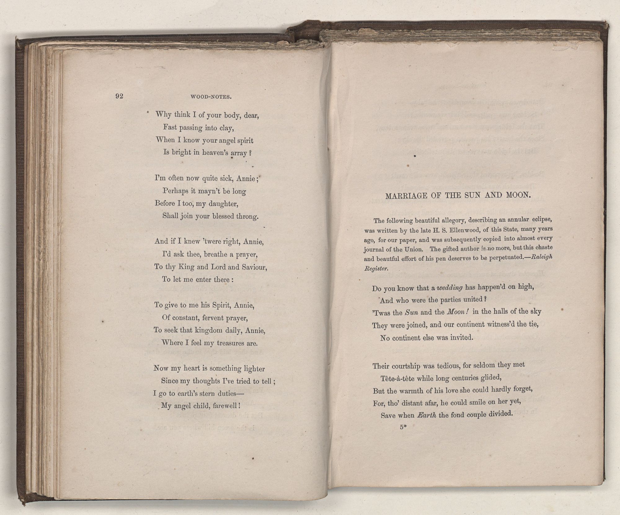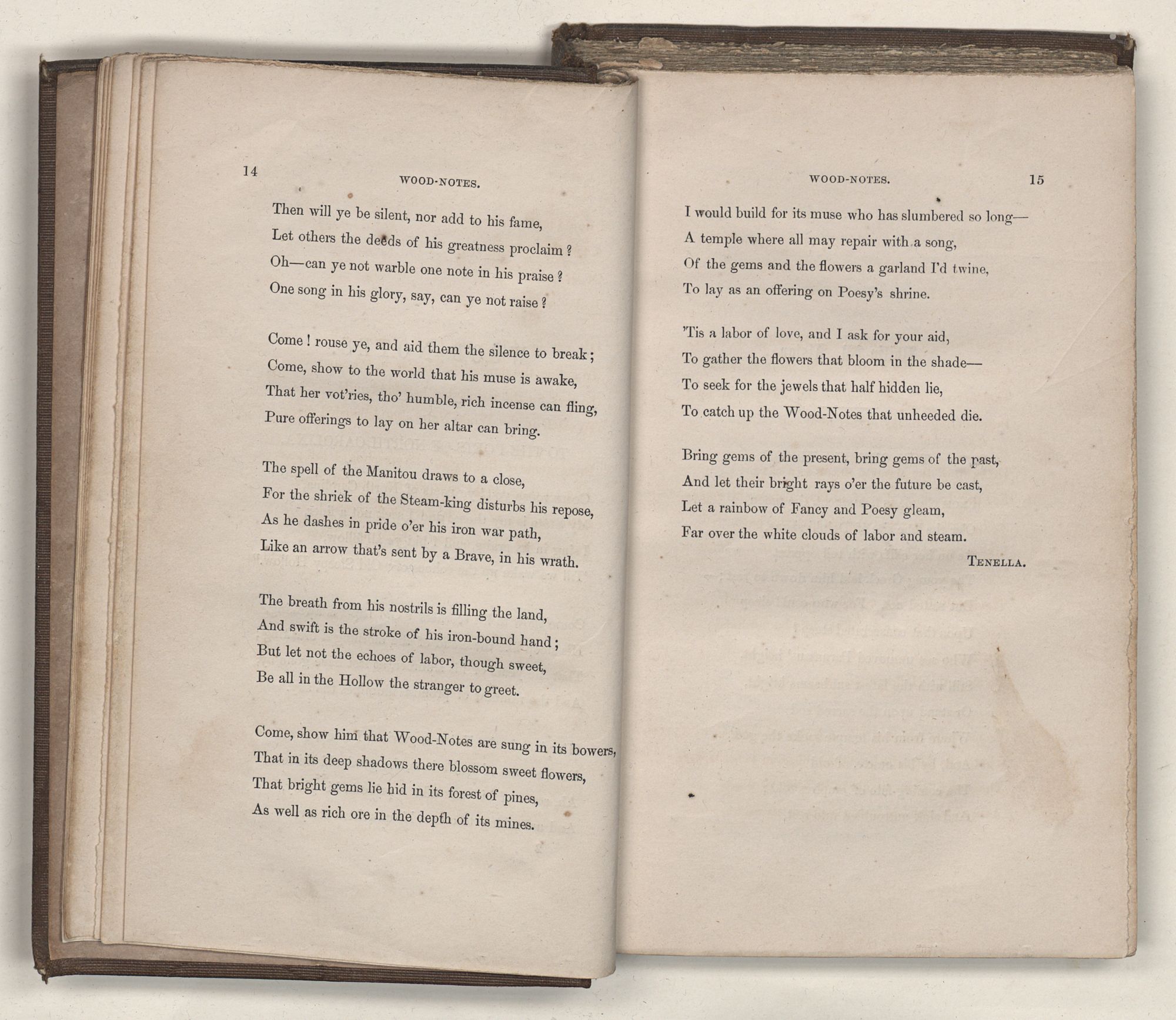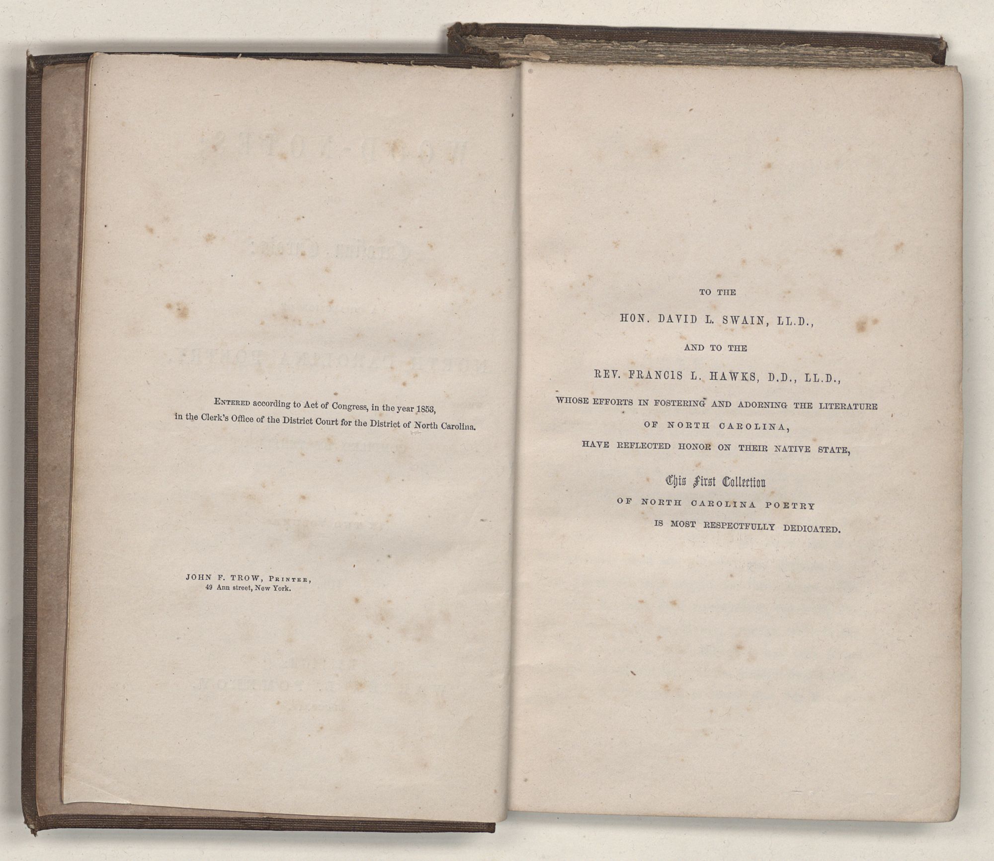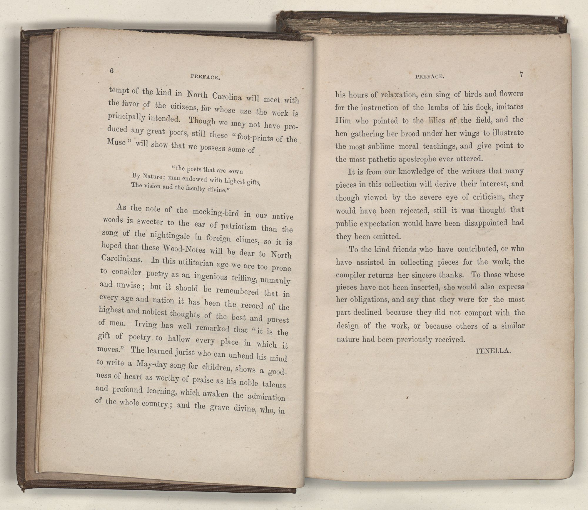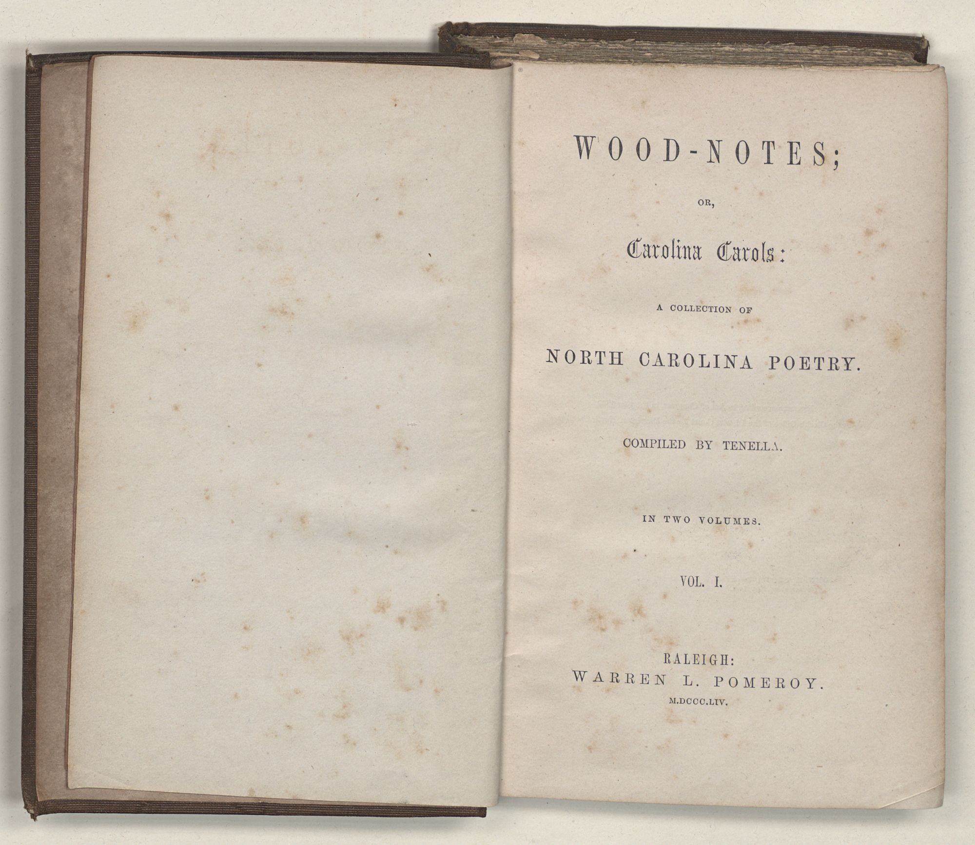 WOOD-NOTES;OR, Carolina Carols: A COLLECTION OF NORTH CAROLINA POETRY.COMPILED BY TENELLA. IN TWO VOLUMES. VOL. I.RALEIGH:WARREN L. POMEROY.M.DCCC.LIV.