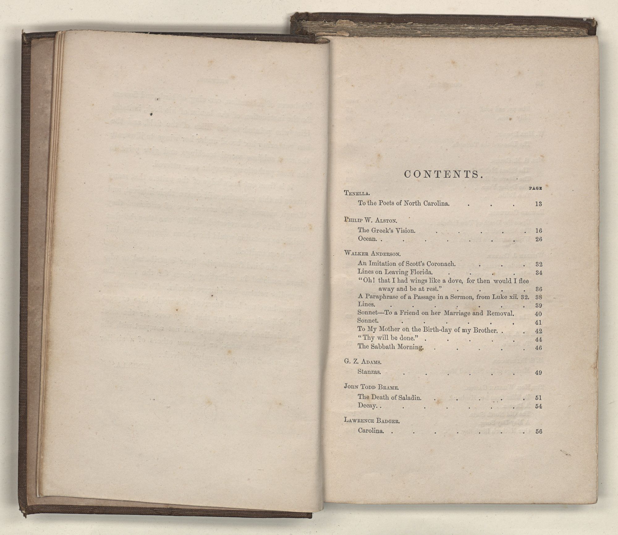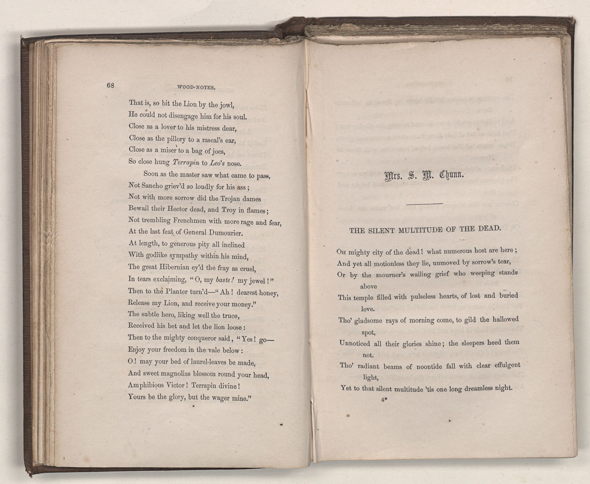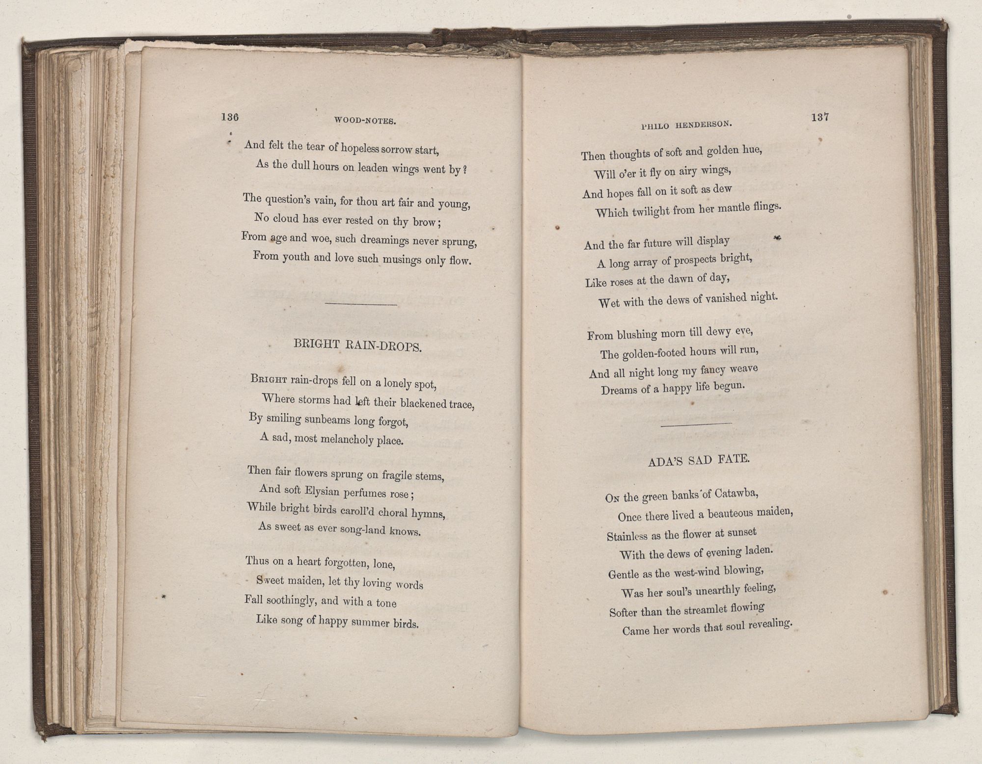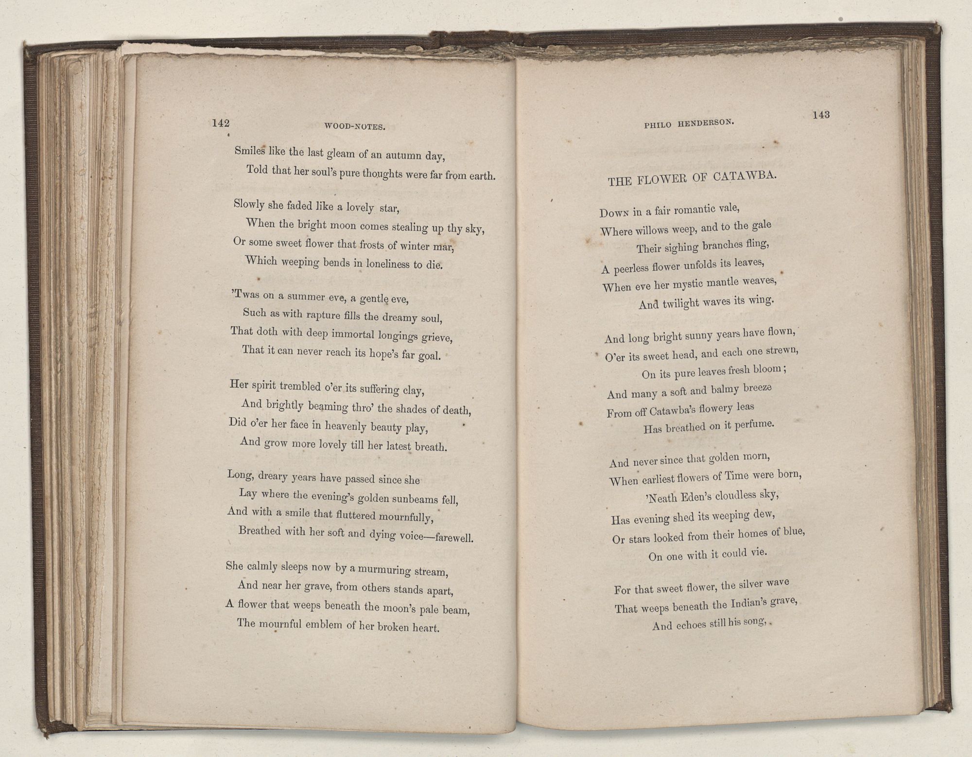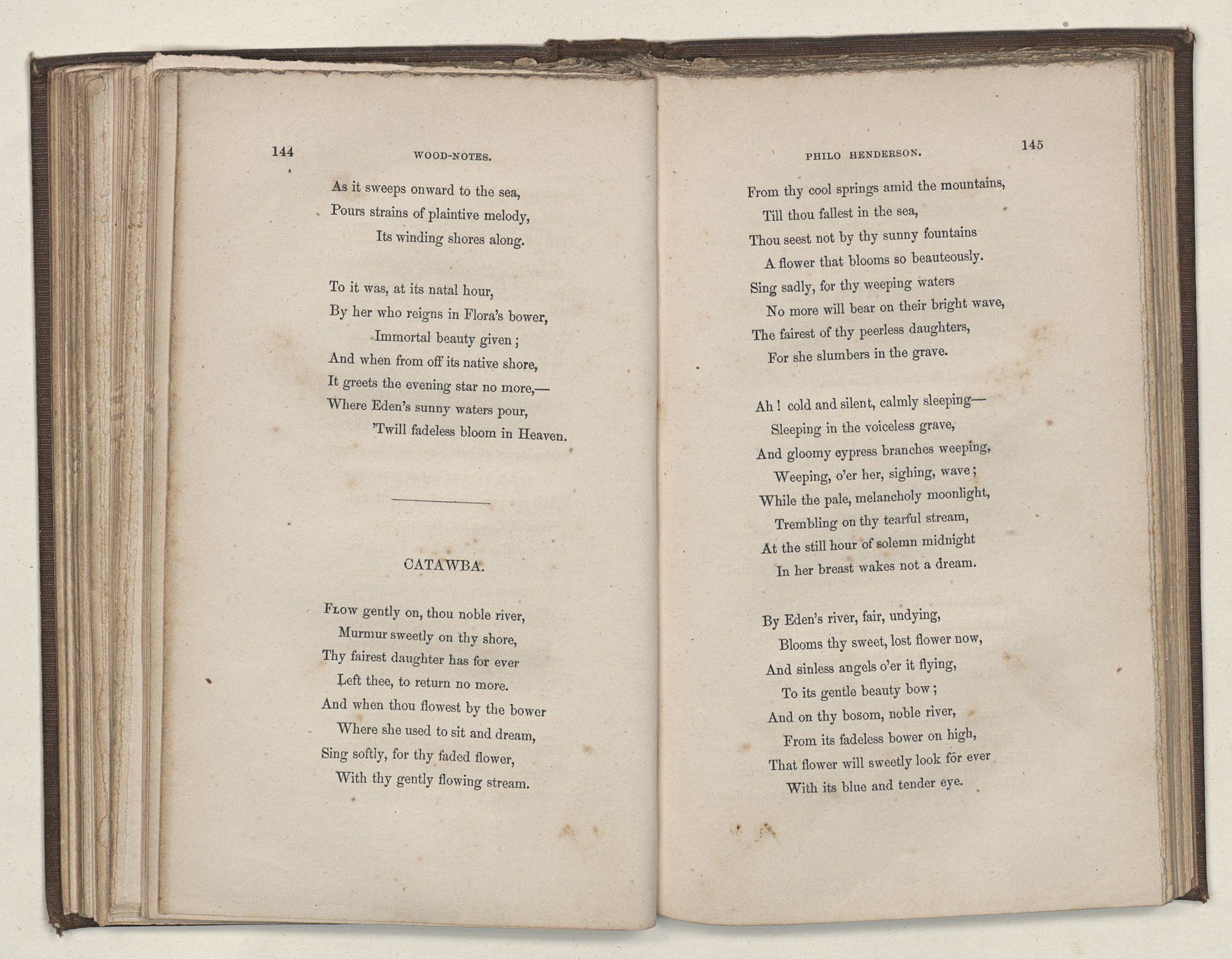 WOOD-NOTES;OR, Carolina Carols: A COLLECTION OF NORTH CAROLINA POETRY.COMPILED BY TENELLA. IN TWO VOLUMES. VOL. I.RALEIGH:WARREN L. POMEROY.M.DCCC.LIV.