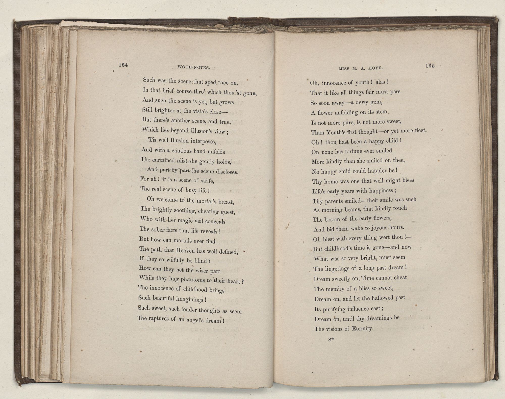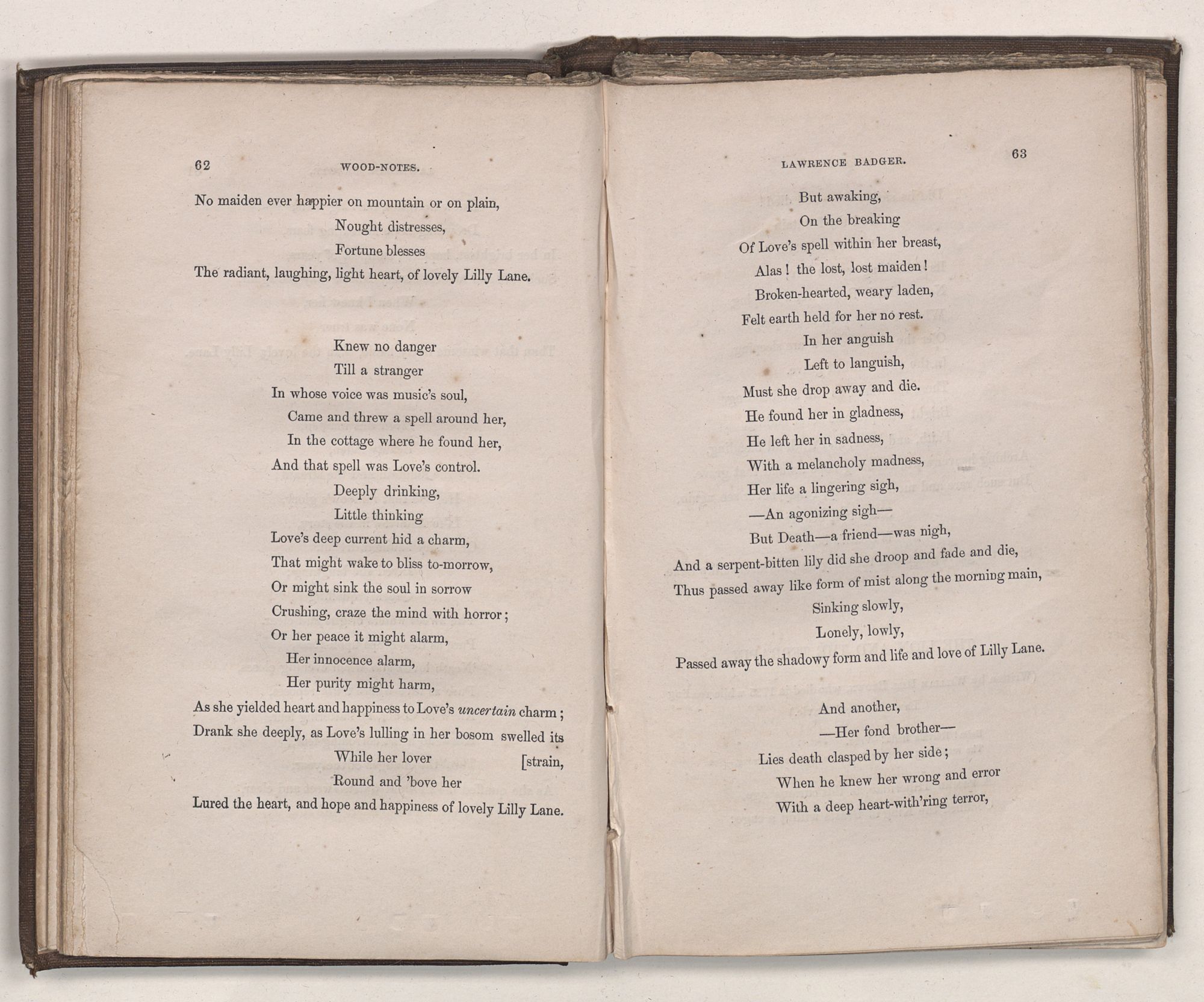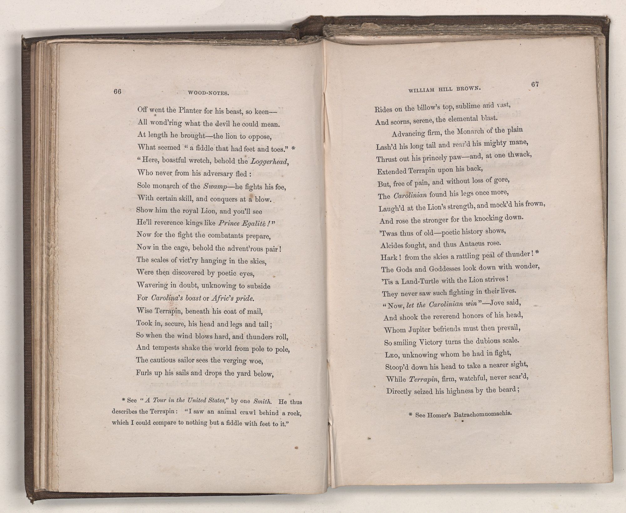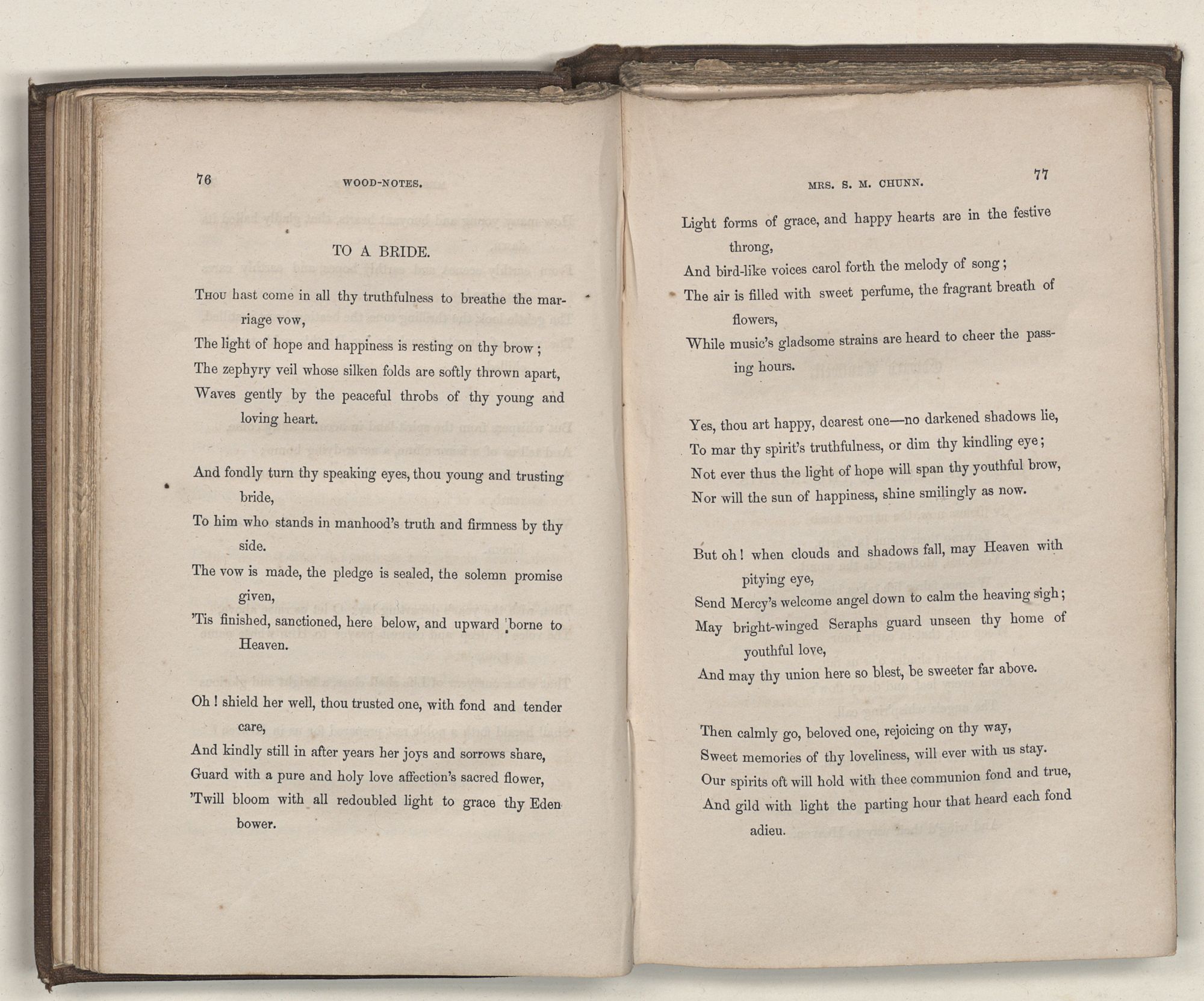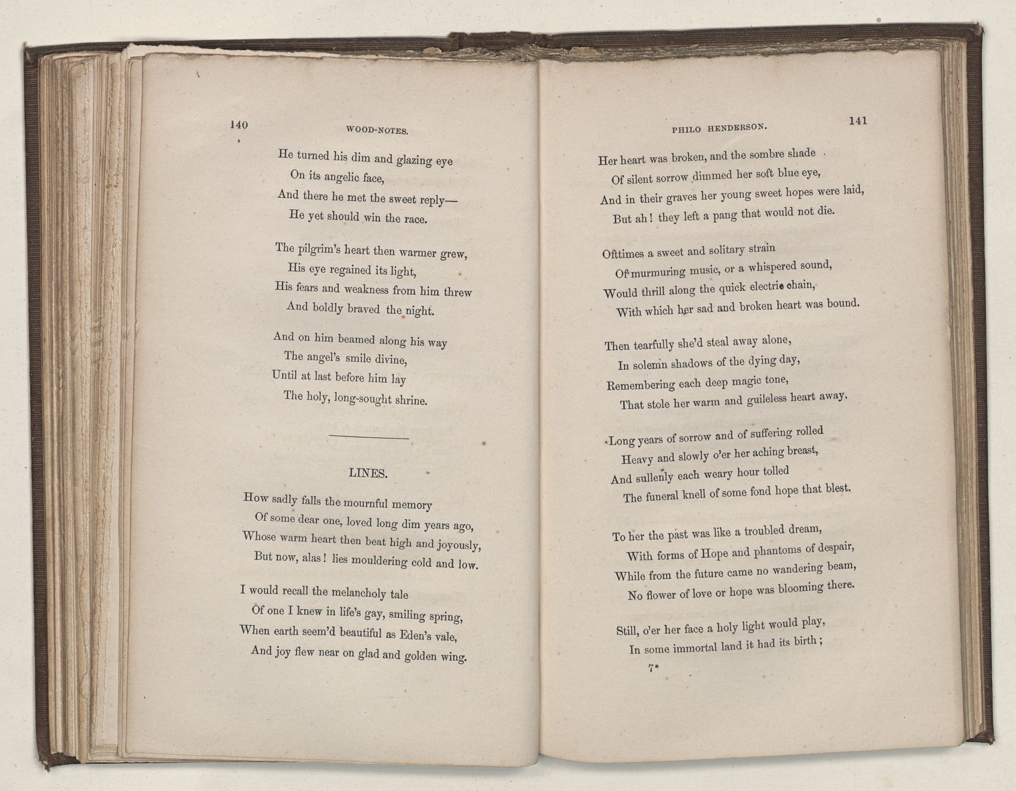 WOOD-NOTES;OR, Carolina Carols: A COLLECTION OF NORTH CAROLINA POETRY.COMPILED BY TENELLA. IN TWO VOLUMES. VOL. I.RALEIGH:WARREN L. POMEROY.M.DCCC.LIV.