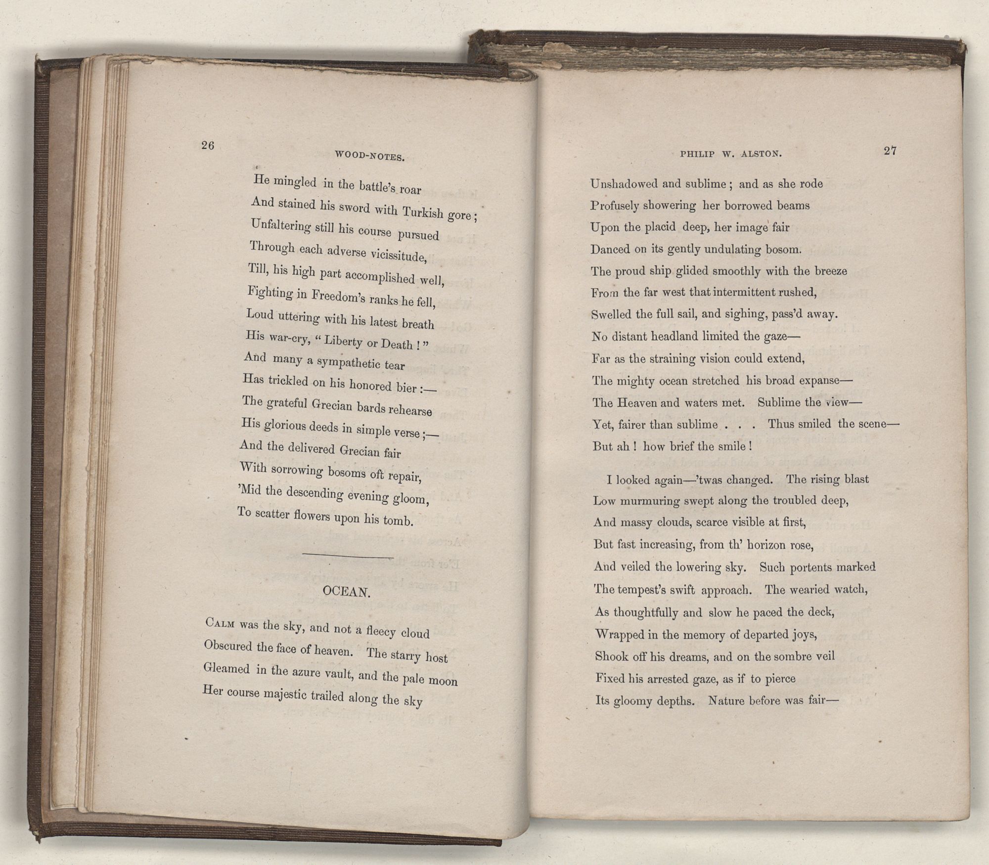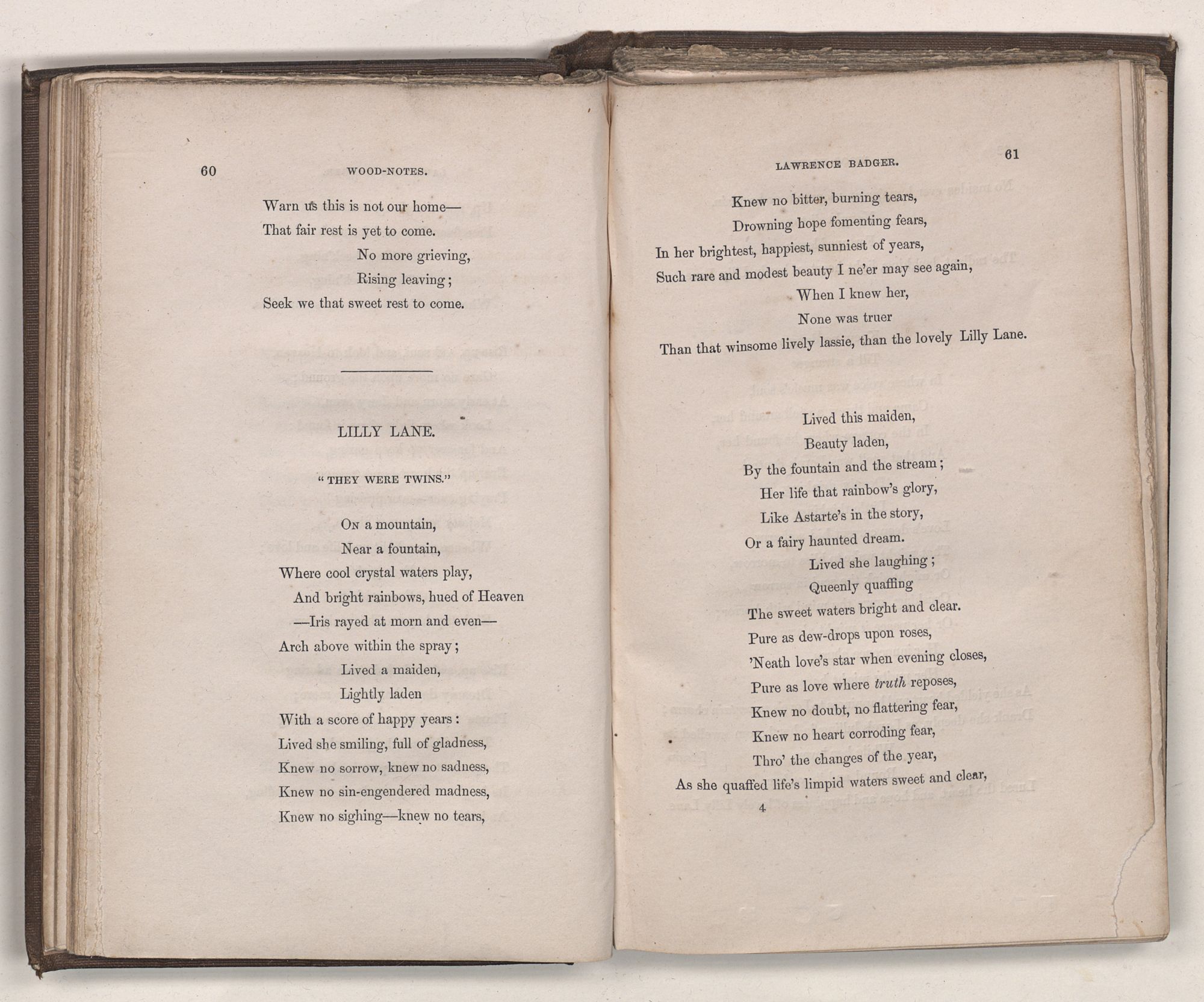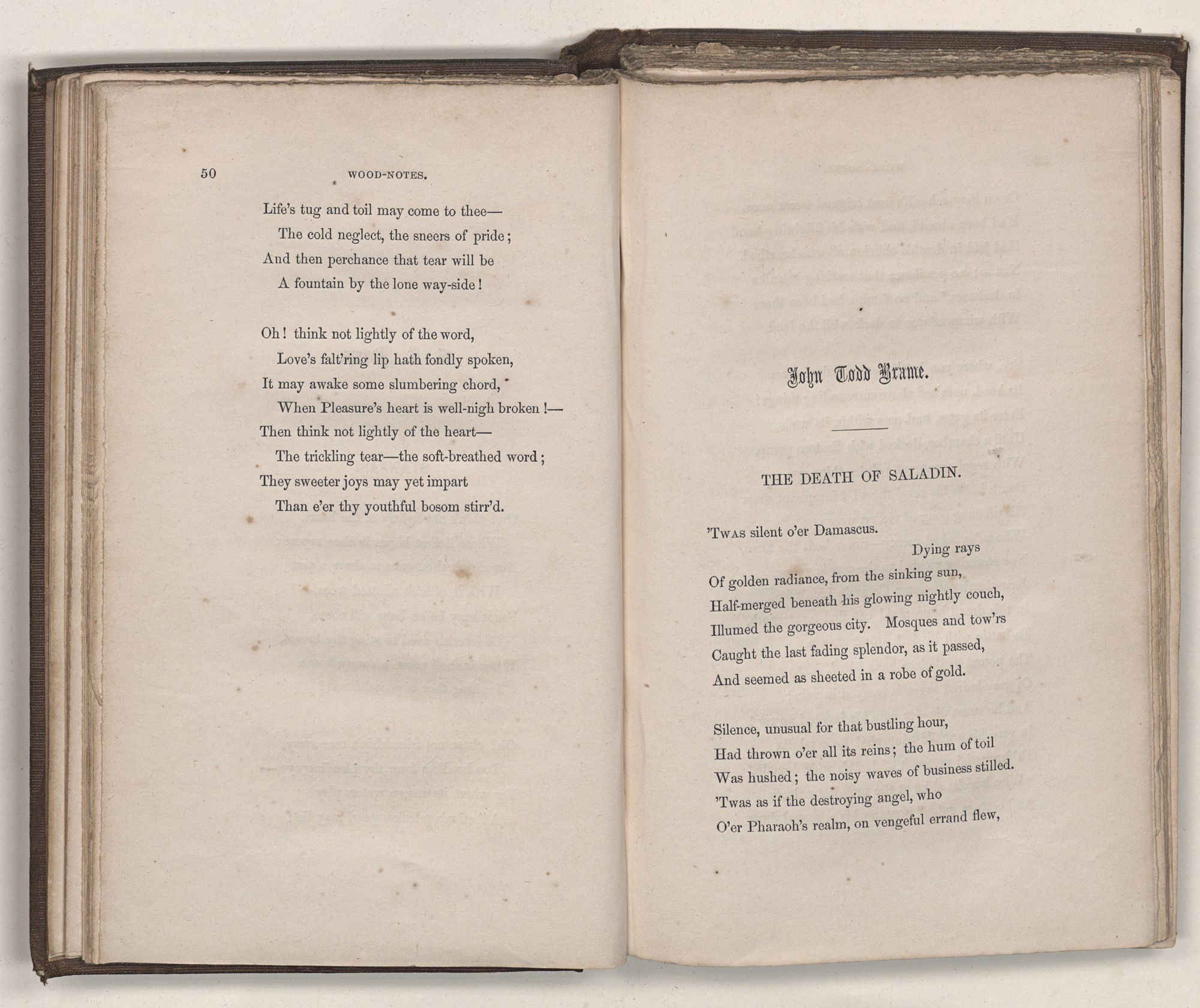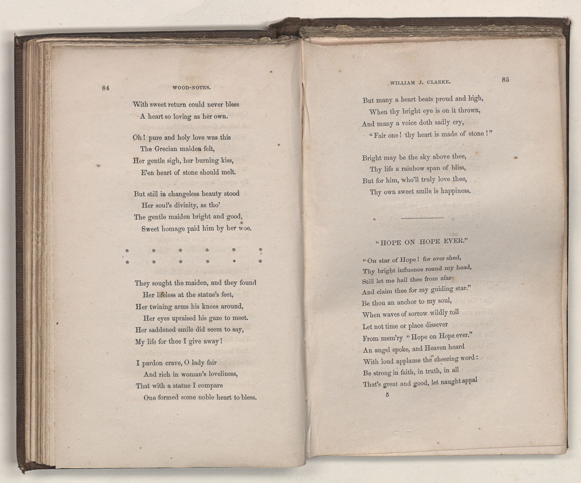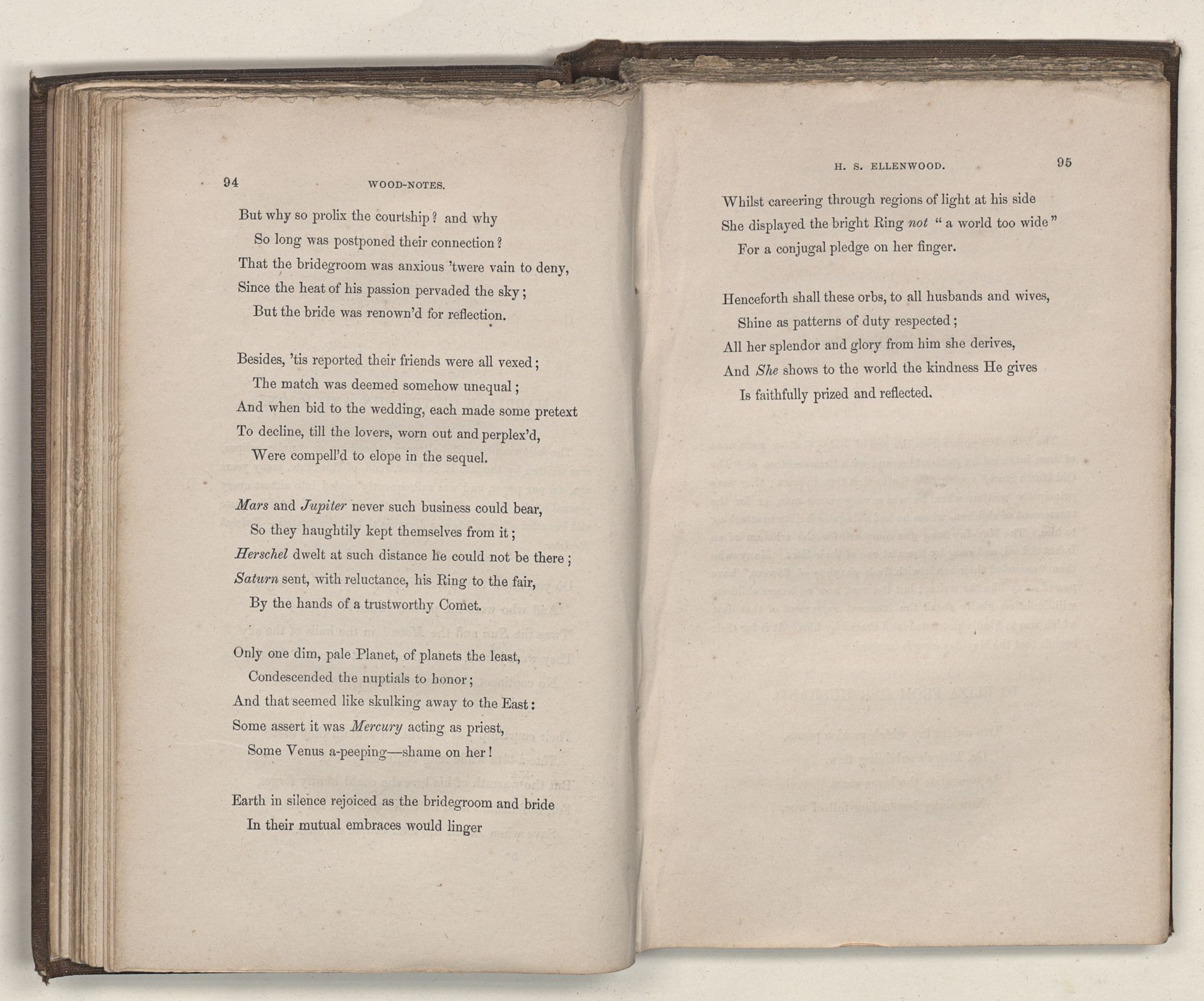 WOOD-NOTES;OR, Carolina Carols: A COLLECTION OF NORTH CAROLINA POETRY.COMPILED BY TENELLA. IN TWO VOLUMES. VOL. I.RALEIGH:WARREN L. POMEROY.M.DCCC.LIV.