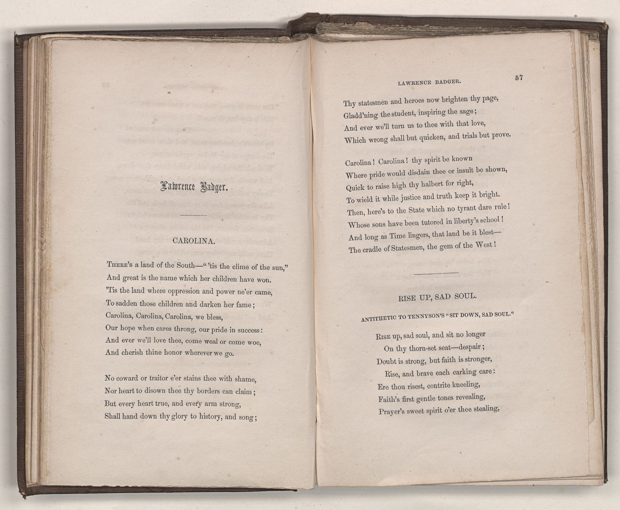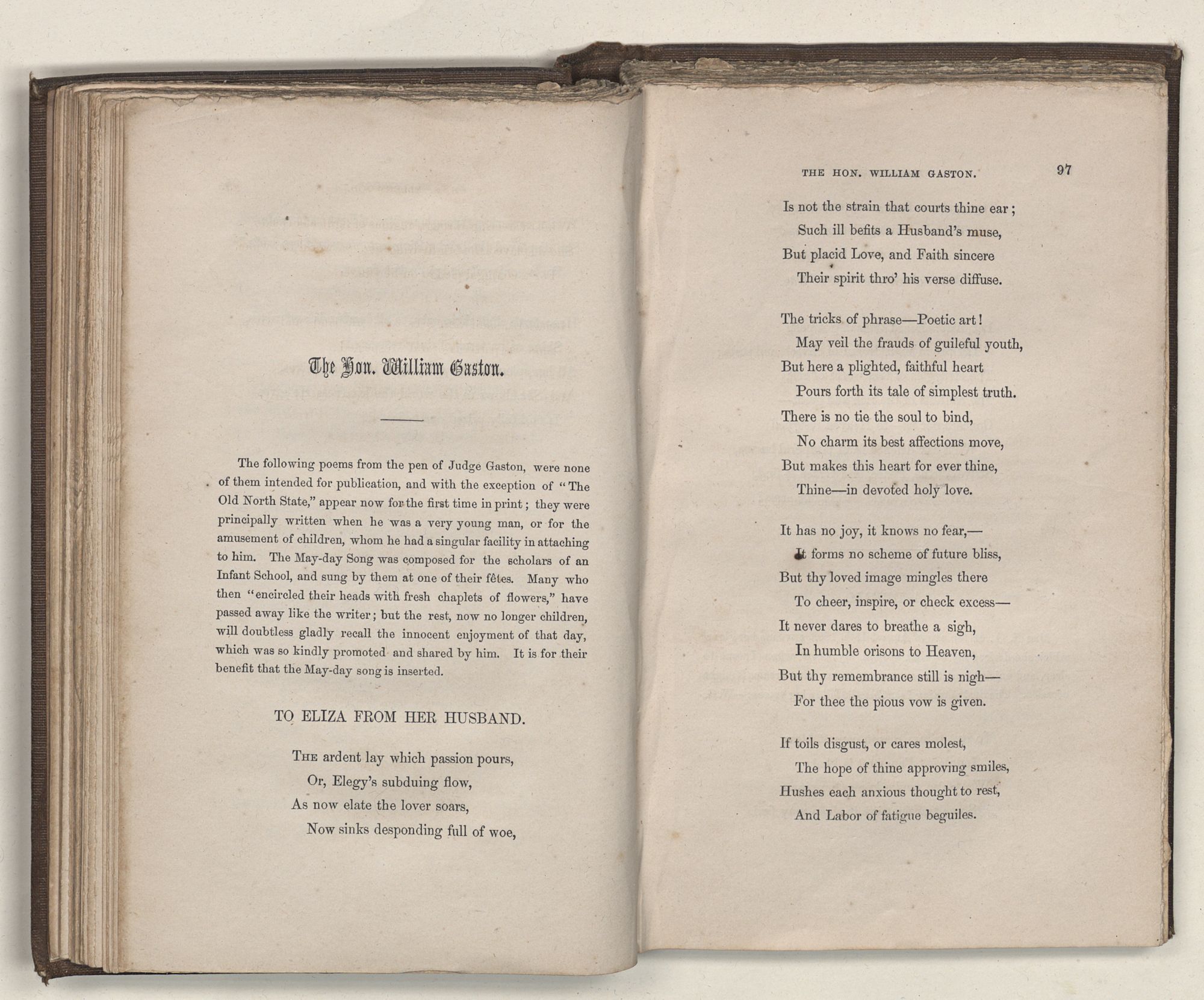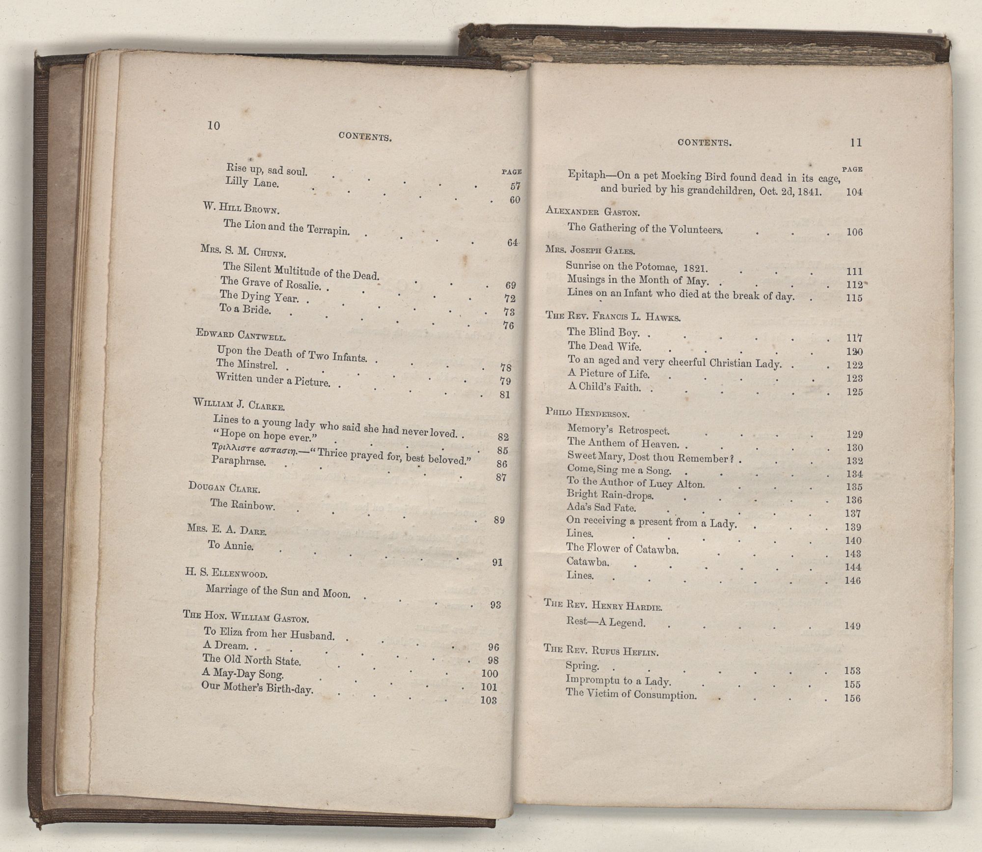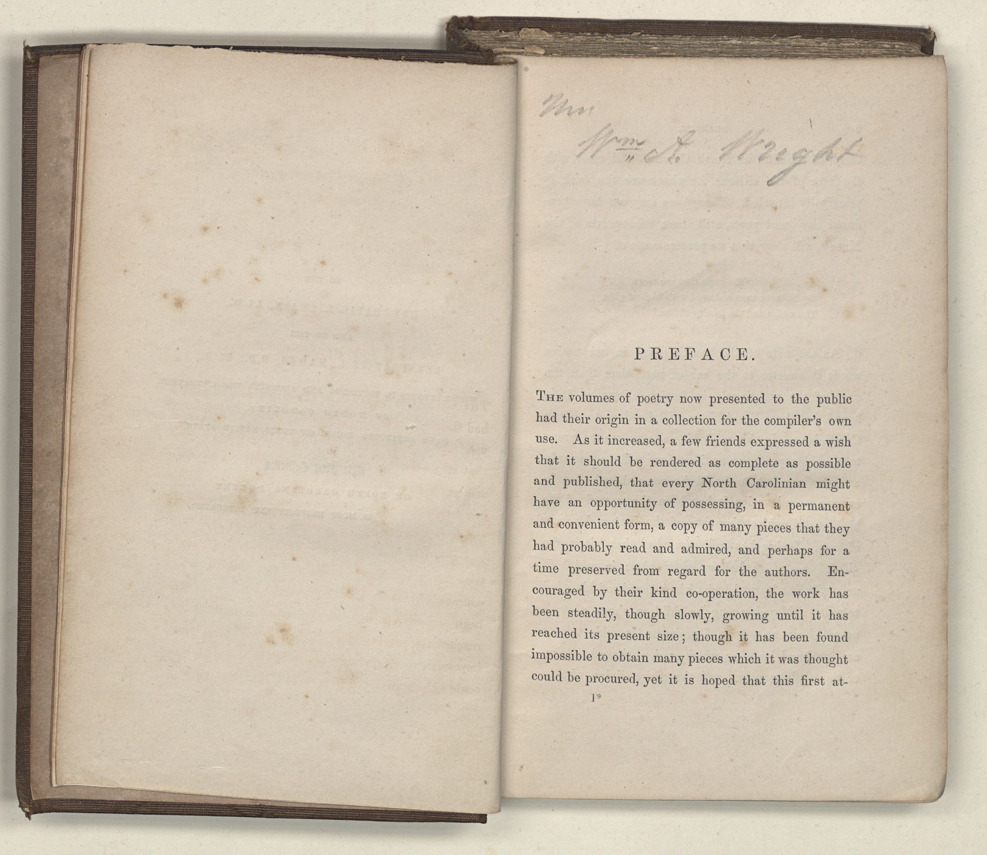 THE volumes of poetry now presented to the public had their origin in a collection for the compiler's own use. As it increased, a few friends expressed a wish that it should be rendered as complete as possible and published, that every North Carolinian might have an opportunity of possessing, in a permanent and convenient form, a copy of many pieces that they had probably read and admired, and perhaps for a time preserved from regard for the authors. Encouraged by their kind co-operation, the work has been steadily, though slowly, growing until it has reached its present size; though it has been found impossible to obtain many pieces which it was thought could be procured, yet it is hoped that this first attempt