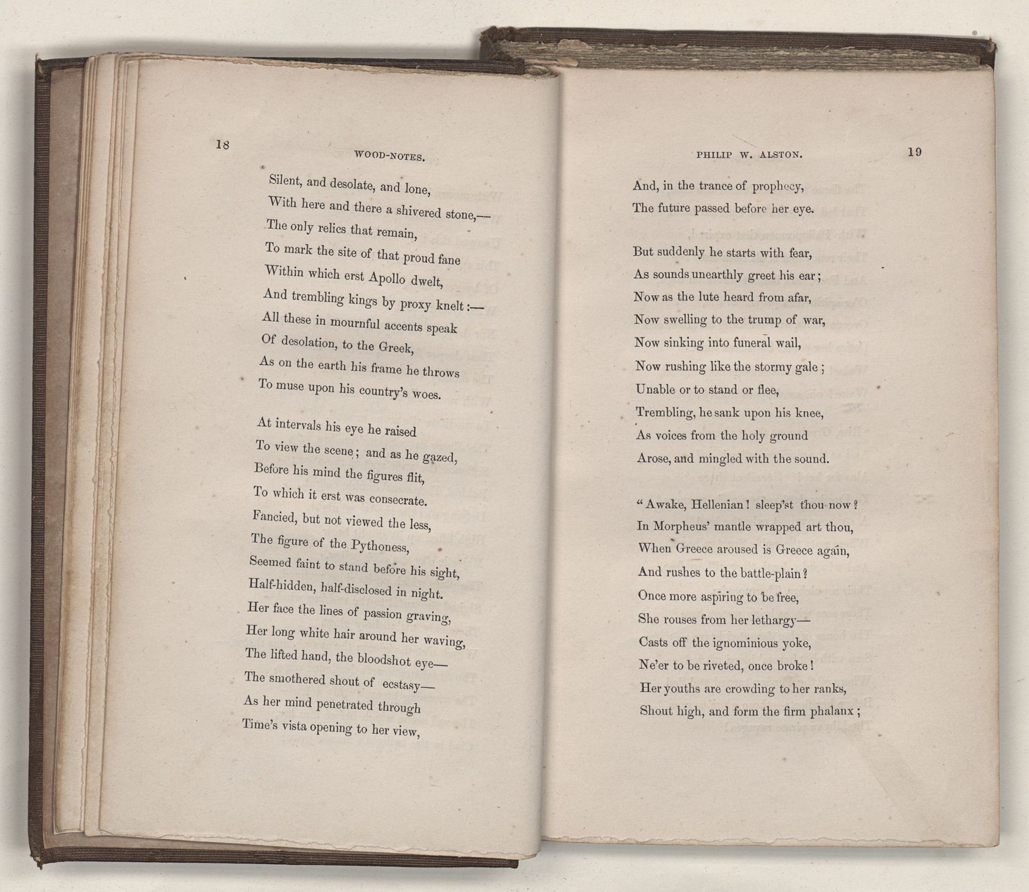 With creeping vines, that stands beside the brook;Where'er the mistress moves the fowls alwayFlock round her shining tunic, and the jayWith all his might sings in the apple-tree;While round their gourd-built domes the martins play,A happy group;—and Plenty smiles to seeHer golden harvest wave, her lambs bound o'er the lea.The stage horn sounds,—and mounts the weary heelThat steep, tall road, it climbs year after year;Above its blasted pines the vultures wheel,Crossing the waste, light-footed bounds the deer;Beyond a single mountain doth appear,Piercing the haughty clouds to reach a climeWhere dwells serenity, that calm and clear,And beautiful as thoughts that shine thro’ time,Far in the silent deep, sits on his brows sublime.The country suits devotion. Ancient rocksTower up from sacred groves—the aged oakStands like a priest of Heaven, with hoary locks—The sounding earth rolls off the silvery strokeOf bell-tongued brooks, as when they first awokeThe woods and passing angels stopped to hear;The flowers look up unstained by city smoke;No hordes of iron-hearted men appear,But Nature, full of God, bids Truth and Peace draw near.Here let me live, and give myself to God,Companioned with his Spirit, and when HeRecalls my life, place me beneath the sodThat skirts the brook, where flowers come up to seeEach other's pleasant faces, and the beeThro’ the long day works in the bright sunshine:There let me rest alone, my God, with Thee!The sun, the stars, the universe are thine;Great Father, wilt thou hear this lowly prayer of mine!This is the land of Poesy, for hereGreen slopes, dark glens, and mountains fill the soul,And brooks and rills that shine, then disappearIn glades, where sunny paths to caverns stroll—Tall sounding pines—the far-off cataract's roll,And groves that end in forests dark and deep;The cliff where stands the wolf—the grassy knollCrowning the meadow, bright with flowers that peepInto melodious streams, that by farm-houses creep.Sweet Poesy! brightest of heavenly things!How seldom dost thou deign to visit men!Homer and Milton—Shakespeare swept thy strings,Each with such power that Time astonished then,Ever despaired of matching such; but whenNature on Bailey's mind exhausted thought,