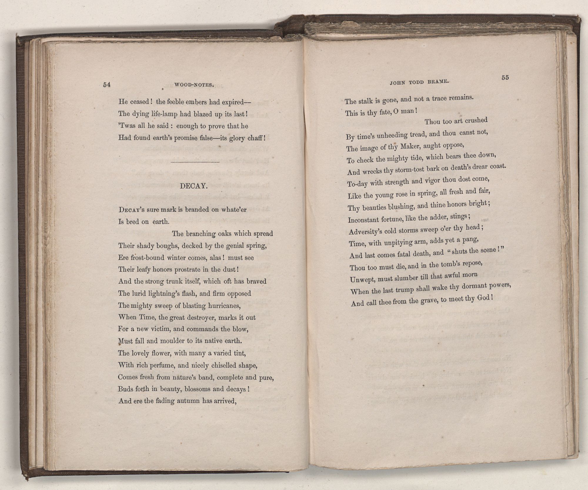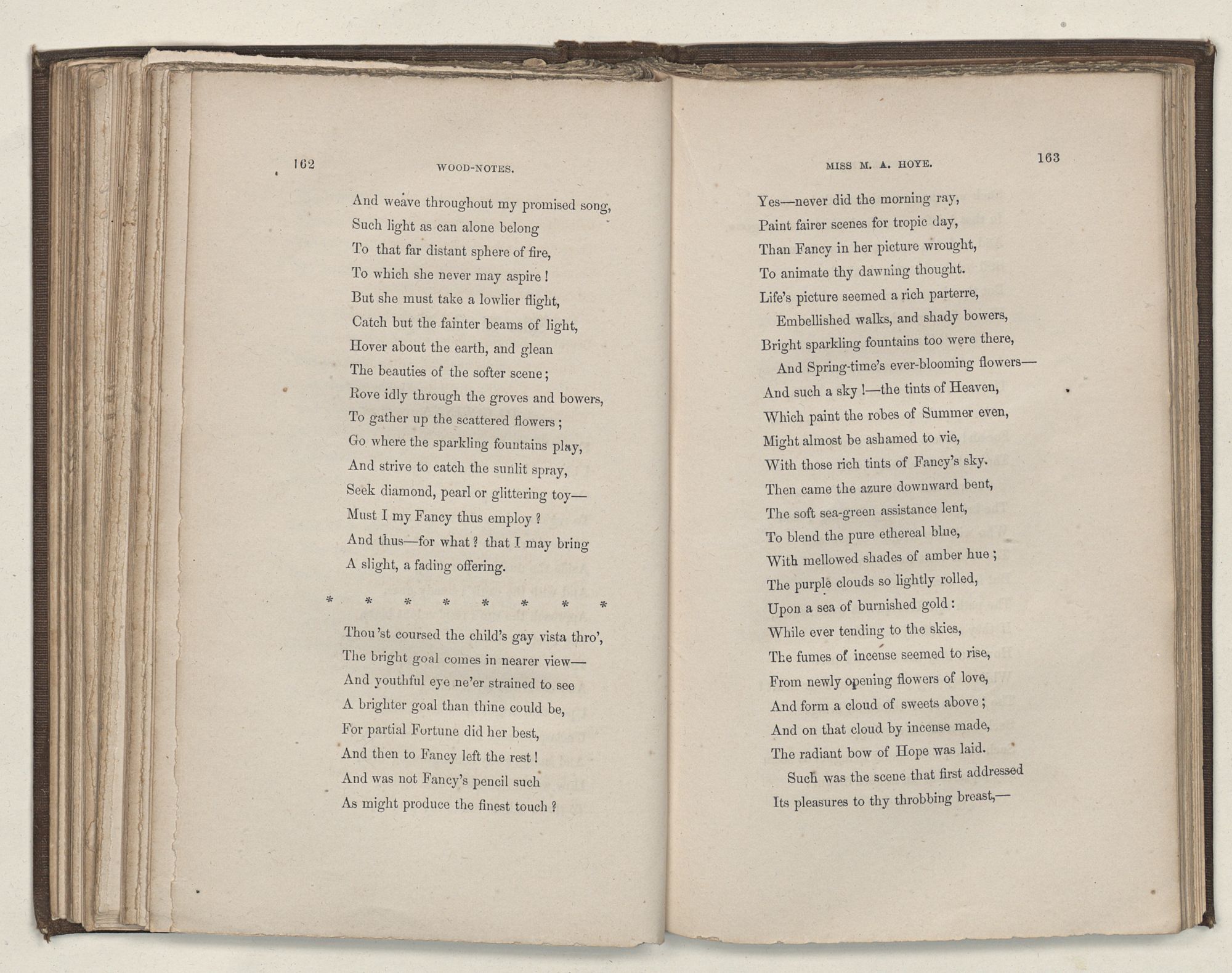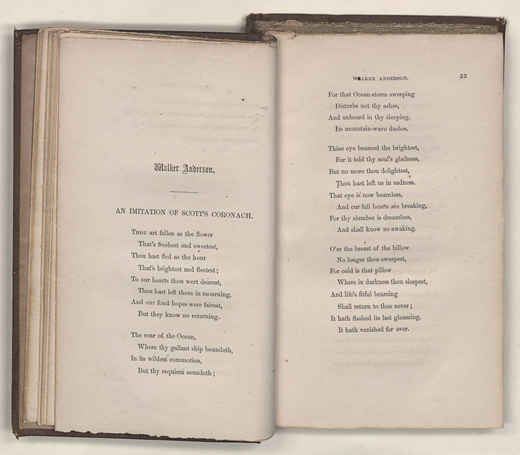 And weave throughout my promised song,Such light as can alone belongTo that far distant sphere of fire,To which she never may aspire!But she must take a lowlier flight,Catch but the fainter beams of light,Hover about the earth, and gleanThe beauties of the softer scene;Rove idly through the groves and bowers,To gather up the scattered flowers;Go where the sparkling fountains play,And strive to catch the sunlit spray,Seek diamond, pearl or glittering toy—Must I my Fancy thus employ?And thus—for what? that I may bringA slight, a fading offering.* * * * * * * *Thou'st coursed the child's gay vista thro’,The bright goal comes in nearer view—And youthful eye ne'er strained to seeA brighter goal than thine could be,For partial Fortune did her best,And then to Fancy left the rest!And was not Fancy's pencil suchAs might produce the finest touch?Yes—never did the morning ray,Paint fairer scenes for tropic day,Than Fancy in her picture wrought,To animate thy dawning thought.Life's picture seemed a rich parterre,Embellished walks, and shady bowers,Bright sparkling fountains too were there,And Spring-time's ever-blooming flowers—And such a sky!—the tints of Heaven,Which paint the robes of Summer even,Might almost be ashamed to vie,With those rich tints of Fancy's sky.Then came the azure downward bent,The soft sea-green assistance lent,To blend the pure ethereal blue,With mellowed shades of amber hue;The purple clouds so lightly rolled,Upon a sea of burnished gold:While ever tending to the skies,The fumes of incense seemed to rise,From newly opening flowers of love,And form a cloud of sweets above;And on that cloud by incense made,The radiant bow of Hope was laid.Such was the scene that first addressedIts pleasures to thy throbbing breast,—