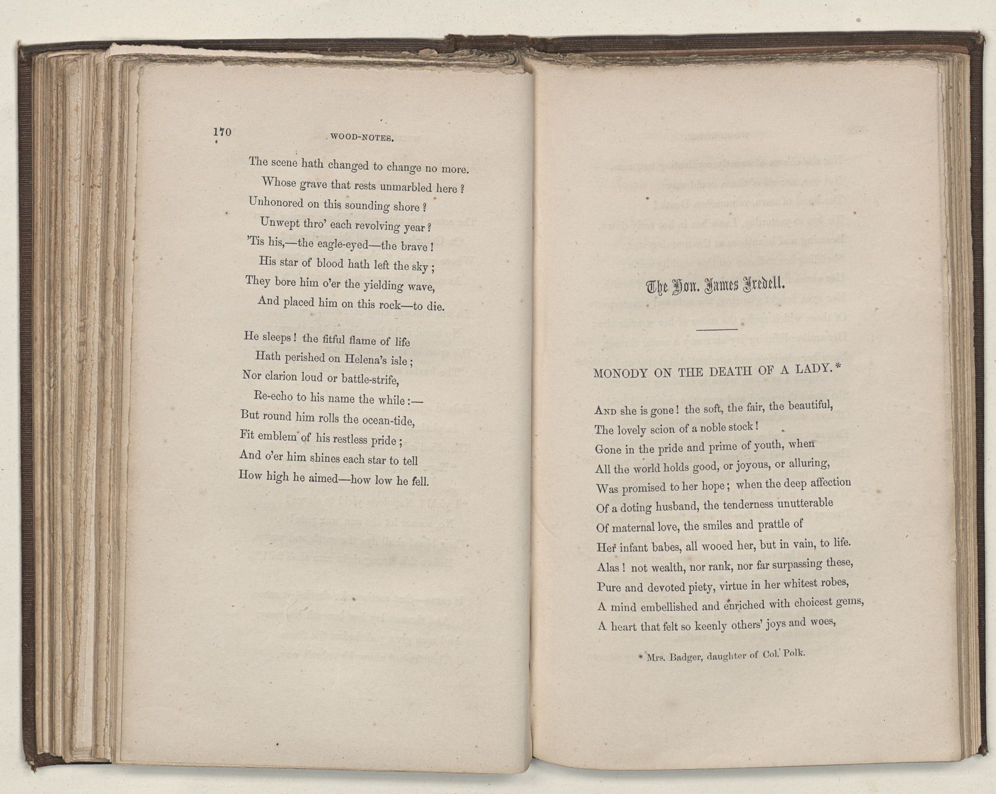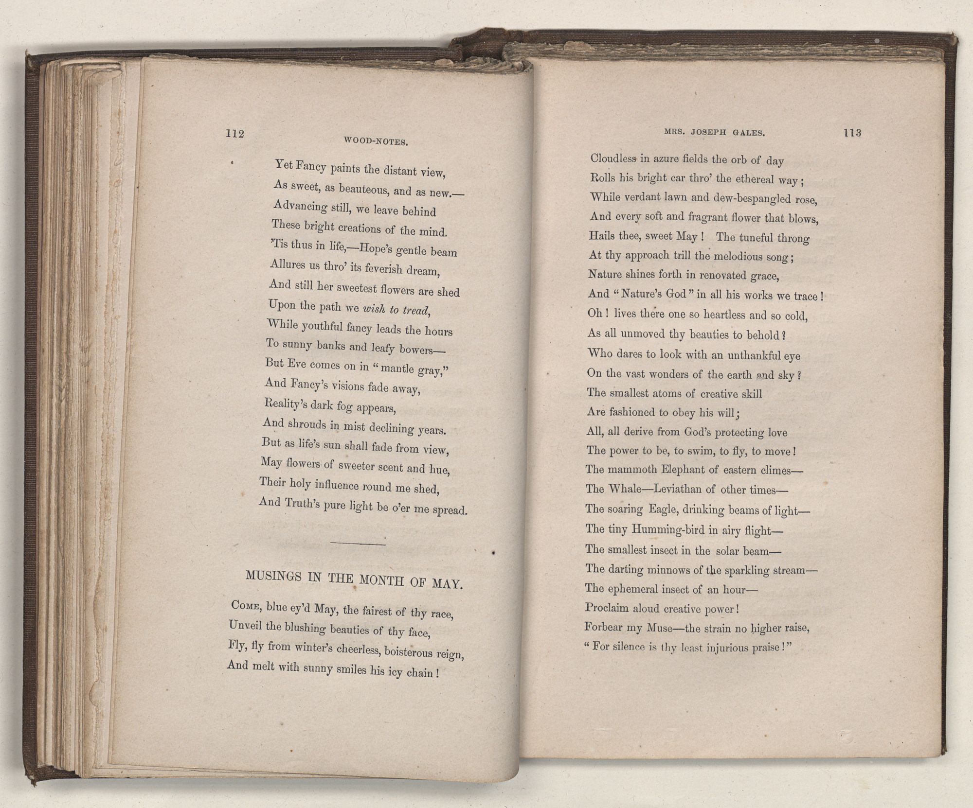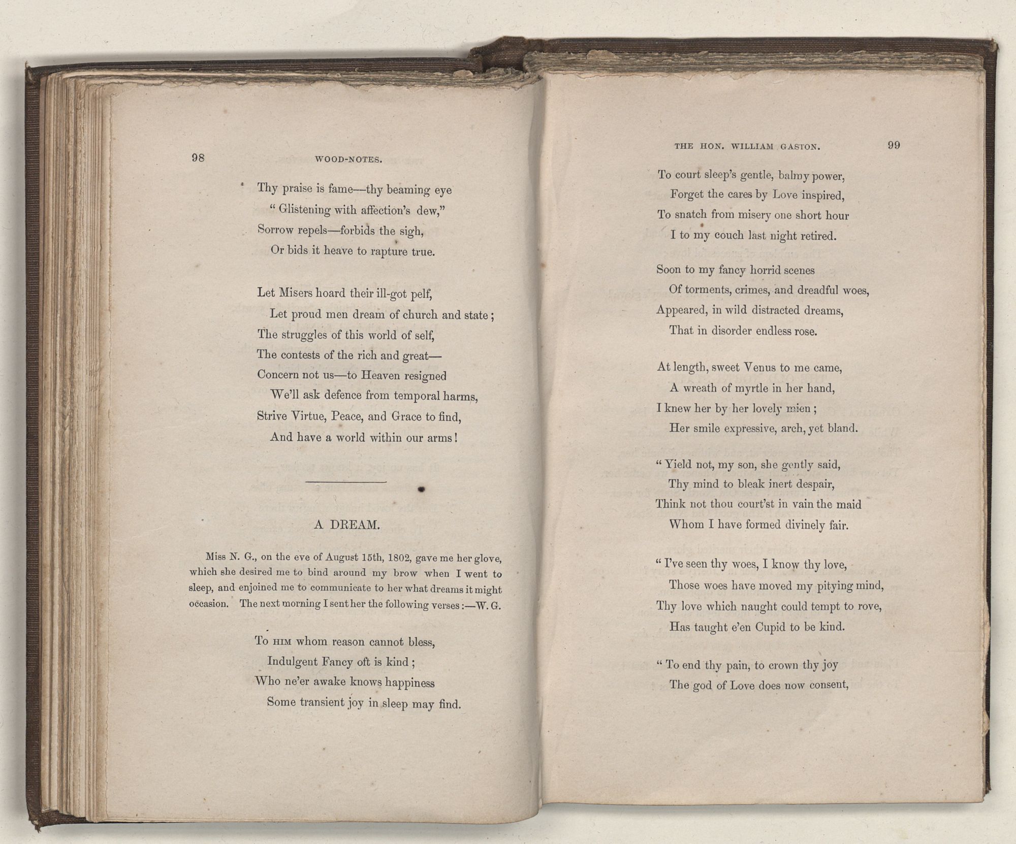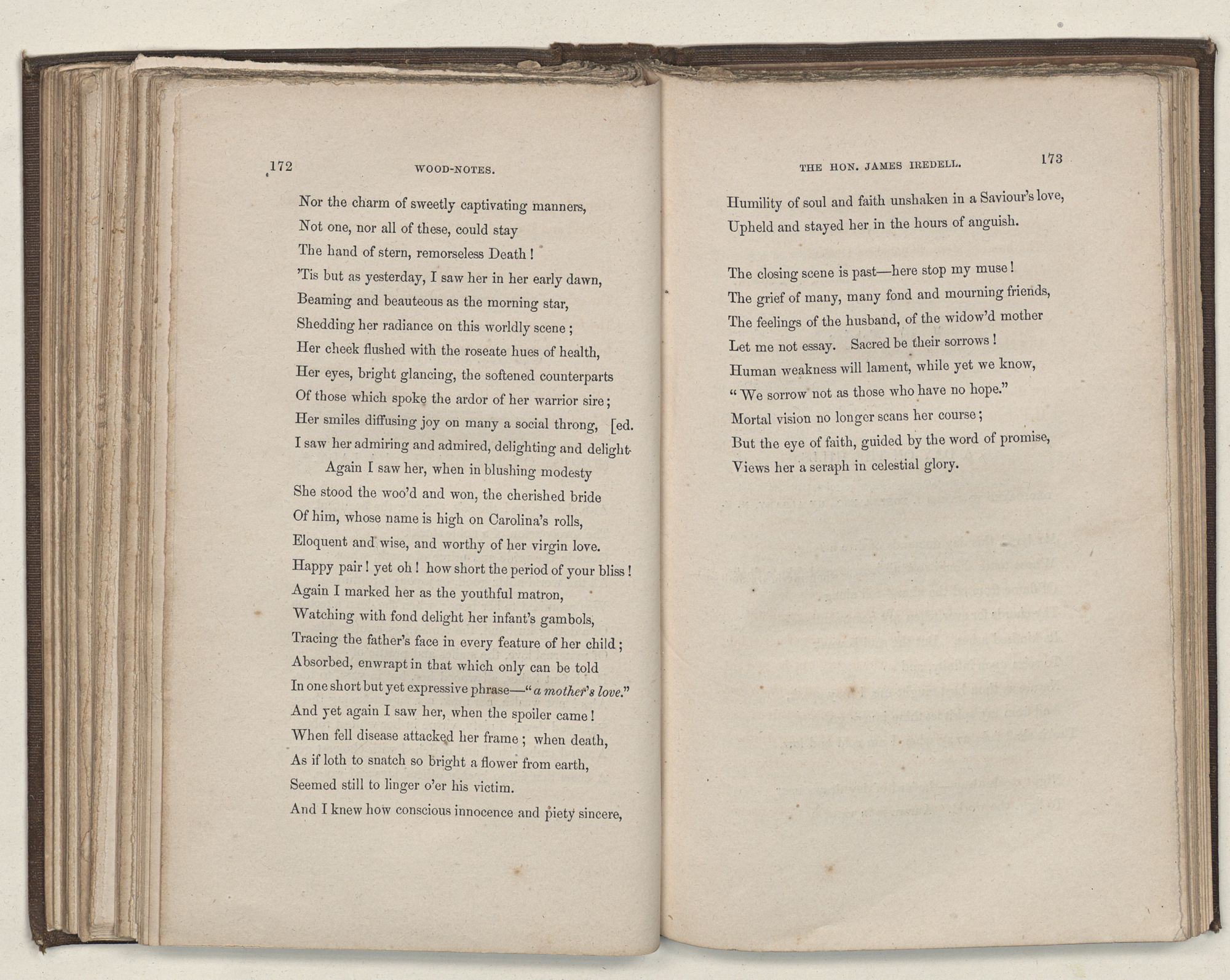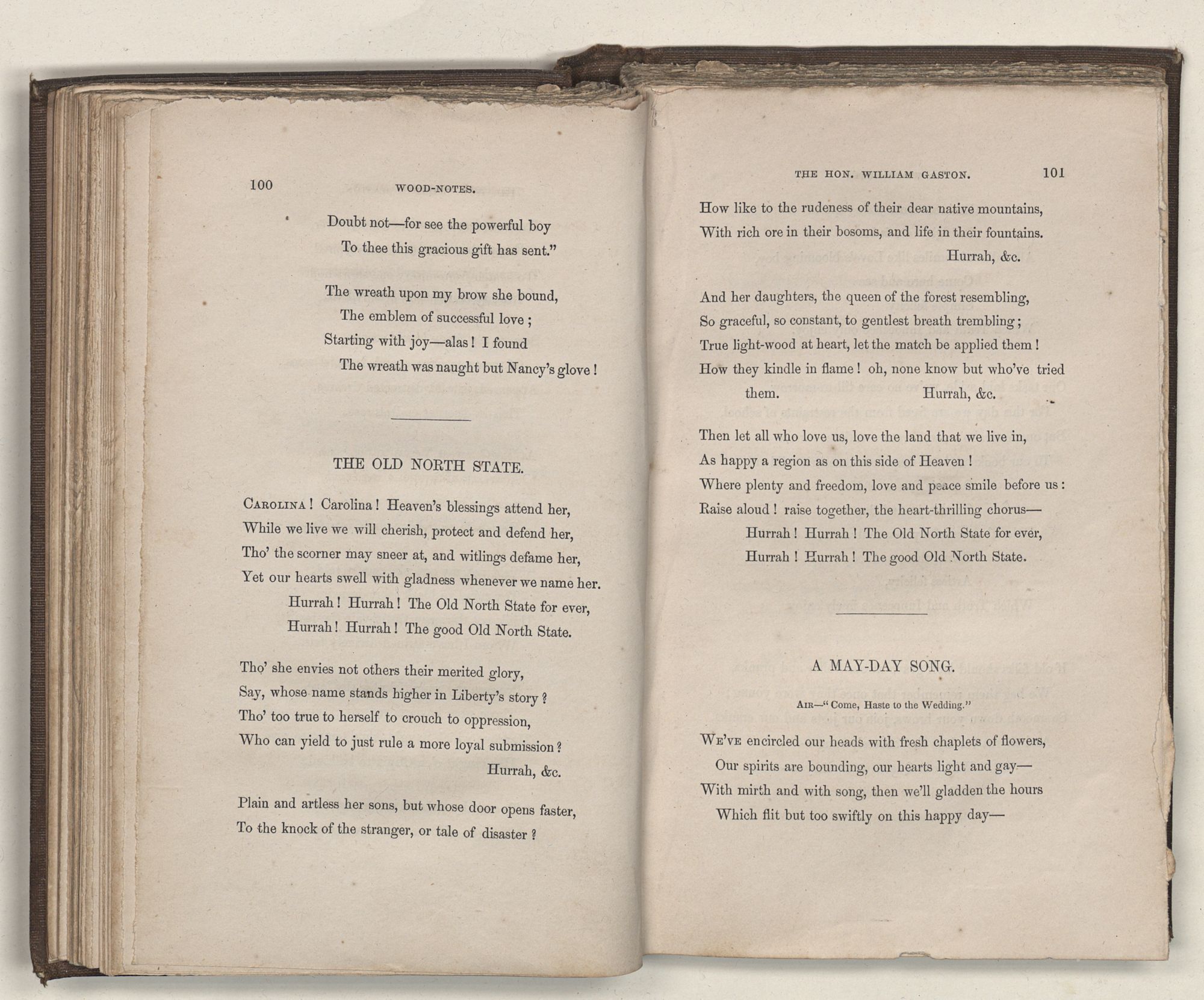 “the poets that are sownBy Nature; men endowed with highest gifts,The vision and the faculty divine.”As the note of the mocking-bird in our native woods is sweeter to the ear of patriotism than the song of the nightingale in foreign climes, so it is hoped that these Wood-Notes will be dear to North Carolinians. In this utilitarian age we are too prone to consider poetry as an ingenious trifling, unmanly and unwise; but it should be remembered that in every age and nation it has been the record of the highest and noblest thoughts of the best and purest of men. Irving has well remarked that “it is the gift of poetry to hallow every place in which it moves.” The learned jurist who can unbend his mind to write a May-day song for children, shows a goodness of heart as worthy of praise as his noble talents and profound learning, which awaken the admiration of the whole country; and the grave divine, who, in