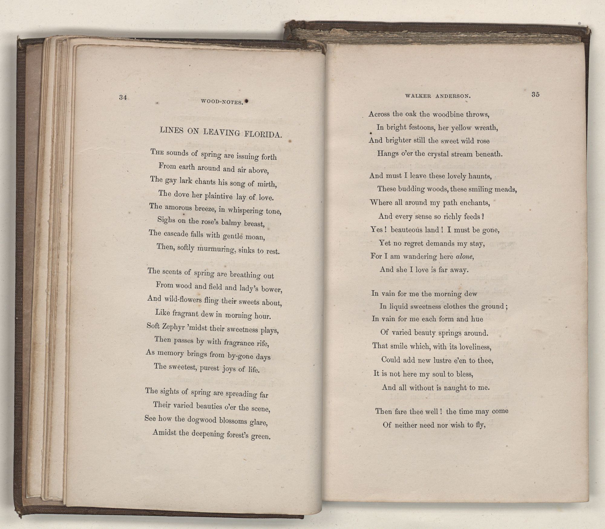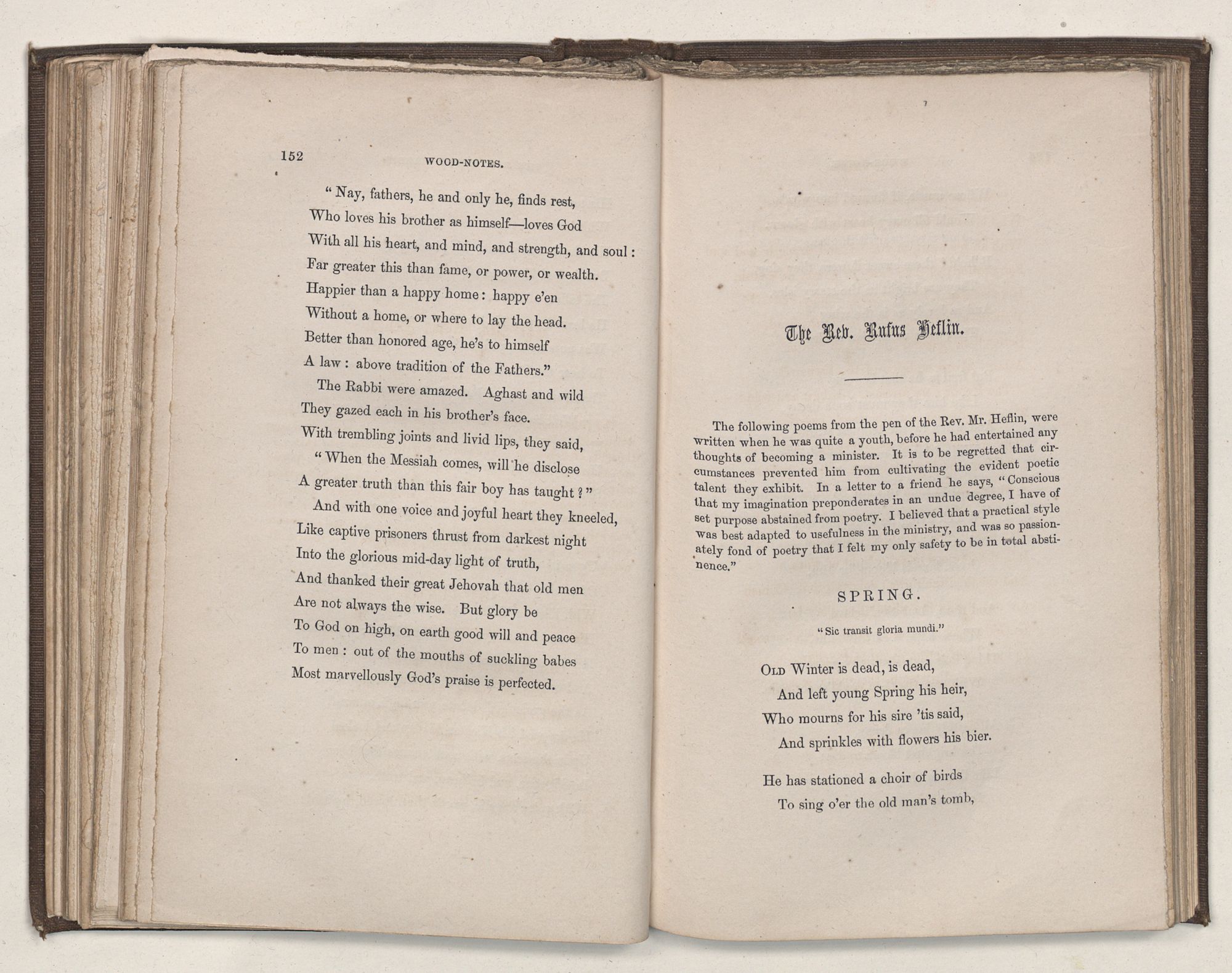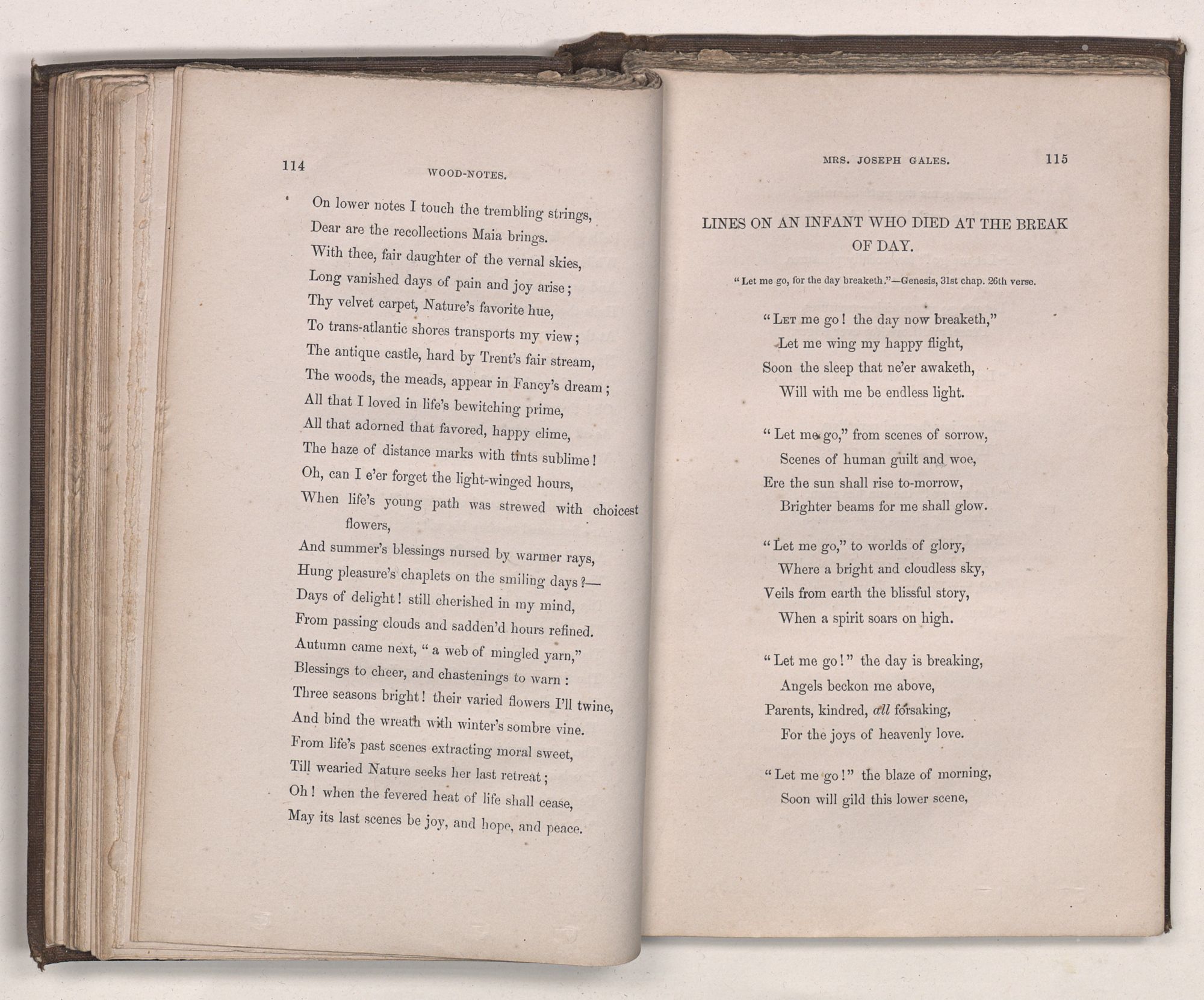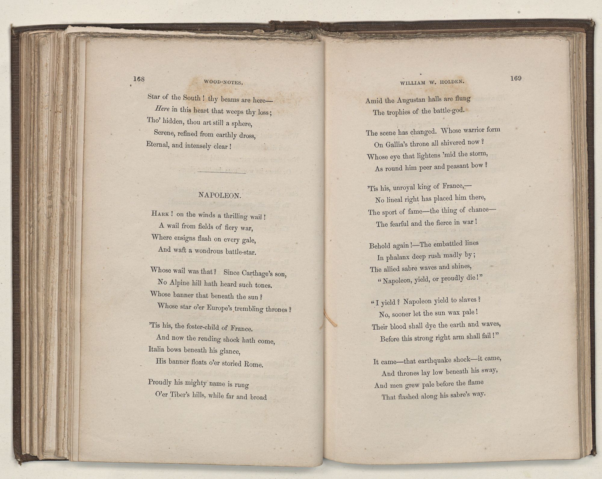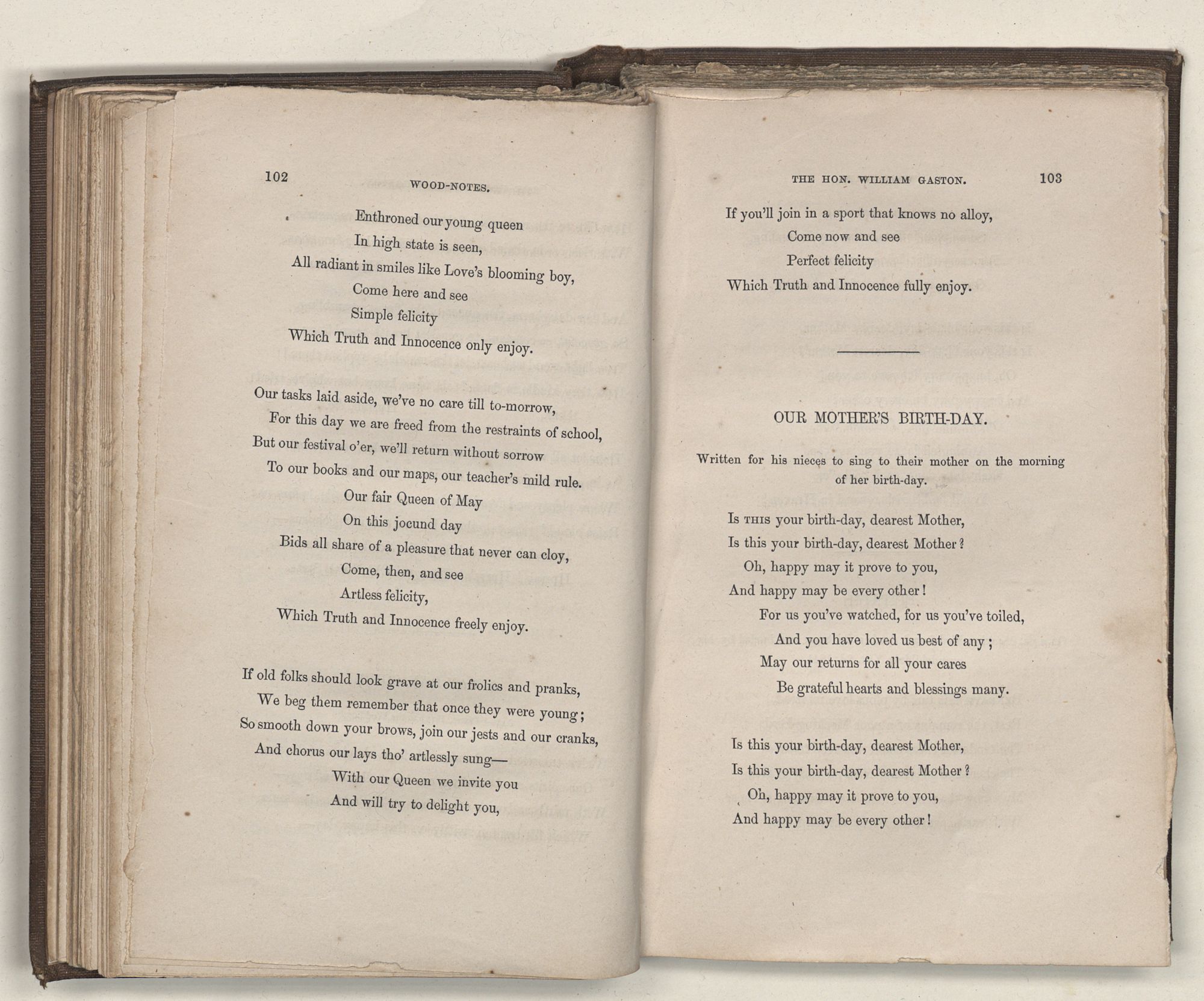 “the poets that are sownBy Nature; men endowed with highest gifts,The vision and the faculty divine.”As the note of the mocking-bird in our native woods is sweeter to the ear of patriotism than the song of the nightingale in foreign climes, so it is hoped that these Wood-Notes will be dear to North Carolinians. In this utilitarian age we are too prone to consider poetry as an ingenious trifling, unmanly and unwise; but it should be remembered that in every age and nation it has been the record of the highest and noblest thoughts of the best and purest of men. Irving has well remarked that “it is the gift of poetry to hallow every place in which it moves.” The learned jurist who can unbend his mind to write a May-day song for children, shows a goodness of heart as worthy of praise as his noble talents and profound learning, which awaken the admiration of the whole country; and the grave divine, who, in