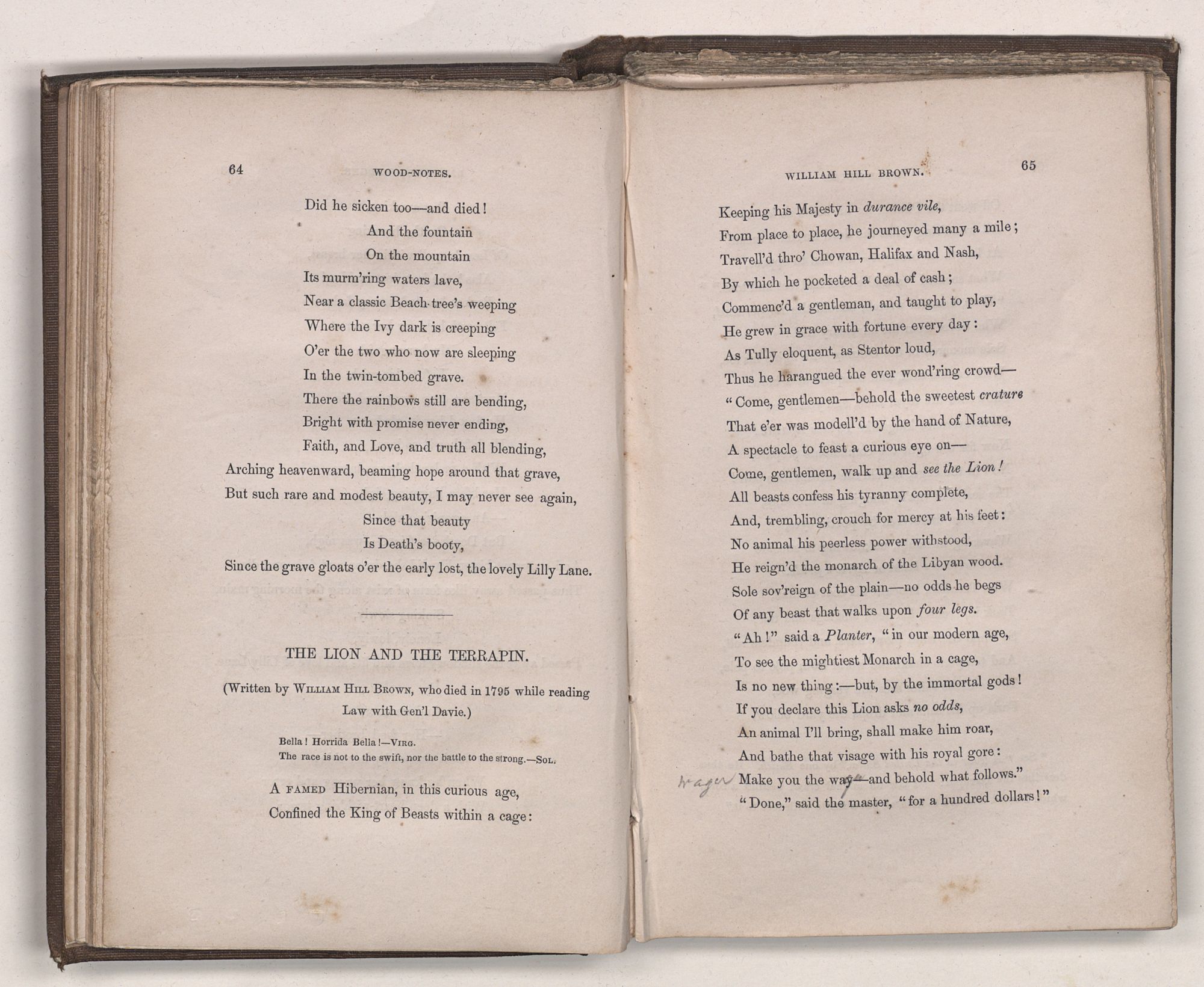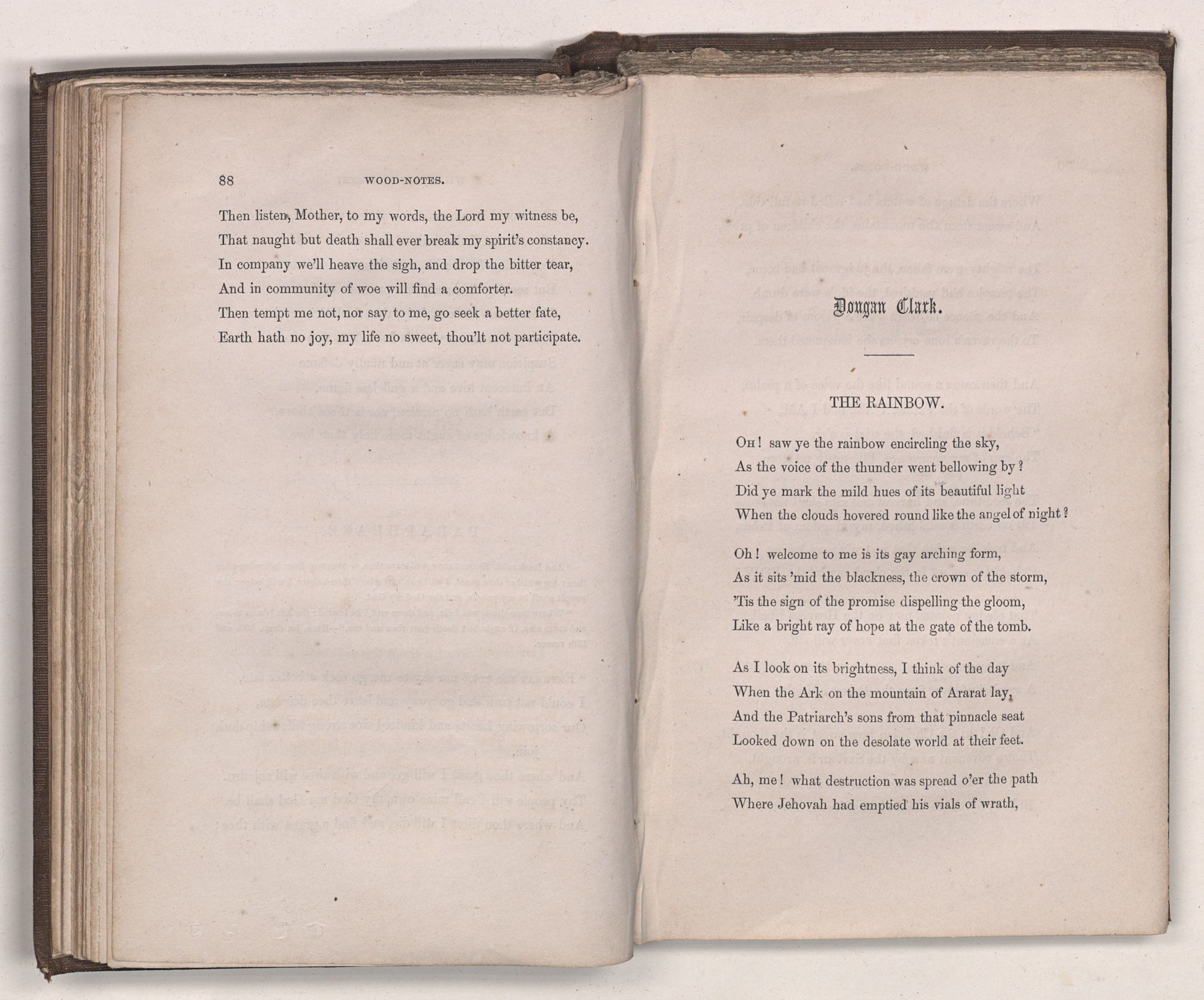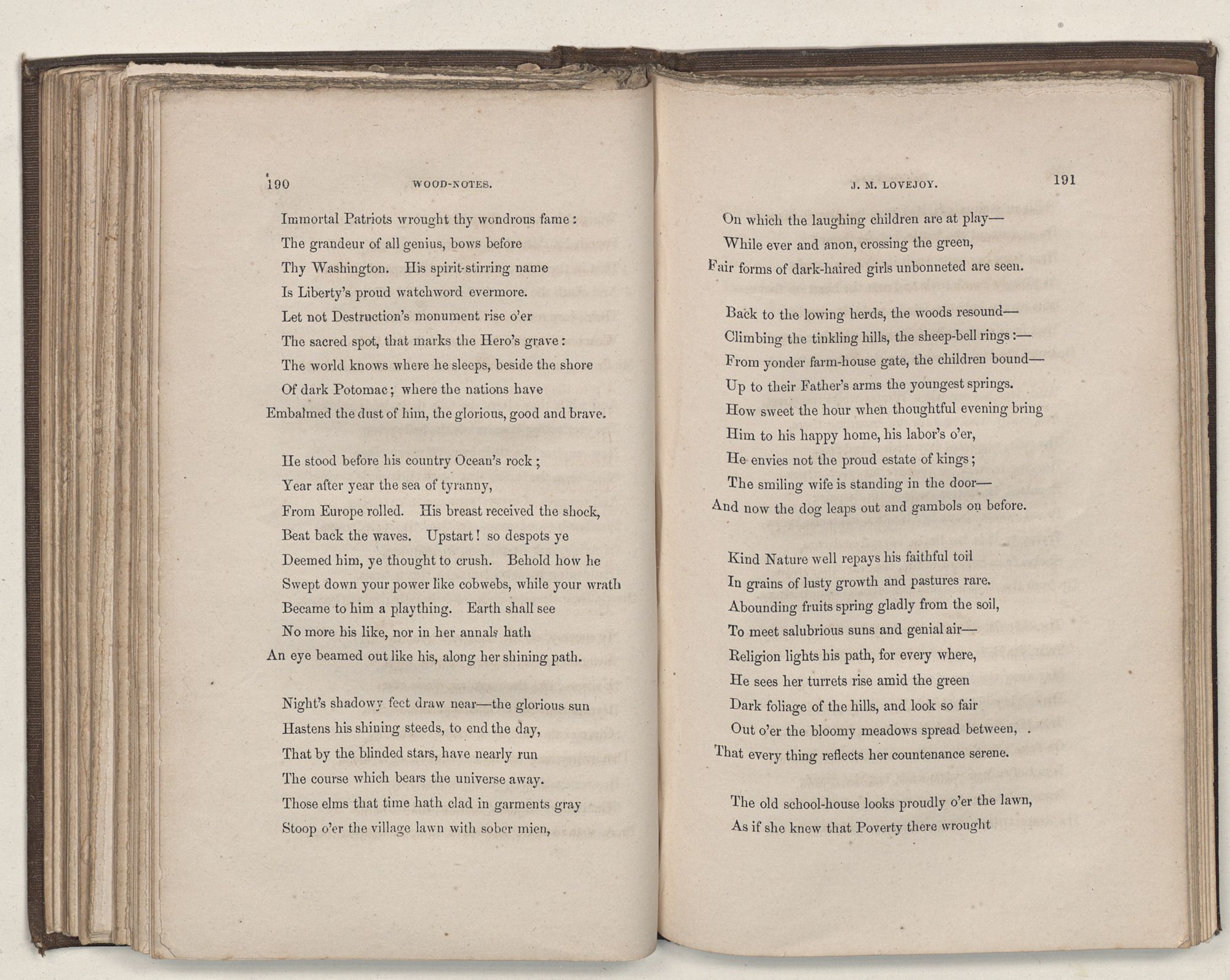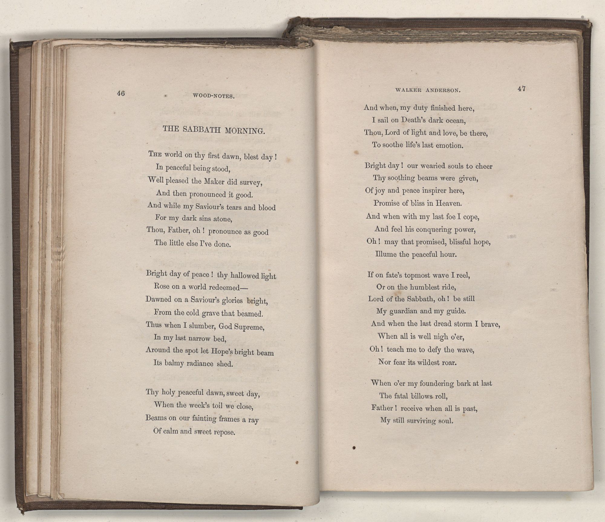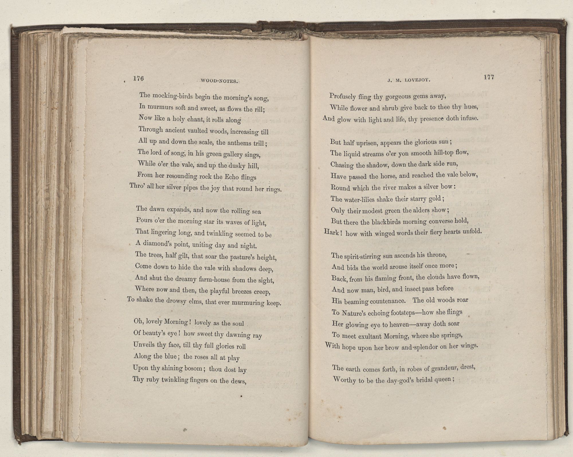 “the poets that are sownBy Nature; men endowed with highest gifts,The vision and the faculty divine.”As the note of the mocking-bird in our native woods is sweeter to the ear of patriotism than the song of the nightingale in foreign climes, so it is hoped that these Wood-Notes will be dear to North Carolinians. In this utilitarian age we are too prone to consider poetry as an ingenious trifling, unmanly and unwise; but it should be remembered that in every age and nation it has been the record of the highest and noblest thoughts of the best and purest of men. Irving has well remarked that “it is the gift of poetry to hallow every place in which it moves.” The learned jurist who can unbend his mind to write a May-day song for children, shows a goodness of heart as worthy of praise as his noble talents and profound learning, which awaken the admiration of the whole country; and the grave divine, who, in