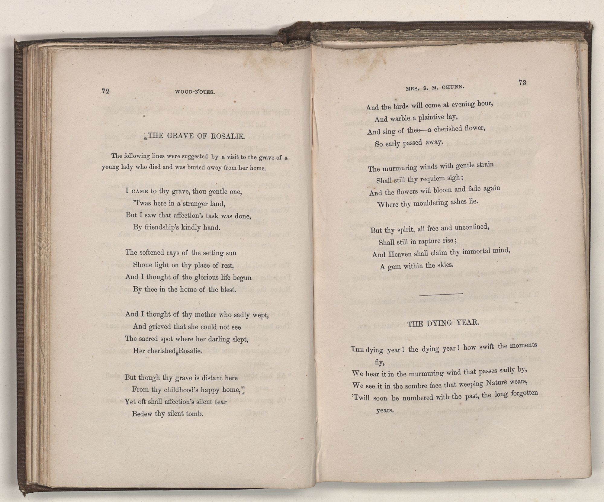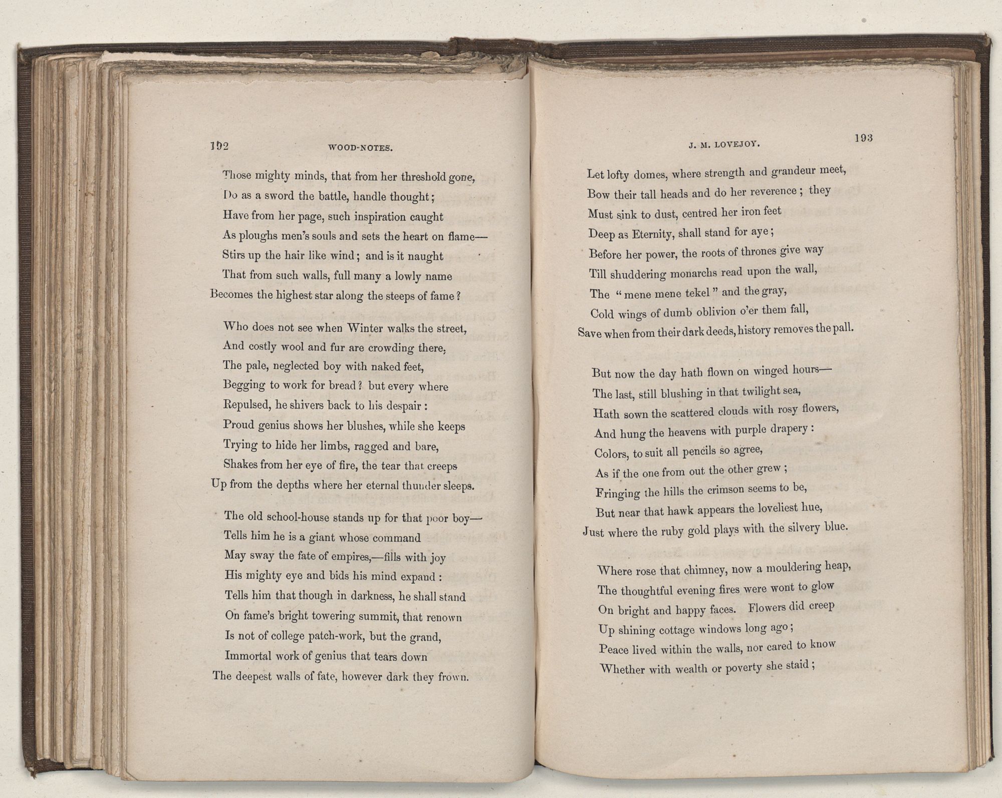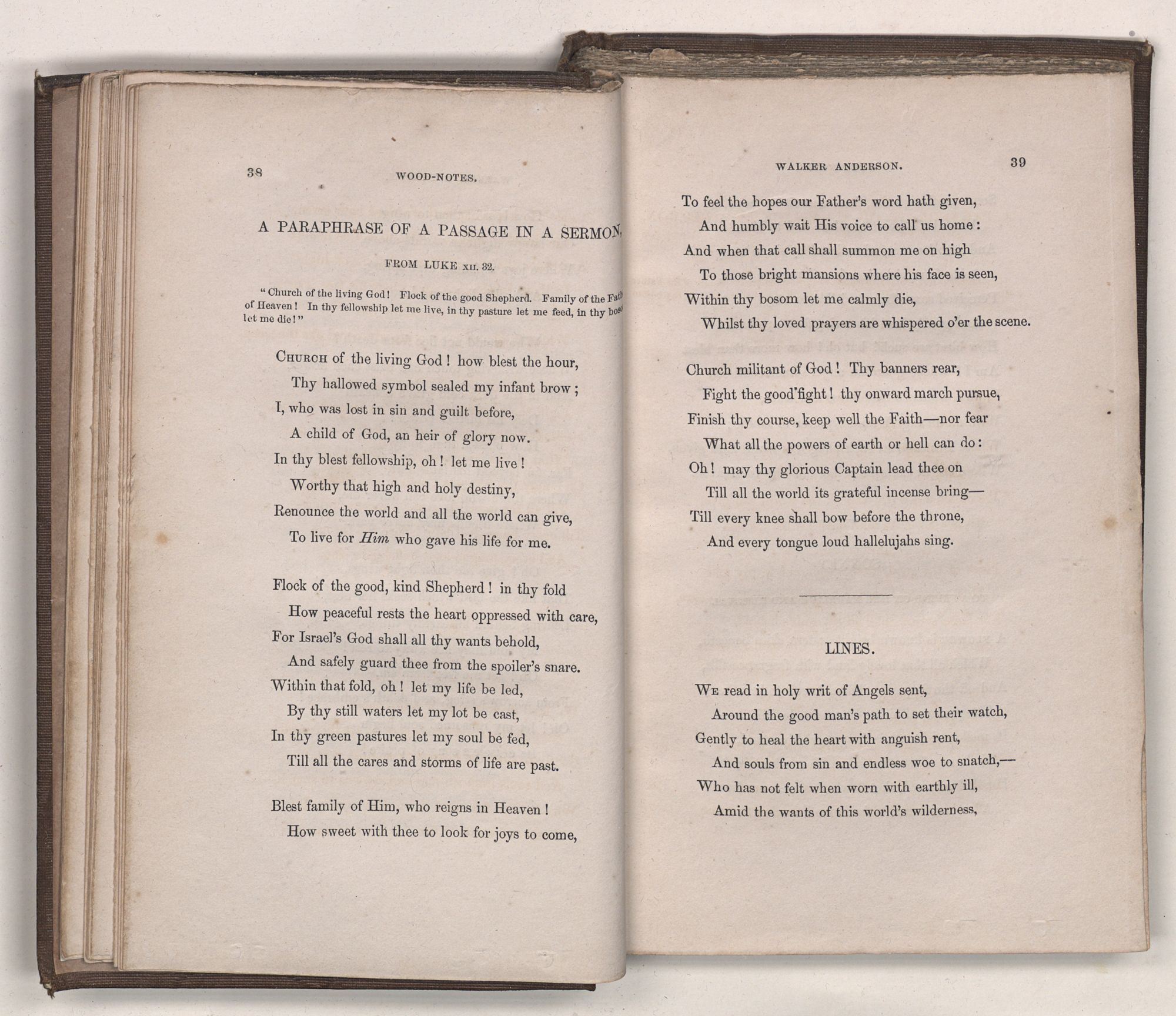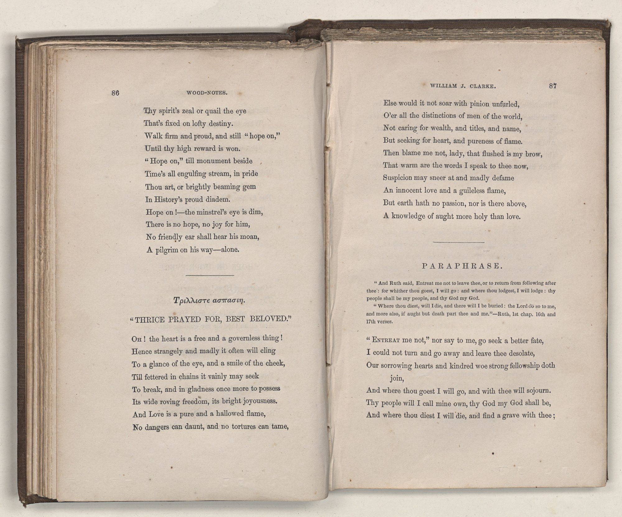 “the poets that are sownBy Nature; men endowed with highest gifts,The vision and the faculty divine.”As the note of the mocking-bird in our native woods is sweeter to the ear of patriotism than the song of the nightingale in foreign climes, so it is hoped that these Wood-Notes will be dear to North Carolinians. In this utilitarian age we are too prone to consider poetry as an ingenious trifling, unmanly and unwise; but it should be remembered that in every age and nation it has been the record of the highest and noblest thoughts of the best and purest of men. Irving has well remarked that “it is the gift of poetry to hallow every place in which it moves.” The learned jurist who can unbend his mind to write a May-day song for children, shows a goodness of heart as worthy of praise as his noble talents and profound learning, which awaken the admiration of the whole country; and the grave divine, who, in