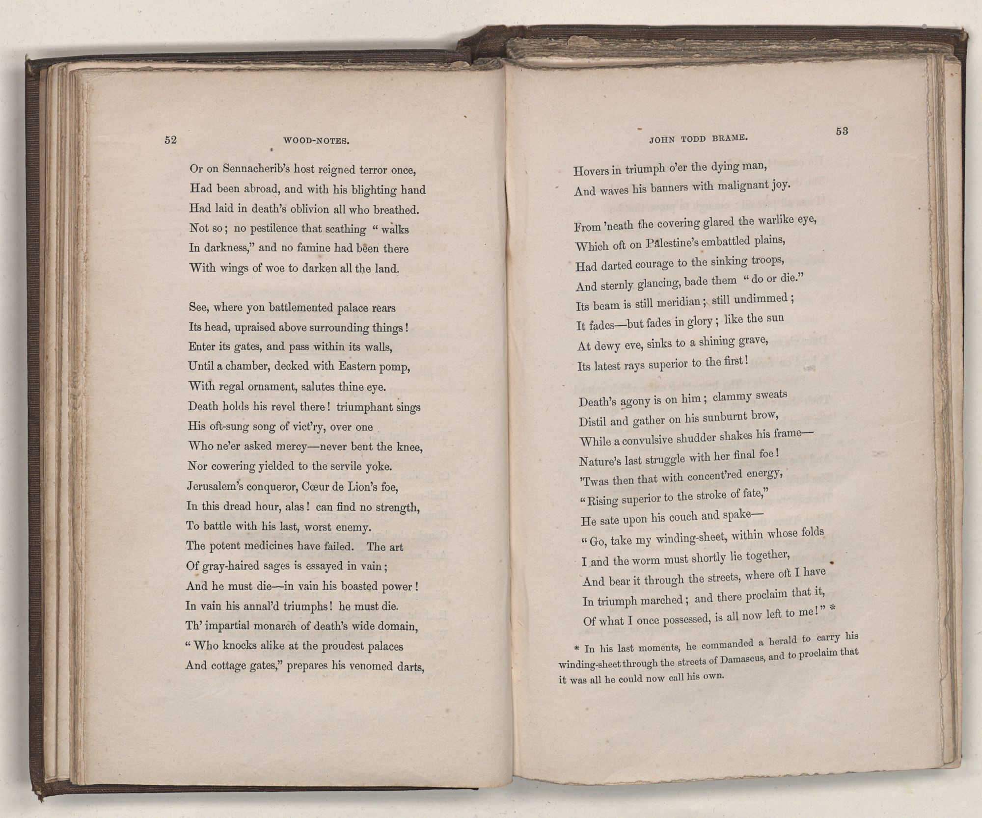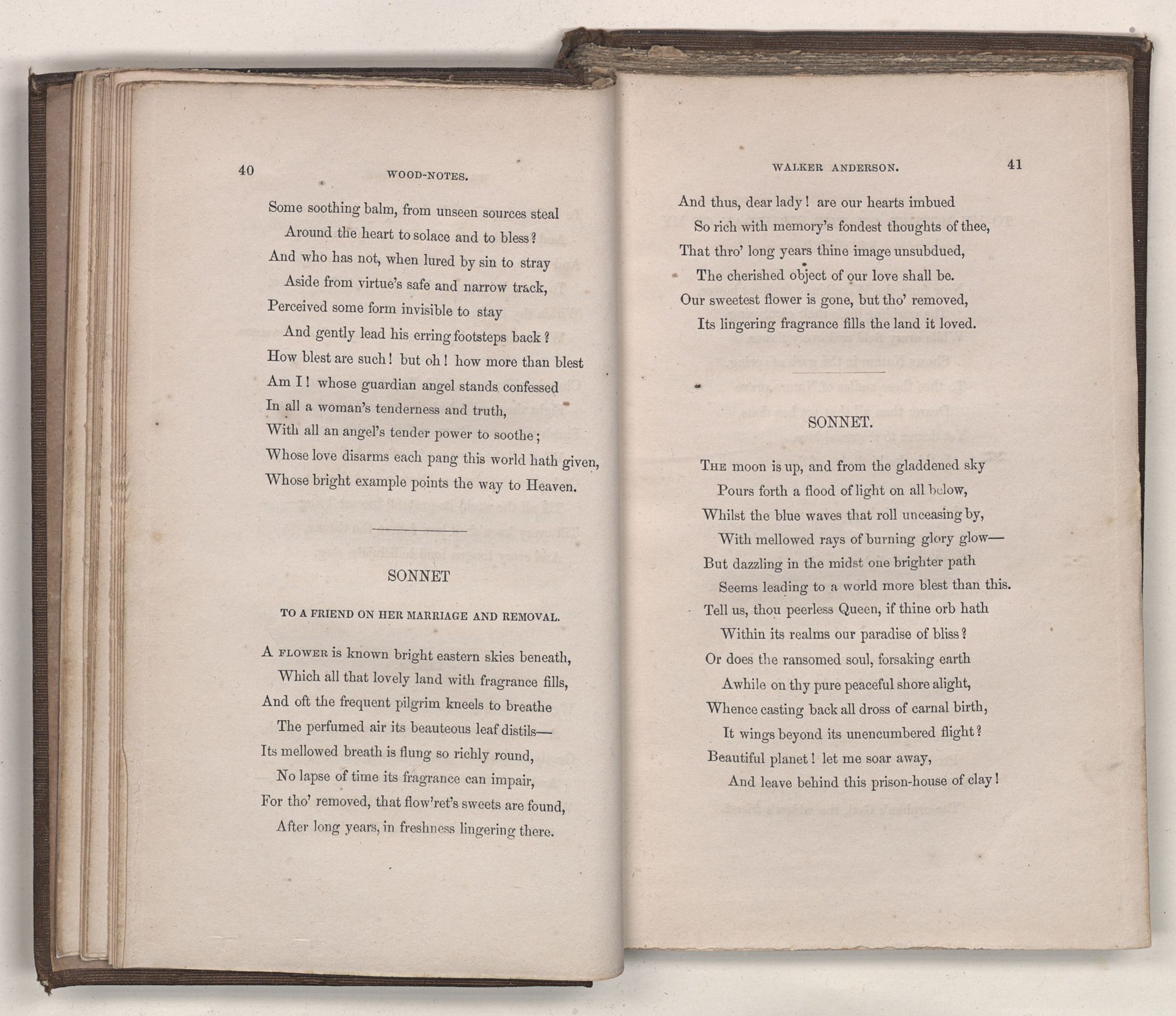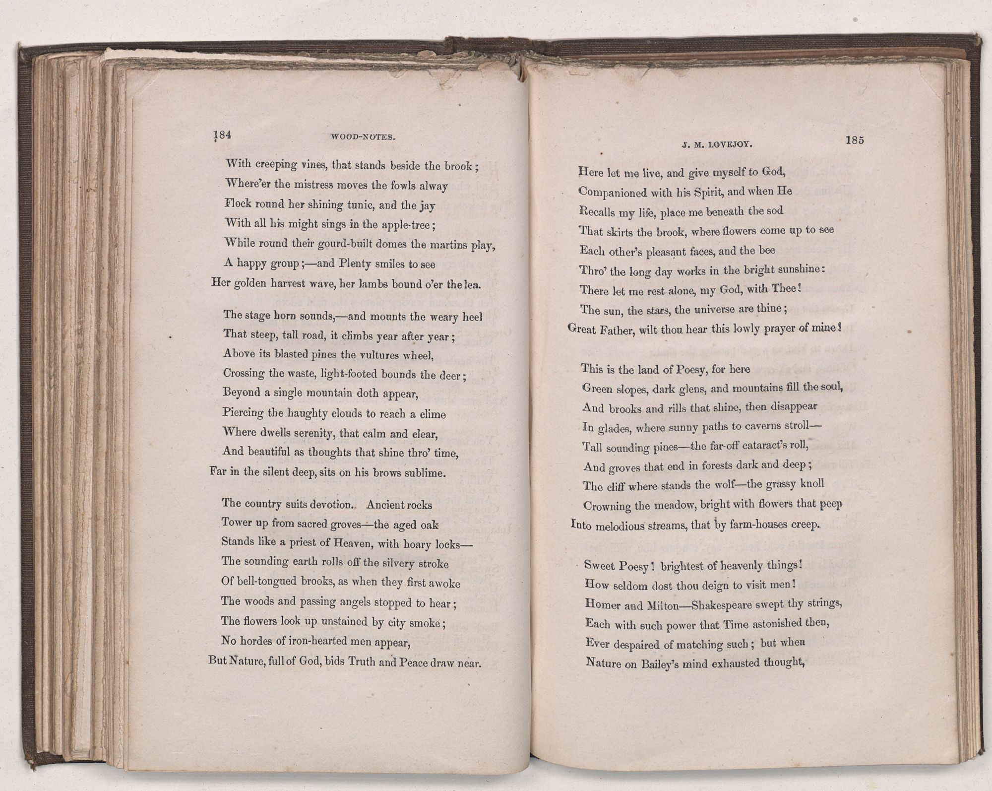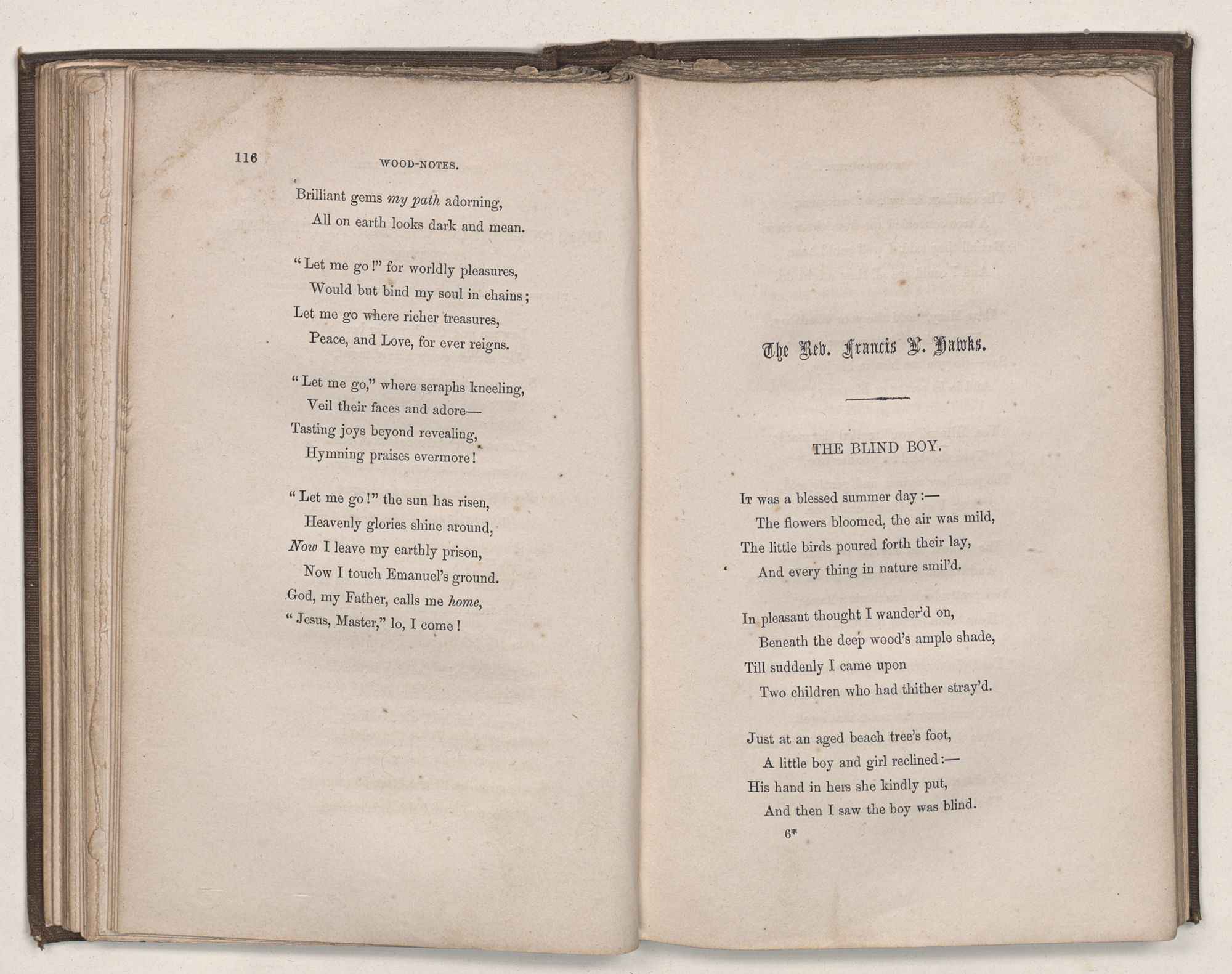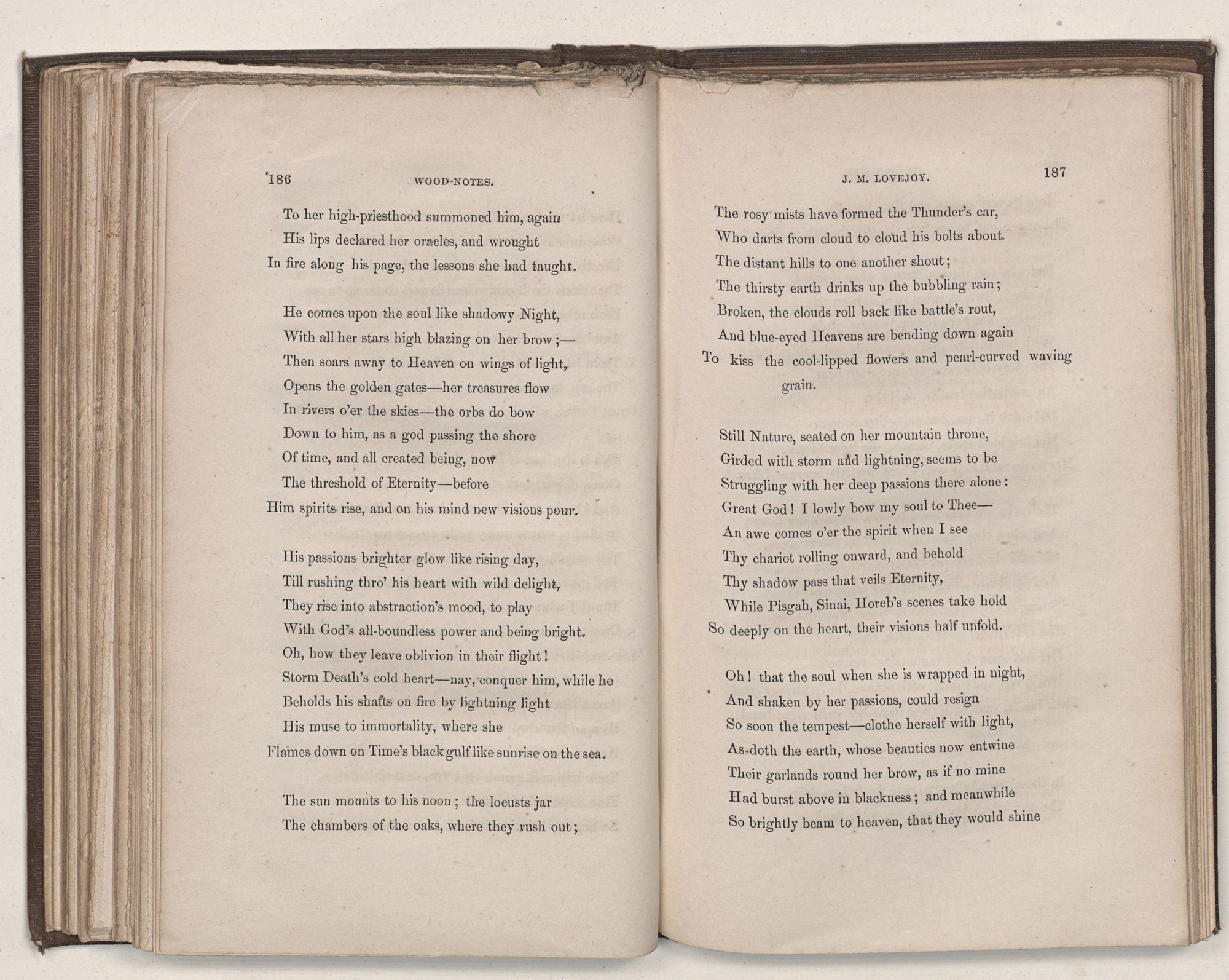 “the poets that are sownBy Nature; men endowed with highest gifts,The vision and the faculty divine.”As the note of the mocking-bird in our native woods is sweeter to the ear of patriotism than the song of the nightingale in foreign climes, so it is hoped that these Wood-Notes will be dear to North Carolinians. In this utilitarian age we are too prone to consider poetry as an ingenious trifling, unmanly and unwise; but it should be remembered that in every age and nation it has been the record of the highest and noblest thoughts of the best and purest of men. Irving has well remarked that “it is the gift of poetry to hallow every place in which it moves.” The learned jurist who can unbend his mind to write a May-day song for children, shows a goodness of heart as worthy of praise as his noble talents and profound learning, which awaken the admiration of the whole country; and the grave divine, who, in
