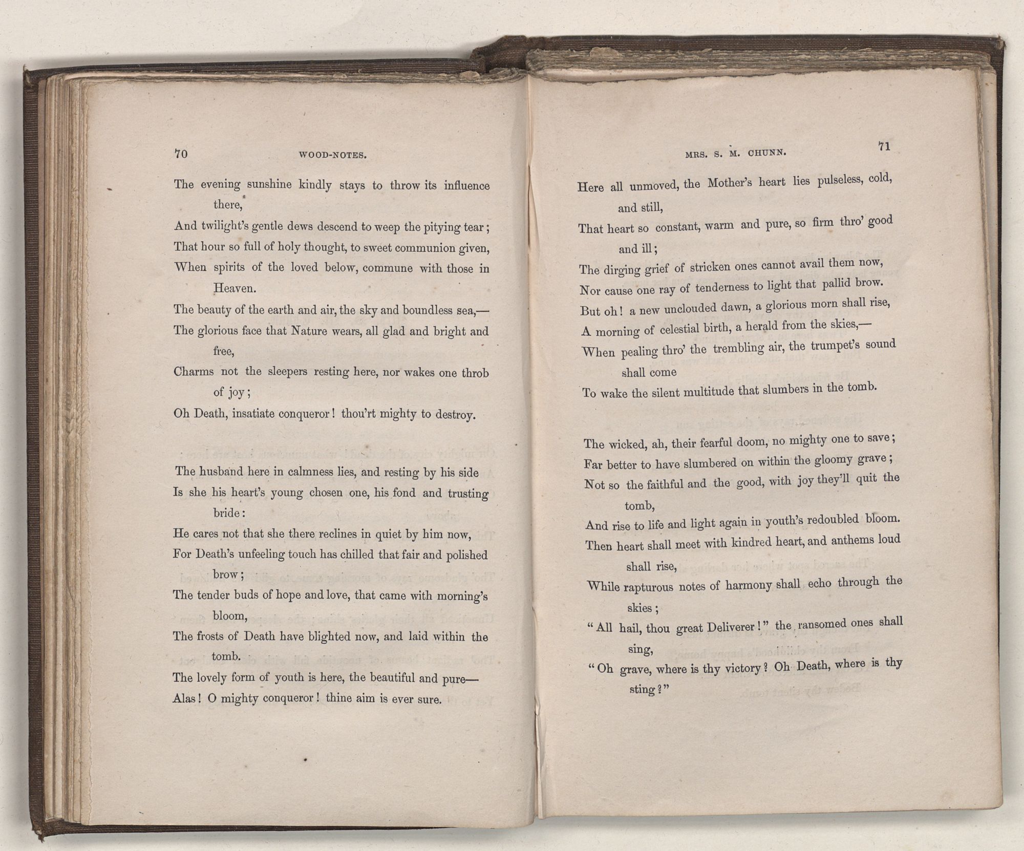 Smiles like the last gleam of an autumn day,Told that her soul's pure thoughts were far from earth.Slowly she faded like a lovely star,When the bright moon comes stealing up thy sky,Or some sweet flower that frosts of winter mar,Which weeping bends in loneliness to die.’Twas on a summer eve, a gentle eve,Such as with rapture fills the dreamy soul,That doth with deep immortal longings grieve,That it can never reach its hope's far goal.Her spirit trembled o'er its suffering clay,And brightly beaming thro’ the shades of death,Did o'er her face in heavenly beauty play,And grow more lovely till her latest breath.Long, dreary years have passed since sheLay where the evening's golden sunbeams fell,And with a smile that fluttered mournfully,Breathed with her soft and dying voice—farewell.She calmly sleeps now by a murmuring stream,And near her grave, from others stands apart,A flower that weeps beneath the moon's pale beam,The mournful emblem of her broken heart.THE FLOWER OF CATAWBA.
