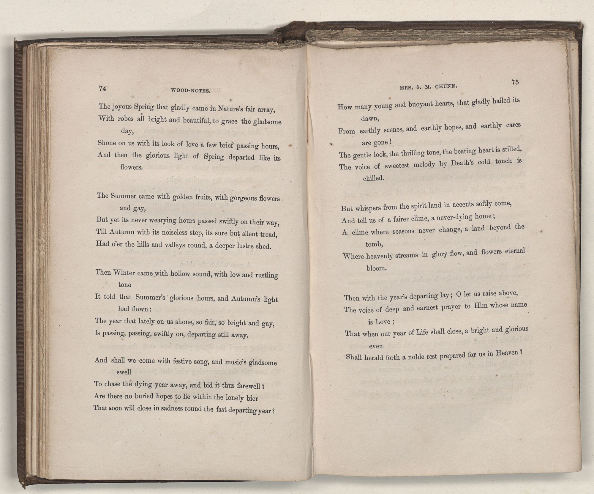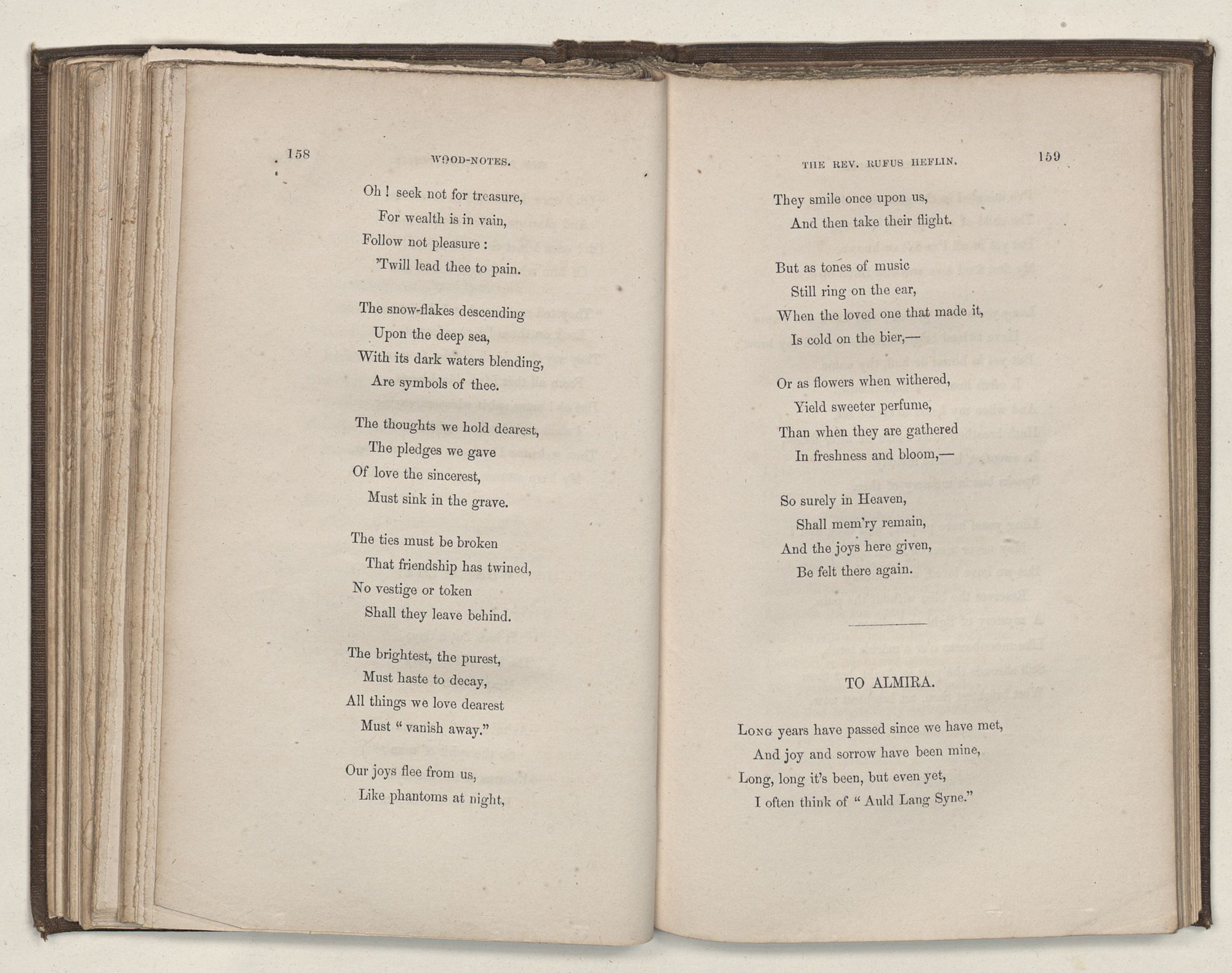 Oh! seek not for treasure,For wealth is in vain,Follow not pleasure:’Twill lead thee to pain.The snow-flakes descendingUpon the deep sea,With its dark waters blending,Are symbols of thee.The thoughts we hold dearest,The pledges we gaveOf love the sincerest,Must sink in the grave.The ties must be brokenThat friendship has twined,No vestige or tokenShall they leave behind.The brightest, the purest,Must haste to decay,All things we love dearestMust “vanish away.”Our joys flee from us,Like phantoms at night,They smile once upon us,And then take their flight.But as tones of musicStill ring on the ear,When the loved one that made it,Is cold on the bier,—Or as flowers when withered,Yield sweeter perfume,Than when they are gatheredIn freshness and bloom,—So surely in Heaven,Shall mem'ry remain,And the joys here given,Be felt there again.TO ALMIRA.