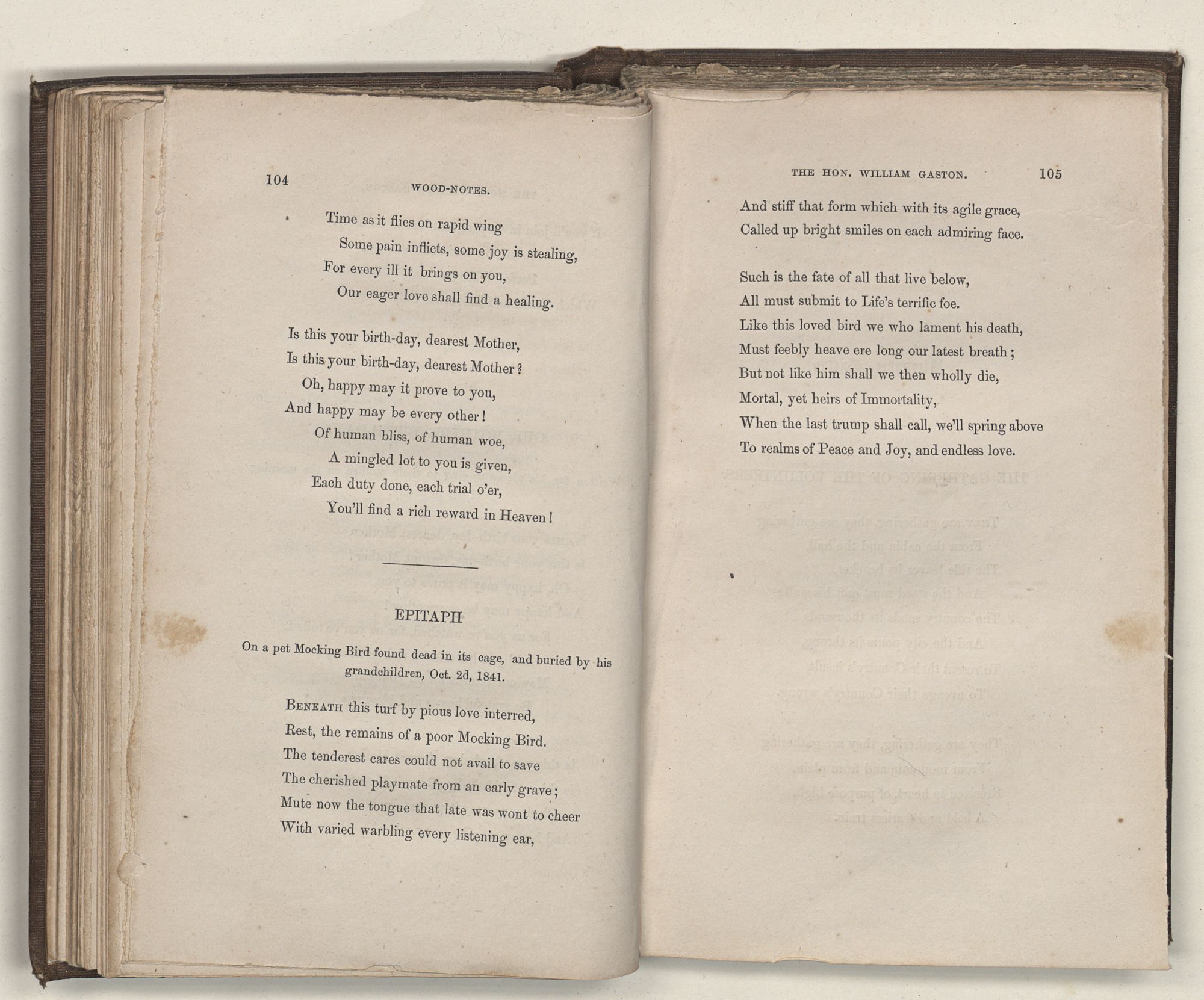 | Epitaph—On a pet Mocking Bird found dead in its cage, and buried by his grandchildren, Oct. 2d, 1841. | 104 |
