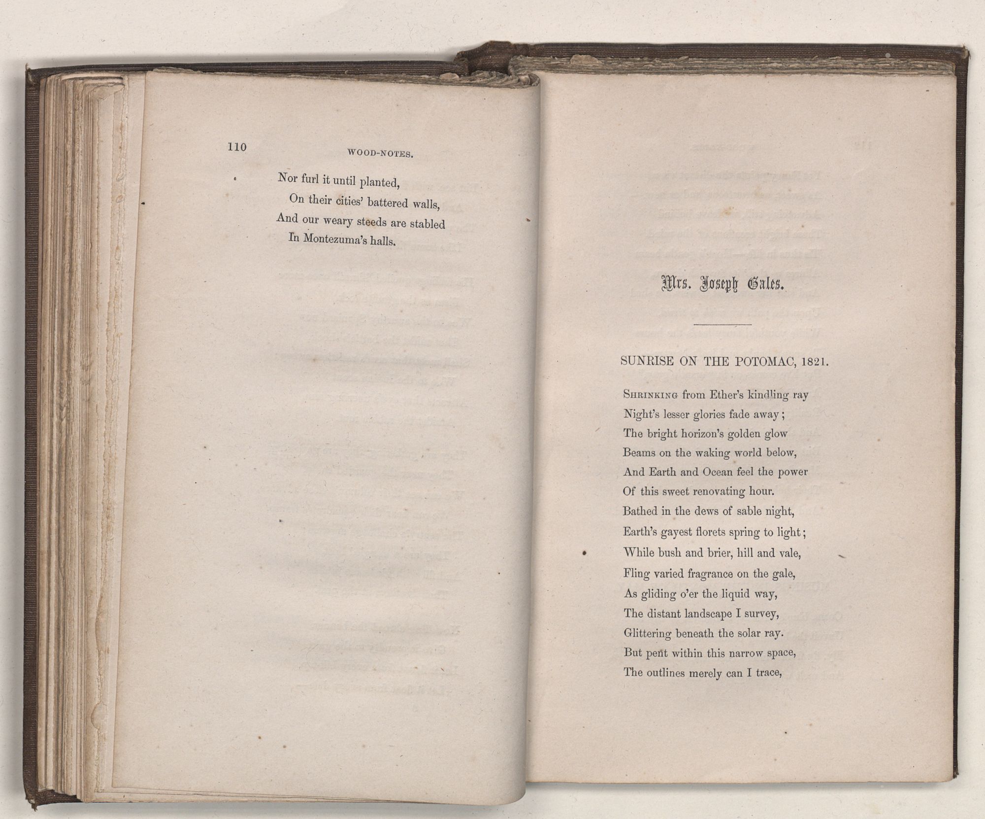 The mocking-birds begin the morning's song,In murmurs soft and sweet, as flows the rill;Now like a holy chant, it rolls alongThrough ancient vaulted woods, increasing tillAll up and down the scale, the anthems trill;The lord of song, in his green gallery sings,While o'er the vale, and up the dusky hill,From her resounding rock the Echo flingsThro’ all her silver pipes the joy that round her rings.The dawn expands, and now the rolling seaPours o'er the morning star its waves of light,That lingering long, and twinkling seemed to beA diamond's point, uniting day and night.The trees, half gilt, that soar the pasture's height,Come down to hide the vale with shadows deep,And shut the dreamy farm-house from the sight,Where now and then, the playful breezes creep,To shake the drowsy elms, that ever murmuring keep.Oh, lovely Morning! lovely as the soulOf beauty's eye! how sweet thy dawning rayUnveils thy face, till thy full glories rollAlong the blue; the roses all at playUpon thy shining bosom; thou dost layThy ruby twinkling fingers on the dews,Profusely fling thy gorgeous gems away,While flower and shrub give back to thee thy hues,And glow with light and life, thy presence doth infuse.But half uprisen, appears the glorious sun;The liquid streams o'er yon smooth hill-top flow,Chasing the shadow, down the dark side run,Have passed the horse, and reached the vale below,Round which the river makes a silver bow:The water-lilies shake their starry gold;Only their modest green the alders show;But there the blackbirds morning converse hold,Hark! how with winged words their fiery hearts unfold.The spirit-stirring sun ascends his throne,And bids the world arouse itself once more;Back, from his flaming front, the clouds have flown,And now man, bird, and insect pass beforeHis beaming countenance. The old woods roarTo Nature's echoing footsteps—how she flingsHer glowing eye to heaven—away doth soarTo meet exultant Morning, where she springs,With hope upon her brow and splendor on her wings.The earth comes forth, in robes of grandeur, drest,Worthy to be the day-god's bridal queen;