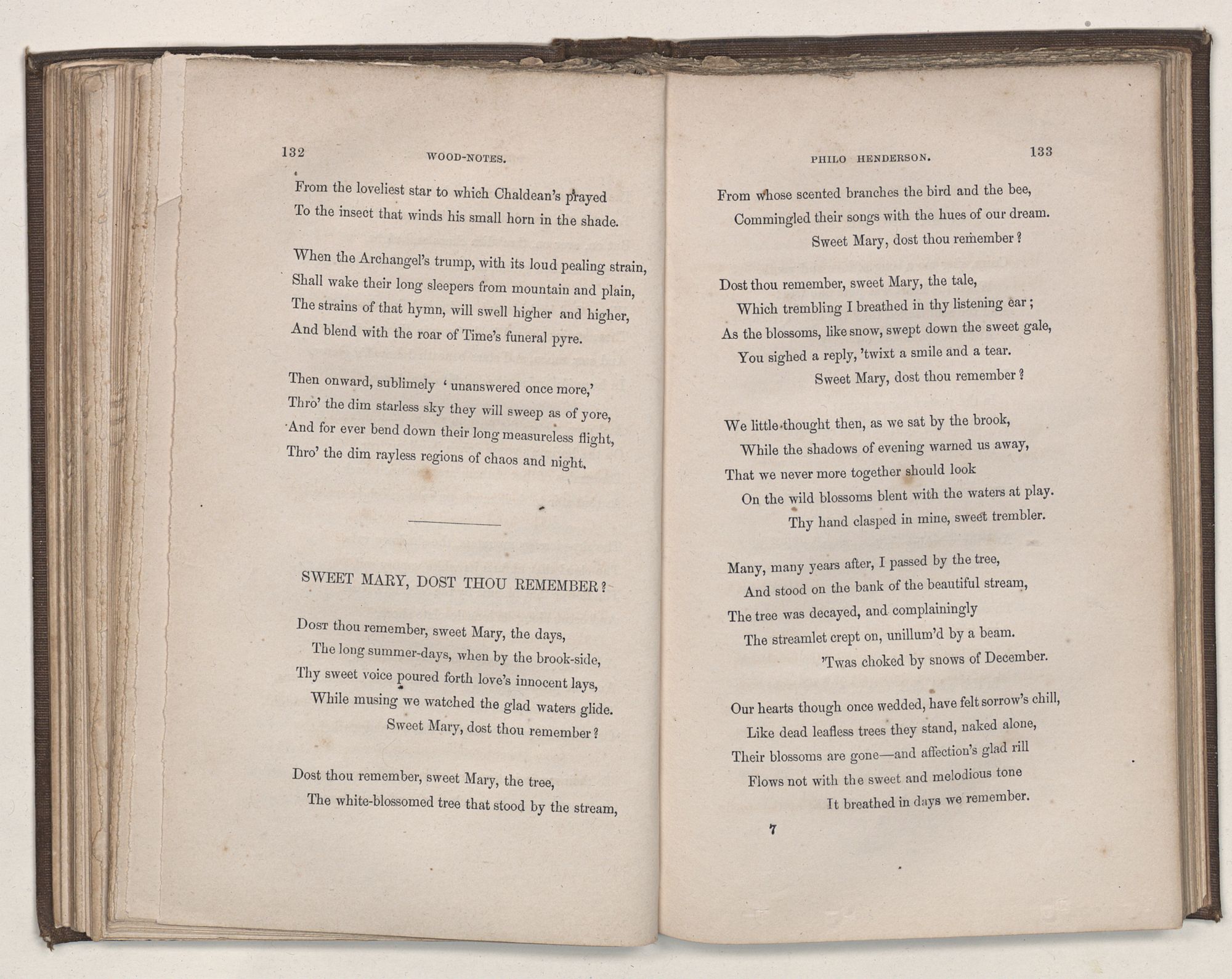 DOST thou remember, sweet Mary, the days,The long summer-days, when by the brook-side,Thy sweet voice poured forth love's innocent lays,While musing we watched the glad waters glide.Sweet Mary, dost thou remember?Dost thou remember, sweet Mary, the tree,The white-blossomed tree that stood by the stream,From whose scented branches the bird and the bee,Commingled their songs with the hues of our dream.Sweet Mary, dost thou remember?Dost thou remember, sweet Mary, the tale,Which trembling I breathed in thy listening ear;As the blossoms, like snow, swept down the sweet gale,You sighed a reply, ’twixt a smile and a tear.Sweet Mary, dost thou remember?We little thought then, as we sat by the brook,While the shadows of evening warned us away,That we never more together should lookOn the wild blossoms blent with the waters at play.Thy hand clasped in mine, sweet trembler.Many, many years after, I passed by the tree,And stood on the bank of the beautiful stream,The tree was decayed, and complaininglyThe streamlet crept on, unillum'd by a beam.’Twas choked by snows of December.Our hearts though once wedded, have felt sorrow's chill,Like dead leafless trees they stand, naked alone,Their blossoms are gone—and affection's glad rillFlows not with the sweet and melodious toneIt breathed in days we remember.