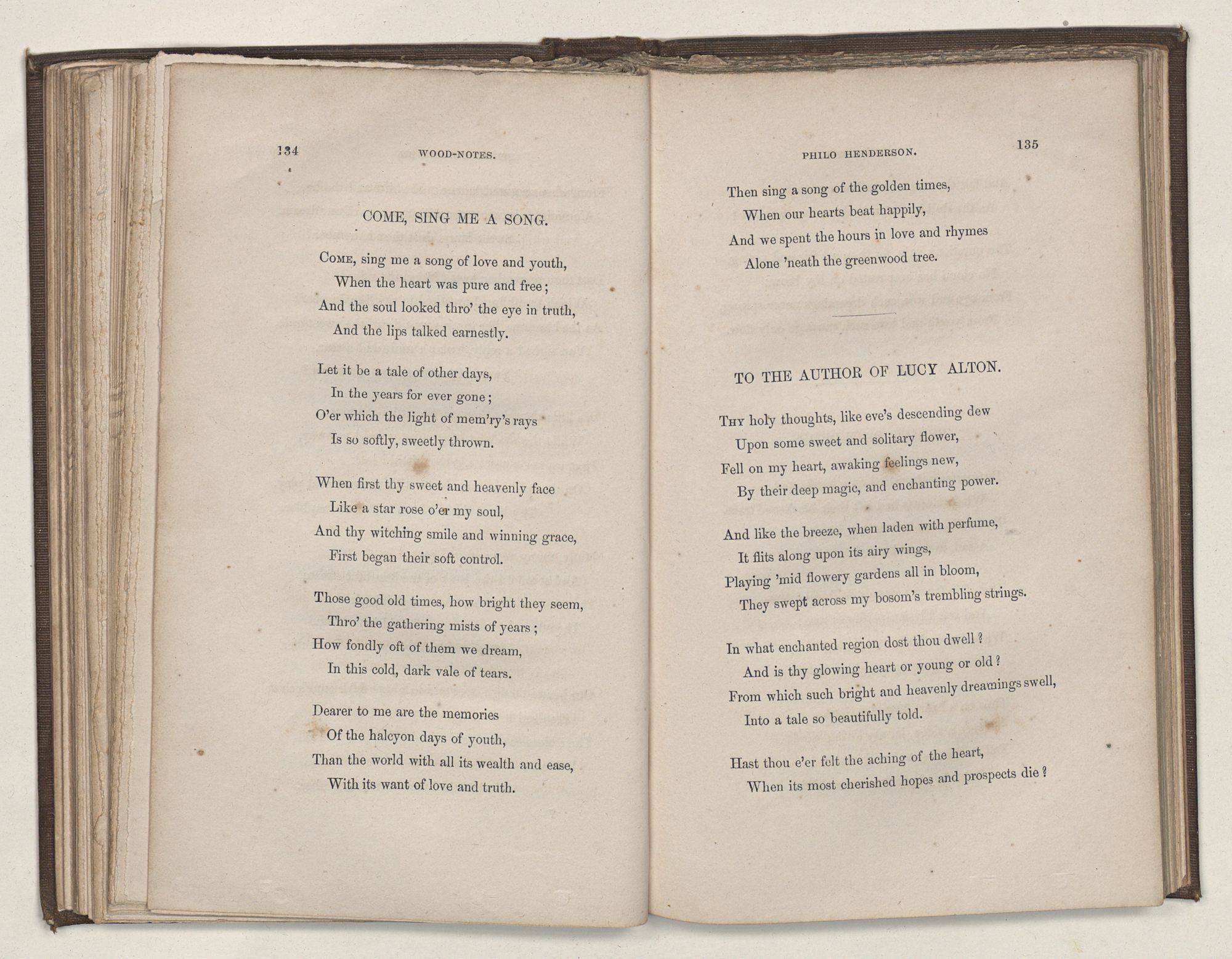 COME, sing me a song of love and youth,When the heart was pure and free;And the soul looked thro’ the eye in truth,And the lips talked earnestly.Let it be a tale of other days,In the years for ever gone;O'er which the light of mem'ry's raysIs so softly, sweetly thrown.When first thy sweet and heavenly faceLike a star rose o'er my soul,And thy witching smile and winning grace,First began their soft control.Those good old times, how bright they seem,Thro’ the gathering mists of years;How fondly oft of them we dream,In this cold, dark vale of tears.Dearer to me are the memoriesOf the halcyon days of youth,Than the world with all its wealth and ease,With its want of love and truth.Then sing a song of the golden times,When our hearts beat happily,And we spent the hours in love and rhymesAlone ’neath the greenwood tree.TO THE AUTHOR OF LUCY ALTON.
