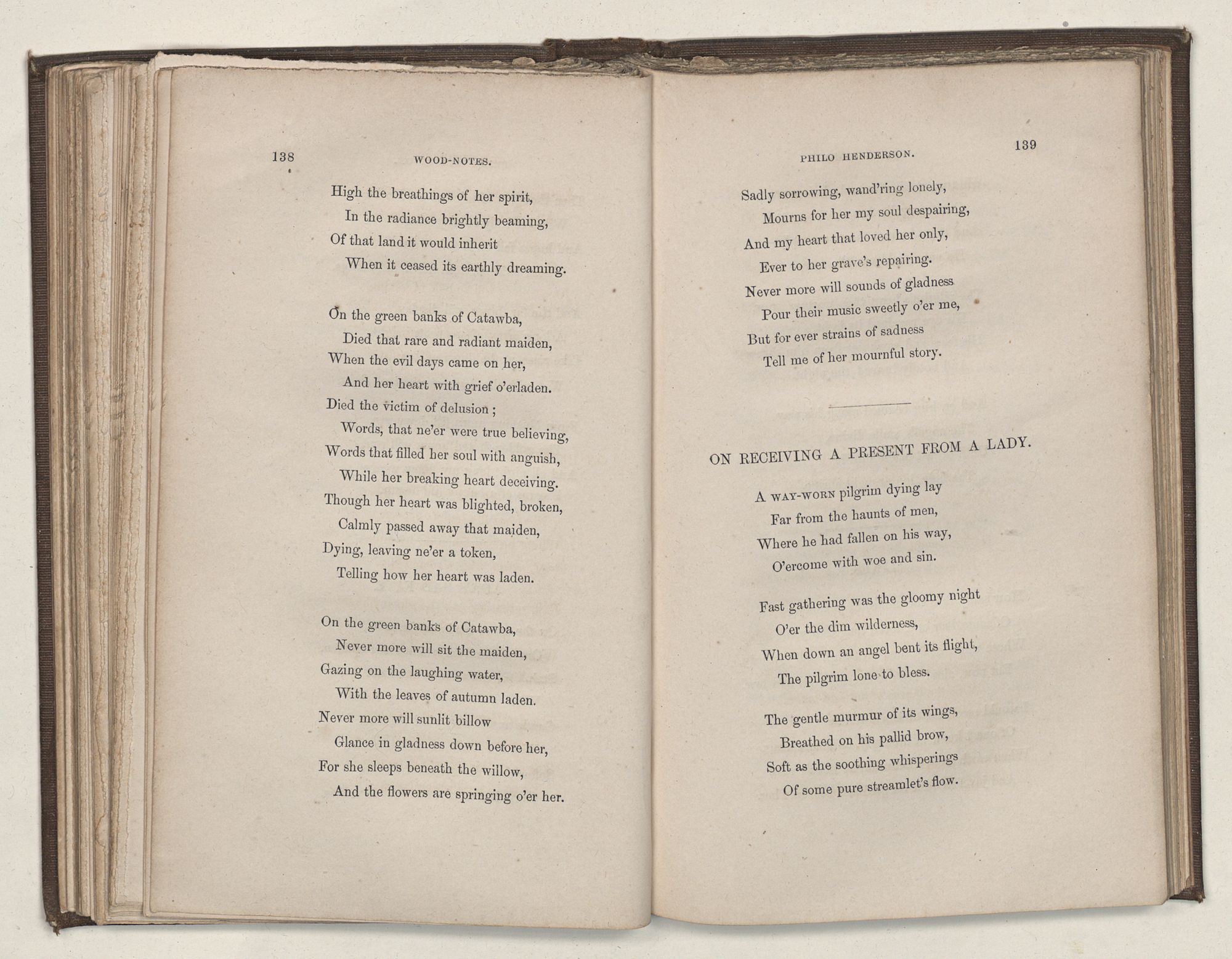 High the breathings of her spirit,In the radiance brightly beaming,Of that land it would inheritWhen it ceased its earthly dreaming.On the green banks of Catawba,Died that rare and radiant maiden,When the evil days came on her,And her heart with grief o'erladen.Died the victim of delusion;Words, that ne'er were true believing,Words that filled her soul with anguish,While her breaking heart deceiving.Though her heart was blighted, broken,Calmly passed away that maiden,Dying, leaving ne'er a token,Telling how her heart was laden.On the green banks of Catawba,Never more will sit the maiden,Gazing on the laughing water,With the leaves of autumn laden.Never more will sunlit billowGlance in gladness down before her,For she sleeps beneath the willow,And the flowers are springing o'er her.Sadly sorrowing, wand'ring lonely,Mourns for her my soul despairing,And my heart that loved her only,Ever to her grave's repairing.Never more will sounds of gladnessPour their music sweetly o'er me,But for ever strains of sadnessTell me of her mournful story.ON RECEIVING A PRESENT FROM A LADY.