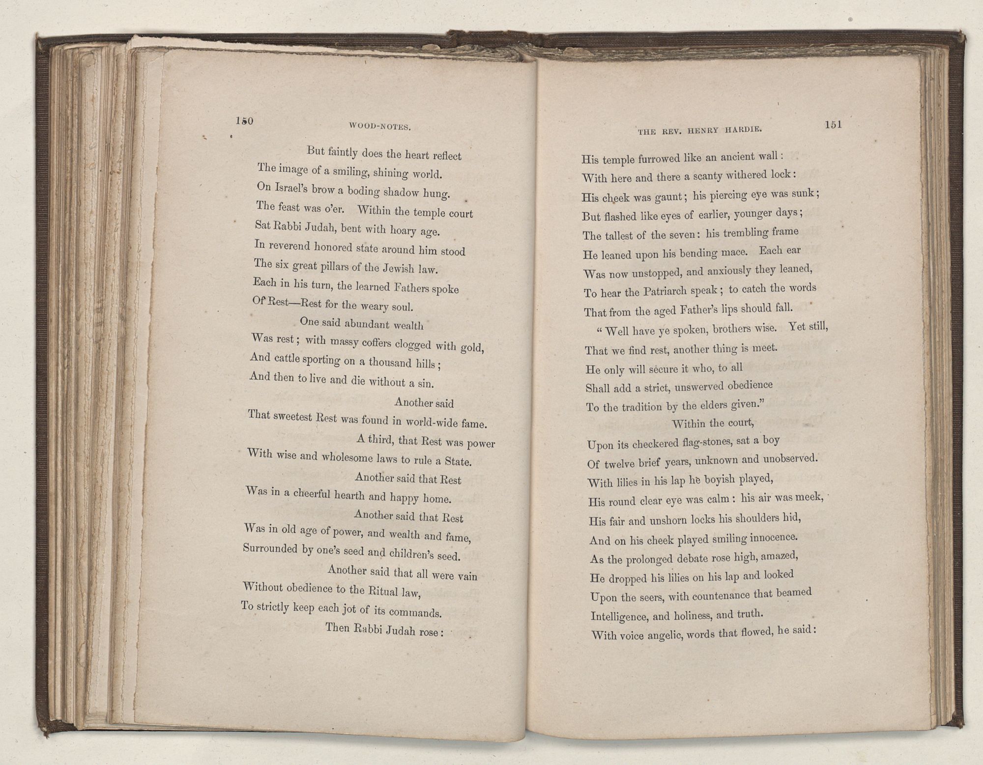 But faintly does the heart reflectThe image of a smiling, shining world.On Israel's brow a boding shadow hung.The feast was o'er. Within the temple courtSat Rabbi Judah, bent with hoary age.In reverend honored state around him stoodThe six great pillars of the Jewish law.Each in his turn, the learned Fathers spokeOf Rest—Rest for the weary soul.One said abundant wealthWas rest; with massy coffers clogged with gold,And cattle sporting on a thousand hills;And then to live and die without a sin.Another saidThat sweetest Rest was found in world-wide fame.A third, that Rest was powerWith wise and wholesome laws to rule a State.Another said that RestWas in a cheerful hearth and happy home.Another said that RestWas in old age of power, and wealth and fame,Surrounded by one's seed and children's seed.Another said that all were vainWithout obedience to the Ritual law,To strictly keep each jot of its commands.Then Rabbi Judah rose:His temple furrowed like an ancient wall:With here and there a scanty withered lock:His cheek was gaunt; his piercing eye was sunk;But flashed like eyes of earlier, younger days;The tallest of the seven: his trembling frameHe leaned upon his bending mace. Each earWas now unstopped, and anxiously they leaned,To hear the Patriarch speak; to catch the wordsThat from the aged Father's lips should fall.“Well have ye spoken, brothers wise. Yet still,That we find rest, another thing is meet.He only will secure it who, to allShall add a strict, unswerved obedienceTo the tradition by the elders given.”Within the court,Upon its checkered flag-stones, sat a boyOf twelve brief years, unknown and unobserved.With lilies in his lap he boyish played,His round clear eye was calm: his air was meek,His fair and unshorn locks his shoulders hid,And on his cheek played smiling innocence.As the prolonged debate rose high, amazed,He dropped his lilies on his lap and lookedUpon the seers, with countenance that beamedIntelligence, and holiness, and truth.With voice angelic, words that flowed, he said: