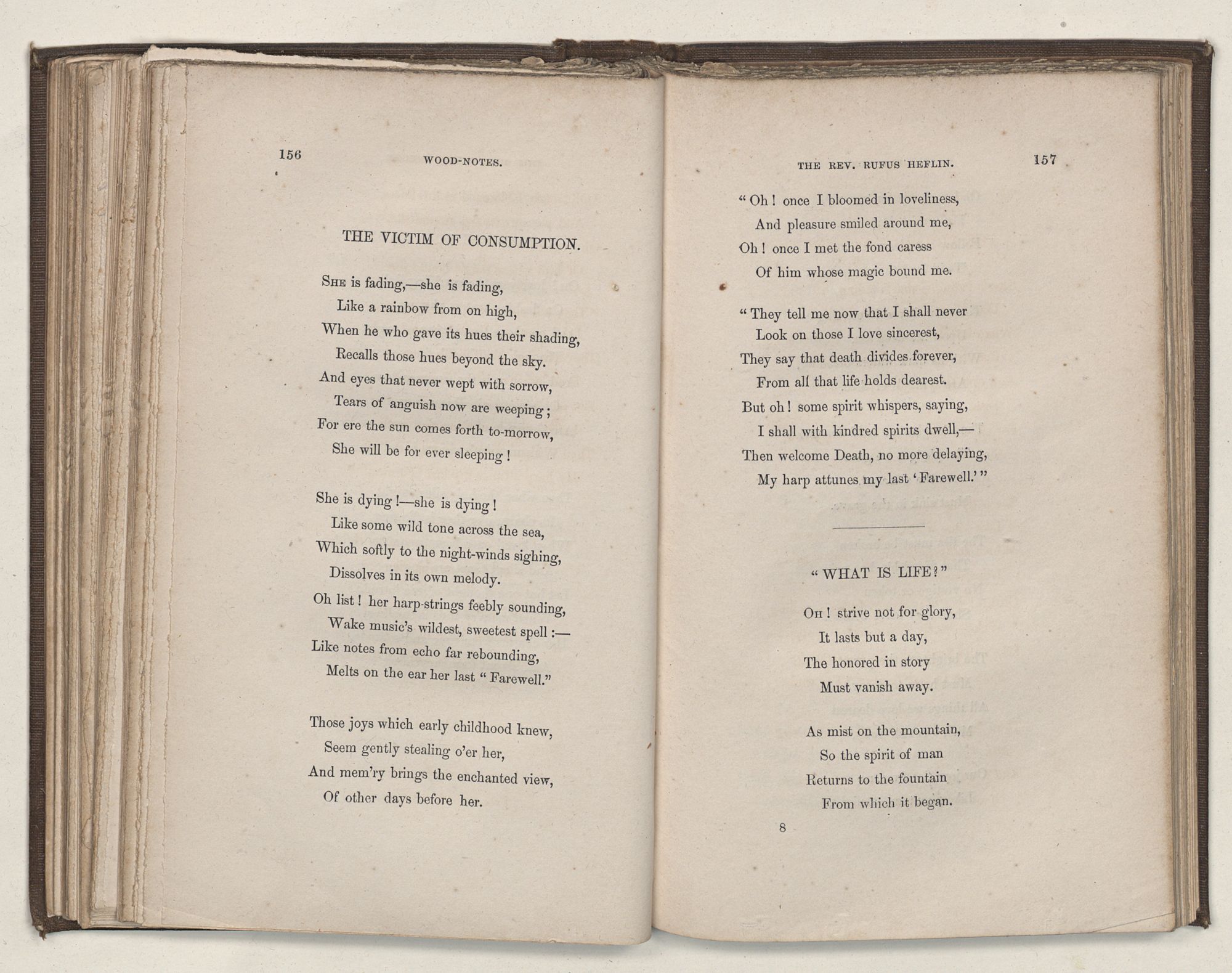 SHE is fading,—she is fading,Like a rainbow from on high,When he who gave its hues their shading,Recalls those hues beyond the sky.And eyes that never wept with sorrow,Tears of anguish now are weeping;For ere the sun comes forth to-morrow,She will be for ever sleeping!She is dying!—she is dying!Like some wild tone across the sea,Which softly to the night-winds sighing,Dissolves in its own melody.Oh list! her harp-strings feebly sounding,Wake music's wildest, sweetest spell:—Like notes from echo far rebounding,Melts on the ear her last “Farewell.”Those joys which early childhood knew,Seem gently stealing o'er her,And mem'ry brings the enchanted view,Of other days before her.“Oh! once I bloomed in loveliness,And pleasure smiled around me,Oh! once I met the fond caressOf him whose magic bound me.“They tell me now that I shall neverLook on those I love sincerest,They say that death divides forever,From all that life holds dearest.But oh! some spirit whispers, saying,I shall with kindred spirits dwell,—Then welcome Death, no more delaying,My harp attunes my last ‘Farewell.’ ”“WHAT IS LIFE?”